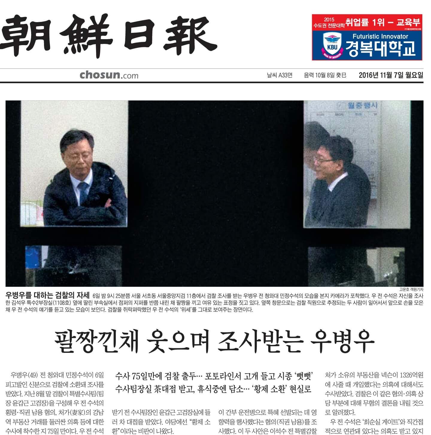 오퓨런스 빌딩 옥상엔 망원경처럼 길게 뻗친 카메라 렌즈가 서울중앙지검 11층을 향했다. 정신없이 누른 셔터에 담긴 건, 고운호(29) 기자가 찍은 검사 앞에 팔짱낀 우병우다. ‘팔짱 우병우’라기에 짧은 제목을, 2016년 11월 7일자 1면에 이렇게 담았다.