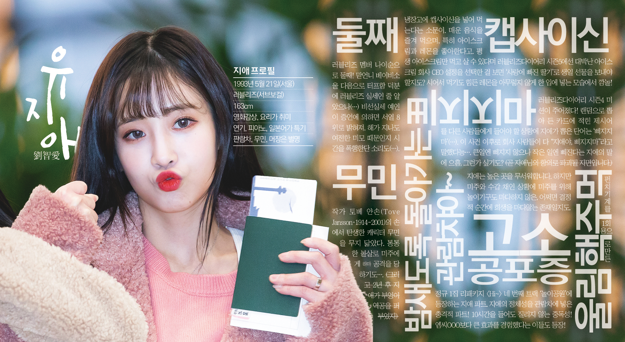 러블리즈다이어리 시즌4 미션이 주어졌다! 랜덤으로 뽑아 든 카드에 적힌 제시어를 다른 사람들에게 들어야 할 상황에 지애가 뽑은 단어는 ‘삐지지마’(…). 이 사건 이후로 회사 사람들이 다 “지애야, 삐지지마”라고 말했다능…. 큰일엔 삐지지 않으나 작은 일엔 삐진다는 지애의 말에 으흠, 그런가 싶기도? (곧 지애님의 항의로 인해 삭제될 지면입니다.)