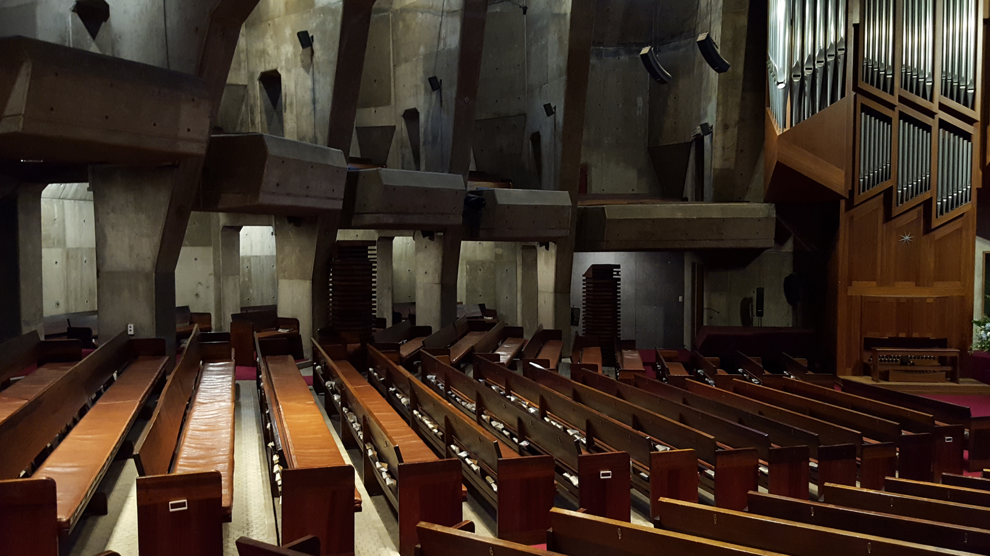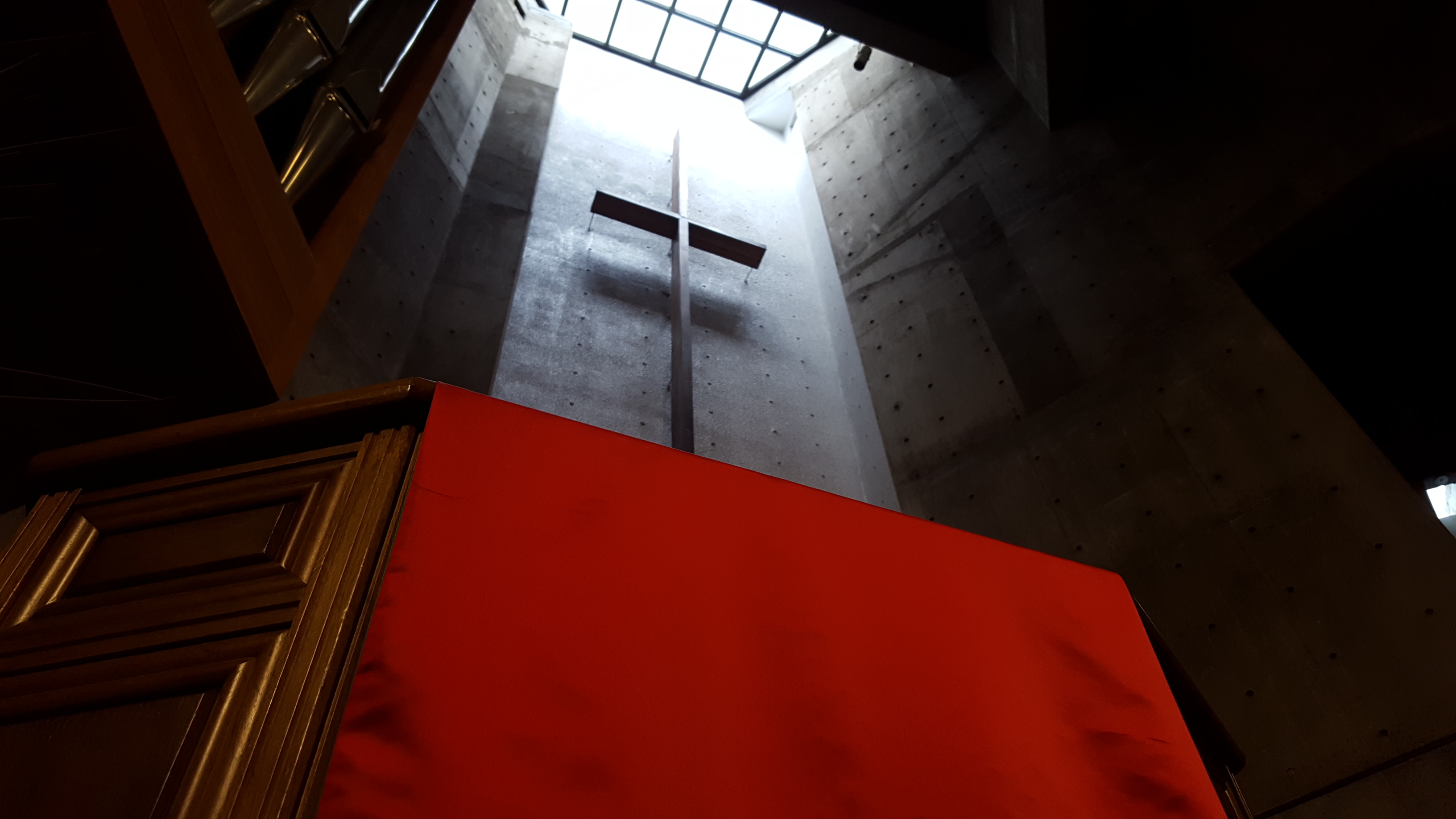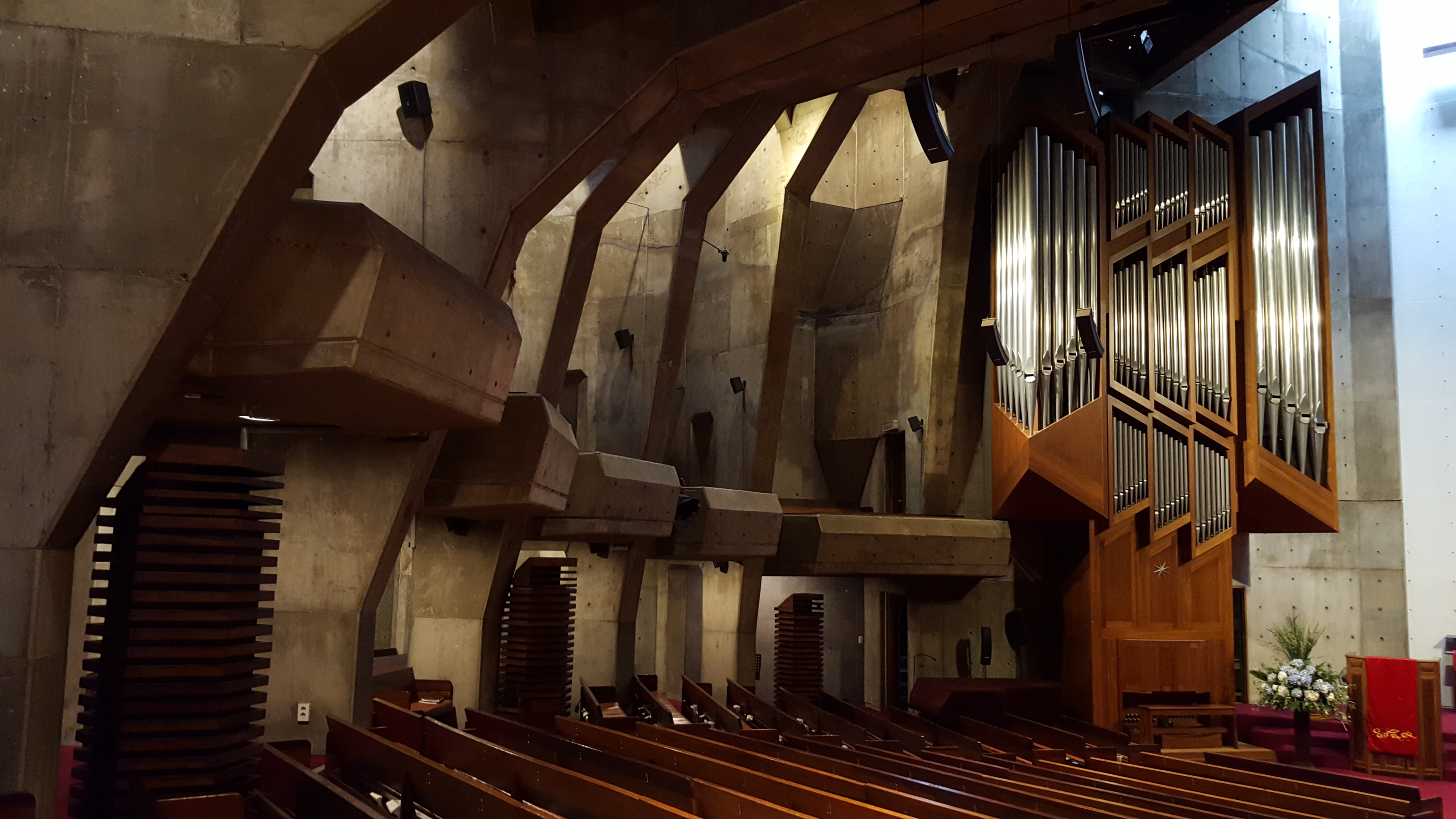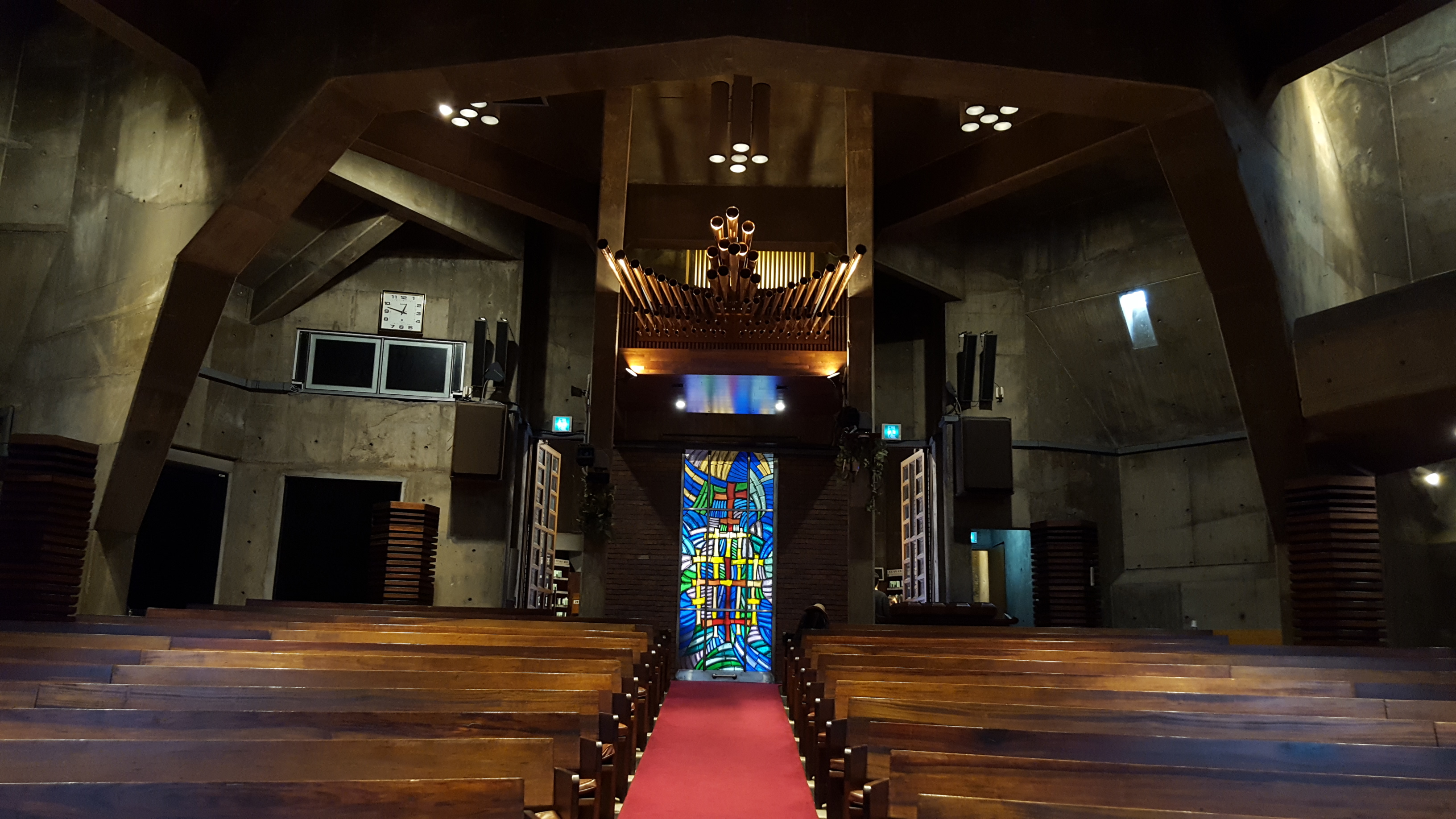 정문에서 바로 보이는 출입문이 잠겨 오른쪽 계단, 골고다 언덕길을 올라 비로소 출입문을 찾았다. 빙 돌아 언덕을 향해야만 입장하도록 설계한 것이다. 알다시피 1981년 김수근 건축가가 설계했다. 겉으로 봤을 땐 기도하는 손을 닮은 듯, 건물로 들어서니 적막감 속에 주일 예배를 기다리는 교인으로 고요했다.