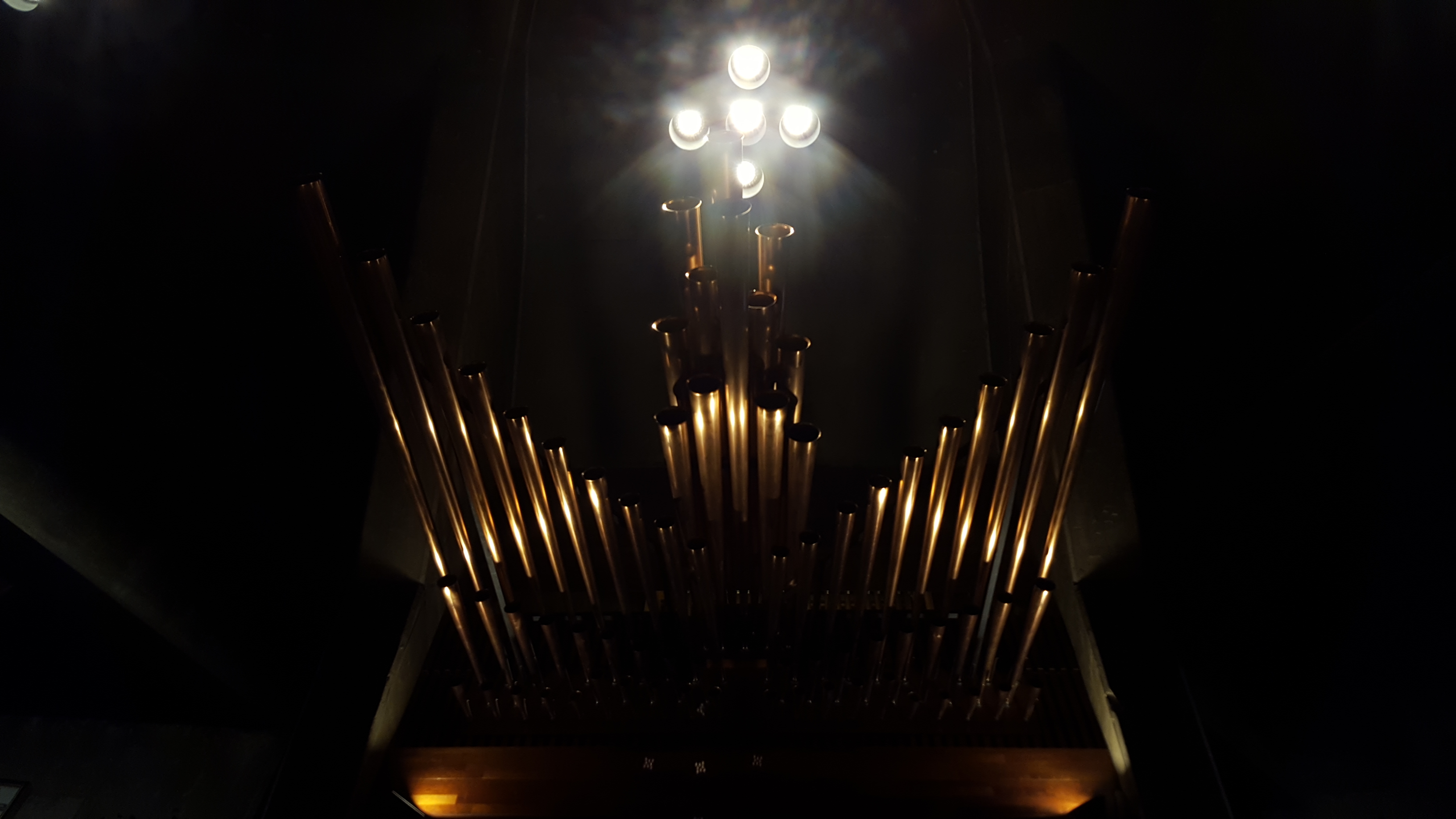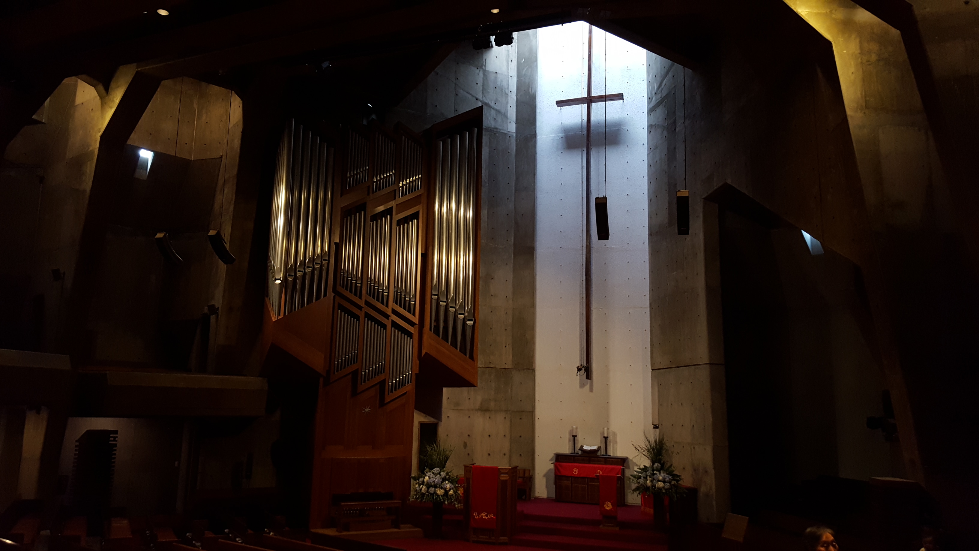과다하지 않은 조명 카페처럼 모든 조명을 환하게, 과하지 않게 배치해 파이프오르간이 적절히 돋보였다. 중앙에 위치한 십자가가 세워진 스테인드글라스 뒤로 출구로 향하면 교인들은 세상으로 파송된다.
