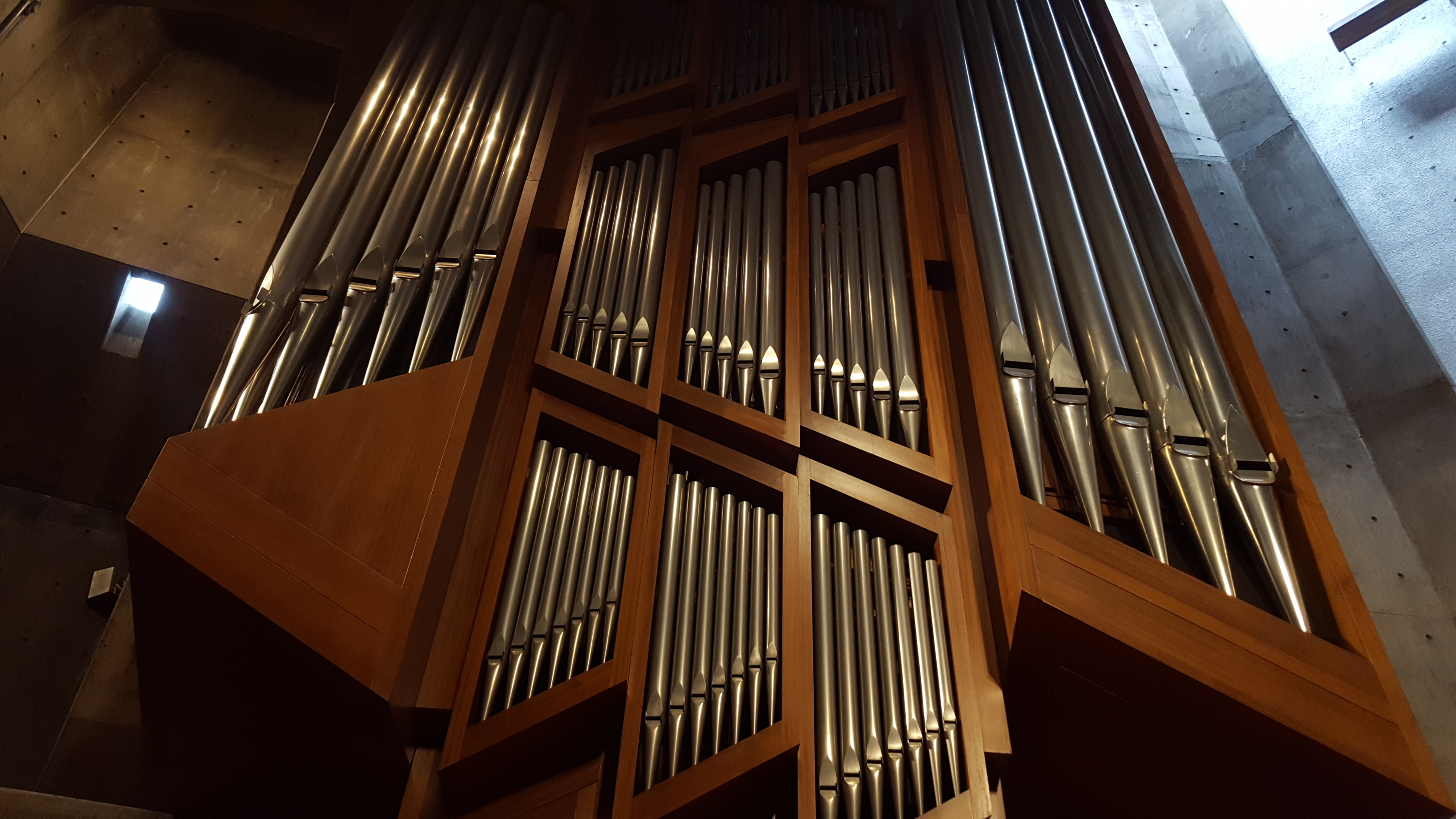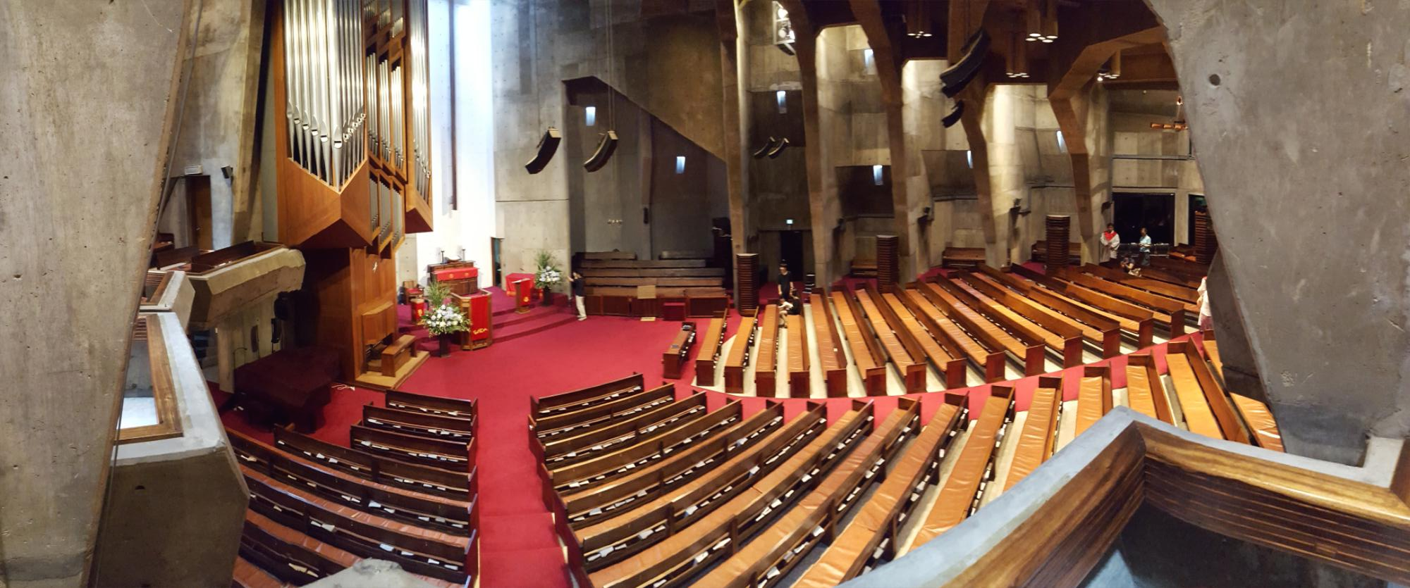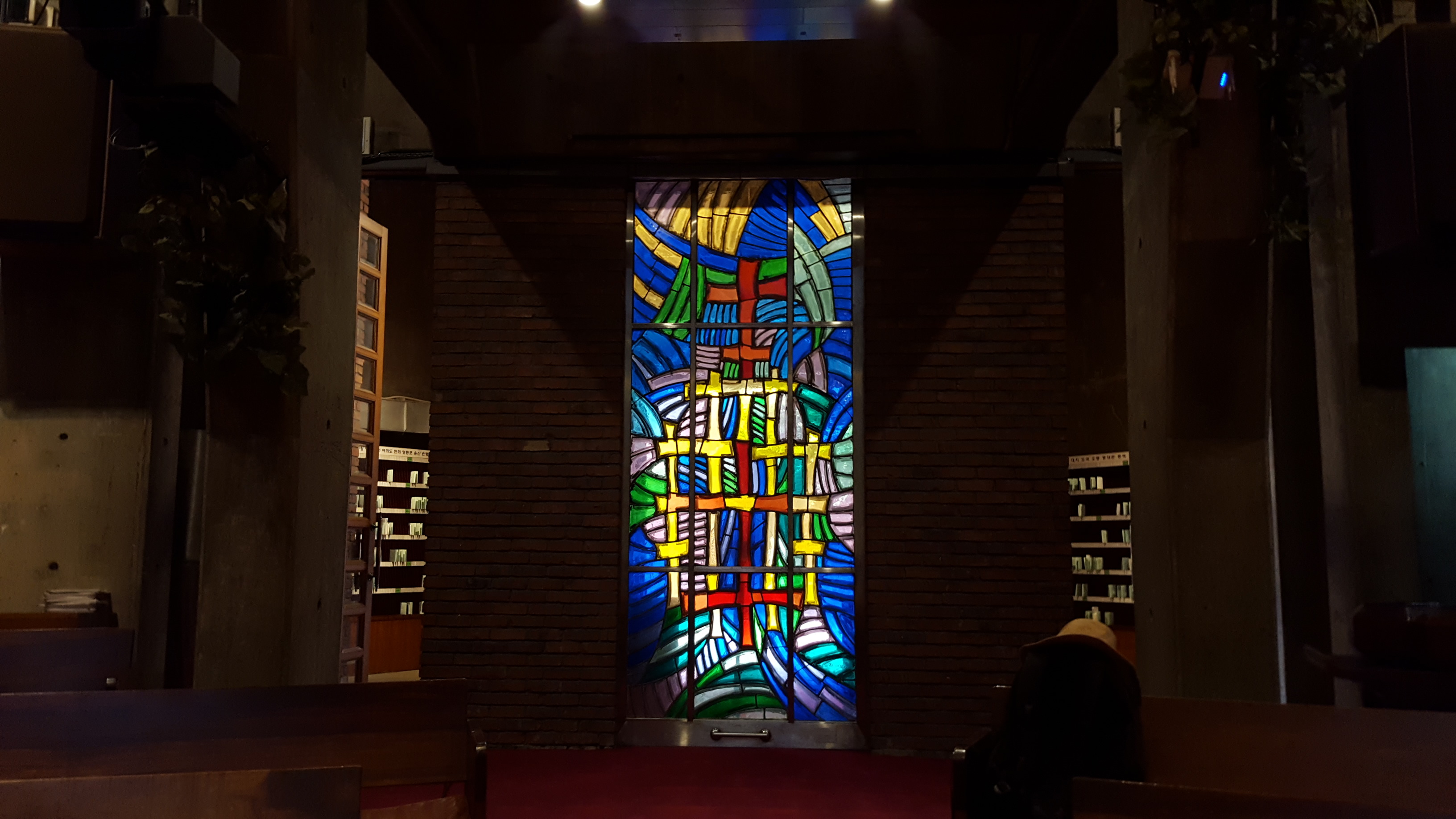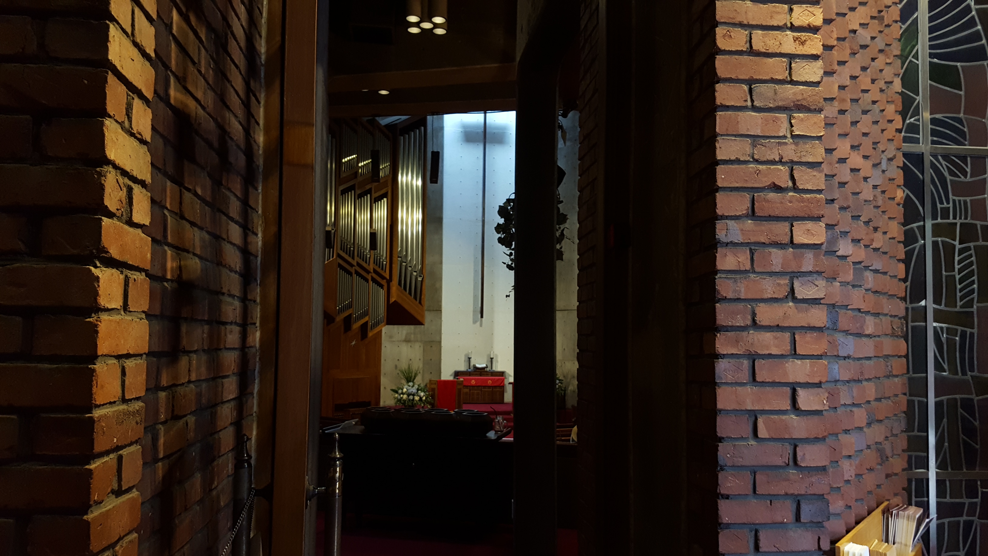 과다하지 않은 조명 카페처럼 모든 조명을 환하게, 과하지 않게 배치해 파이프오르간이 적절히 돋보였다. 중앙에 위치한 십자가가 세워진 스테인드글라스 뒤로 출구로 향하면 교인들은 세상으로 파송된다.