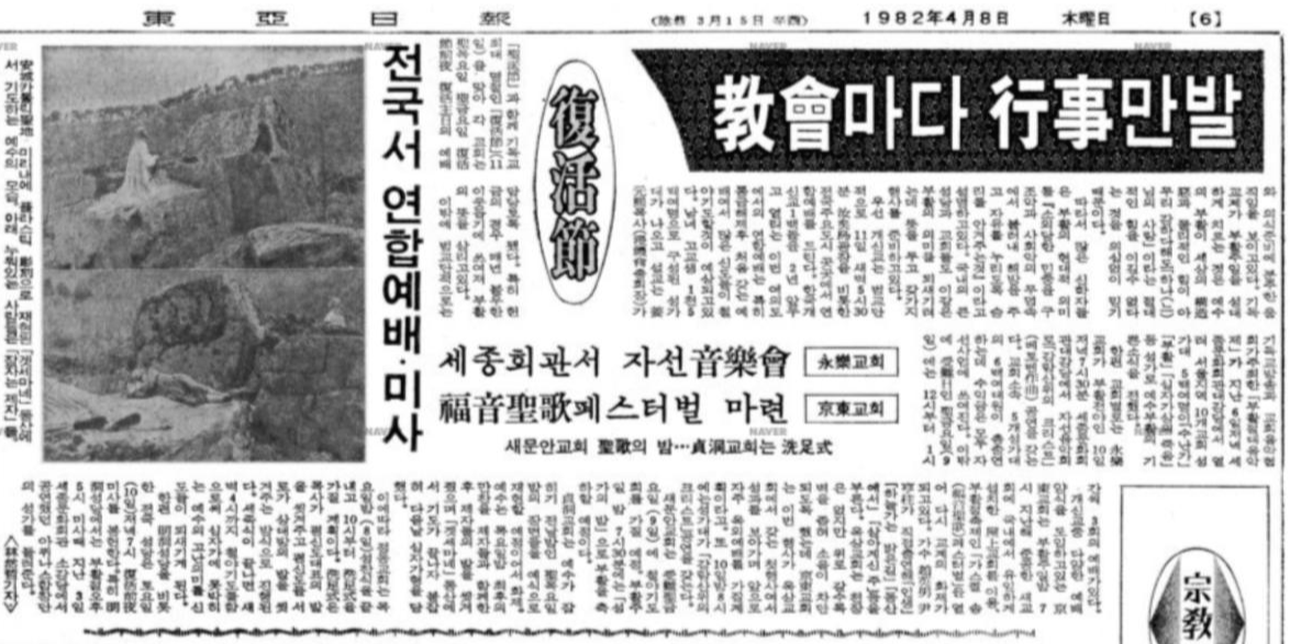경동교회 부활절 예배 기사 동아일보는 1982년 4월 8일 경동교회 옥상에서 ‘가스펠 송 페스티벌’을 개최한다는 소식을 보도했다. 가수 조영남, 윤형주가 출연해 찬송을 부를 예정임을 밝혔다. 당시 경동교회 옥상에선 이 같은 행사를 벌였다. 서울 시내 한복판, 교회 옥상에서의 행사라니.