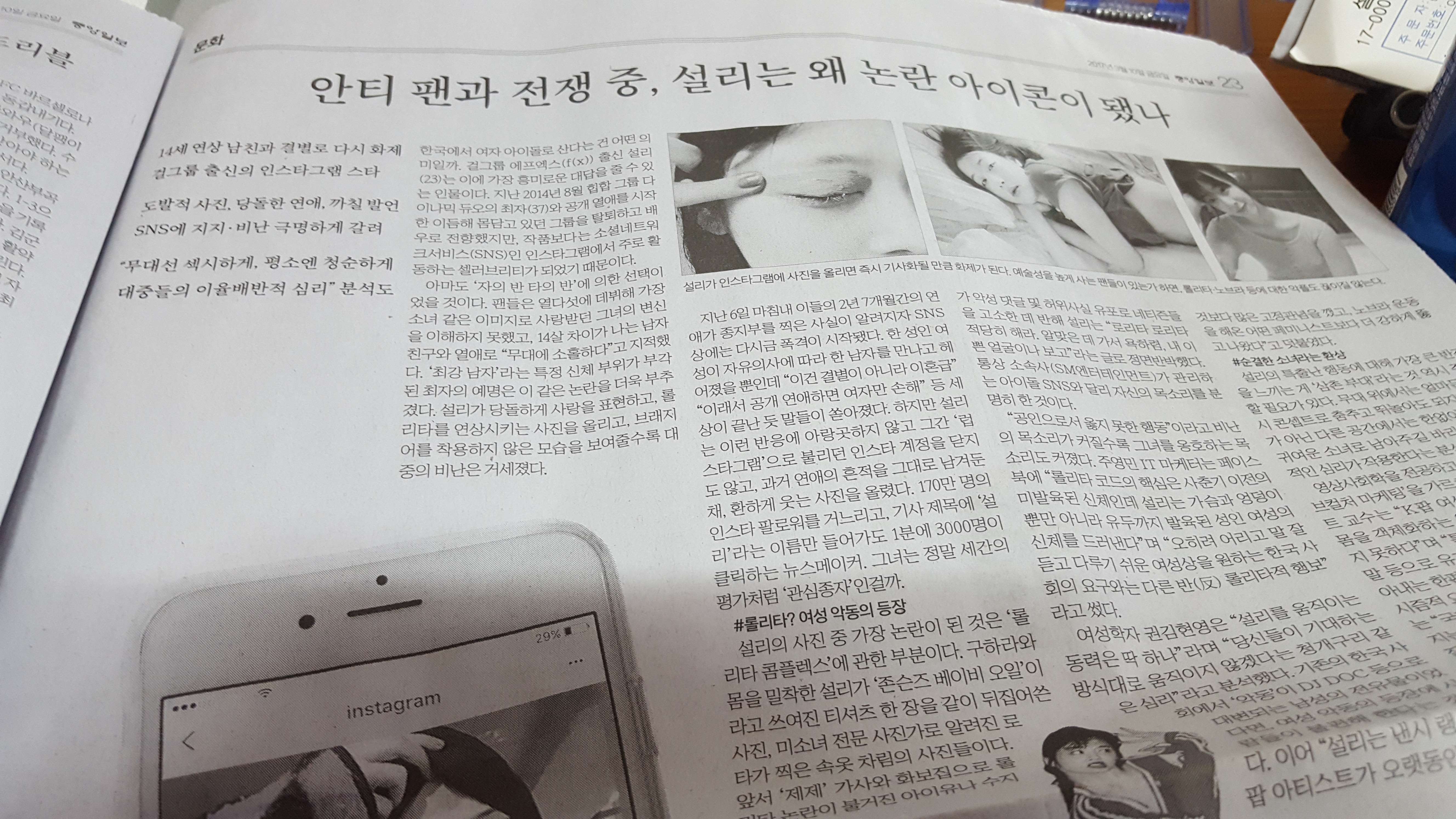 걸그룹을 알기도 훨씬 전이었다. 지면 신문에 실린 모습을 바라보니 흐뭇했던 이유엔 ‘세상엔 이런 사람도 있구나’를 느꼈기 때문이다. 여성이라면 조신해야 할 것 아닌가, 아이돌이면 자중해야 할 것 아닌가, 공인이라면 적당히 할 것 아닌가. 말하는 사람들을 향해 과감히 자신을 내어 던진 모습에 저항하는 여자로 보였다. 응원해 마지않은 시점도 그 때였다. 독실한 기독교인이자 신학을 전공으로 두고 있음에도 후배들이 “왜 좋아하냐”고 물을 때 나는 말로 표현하지 못할 감정을 이 기사로 보였다. 기사에는 그의 감은 눈, 그의 옆구리, 그의 가벼운 옷차림이 담겨 있었다. ‘왜 논란의 아이콘이 됐나’ 질문은 보이지 않았고 여성이자 혼자로 남아 ‘세상을 등지고 맞선 자’만이 보였다. 걸그룹이었을 땐, 느껴지지 못한. 개인으로, 단독자로 남아서자 비로소 그가 보이기 시작한 것이다. 세상이 논란의 손가락을 짚고 있던 그 때.