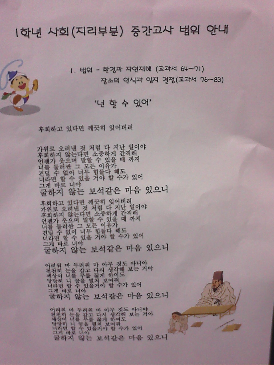 그 때도 촌스럽다고 생각했었다. 아래아 한글에서 지원하는 기본 클립아트를 이용해 하나하나 붙였을 모습을 생각하니, 그 노고를 상상하며 그 때도 웃었던 것 같다. 벌리지 않은 자간이 노랫말을 줄글로 만들었고 반복되는 어구에 큰 글꼴로 넣어 촌스러움이 더욱 묻어났다.