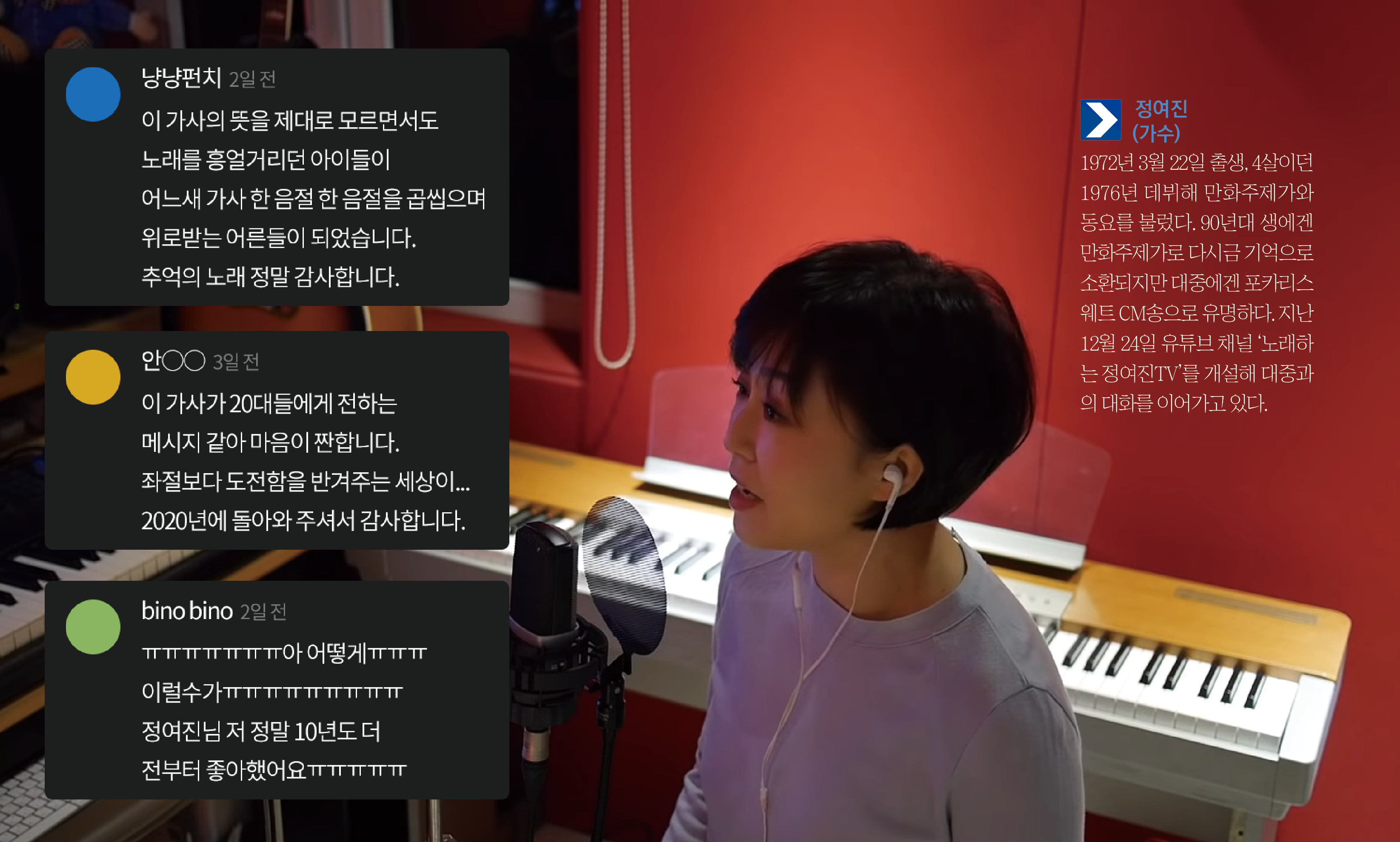 가수 정여진 씨가 과거 만화주제곡을 부르고 있다. 해당 영상은 미소의 세상 엔딩 ‘그래 그래’로 정 씨는 댓글에 많이 올려준 ‘그래 그래’로 바꿔 작업하느라 곡 소개가 늦어졌다고 밝혔다. 동생 TULA의 채널도 소개했다. 배경은 ⓒ노래하는 정여진TV