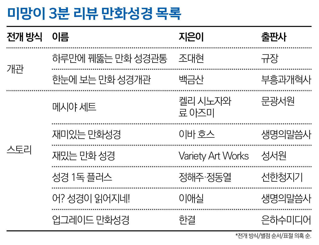 출판 중인 모든 만화 성경을 미망이가 읽어본 건 아니에요. 기껏해야 여덟 권을 읽었지만 이 여덟 권은 인기 없는 책이 아니라 포털 사이트 기준으로 가장 많이 팔린 책을 꼽아서 읽어 봤어요. 그리고 내린 결론은 하나였어요.