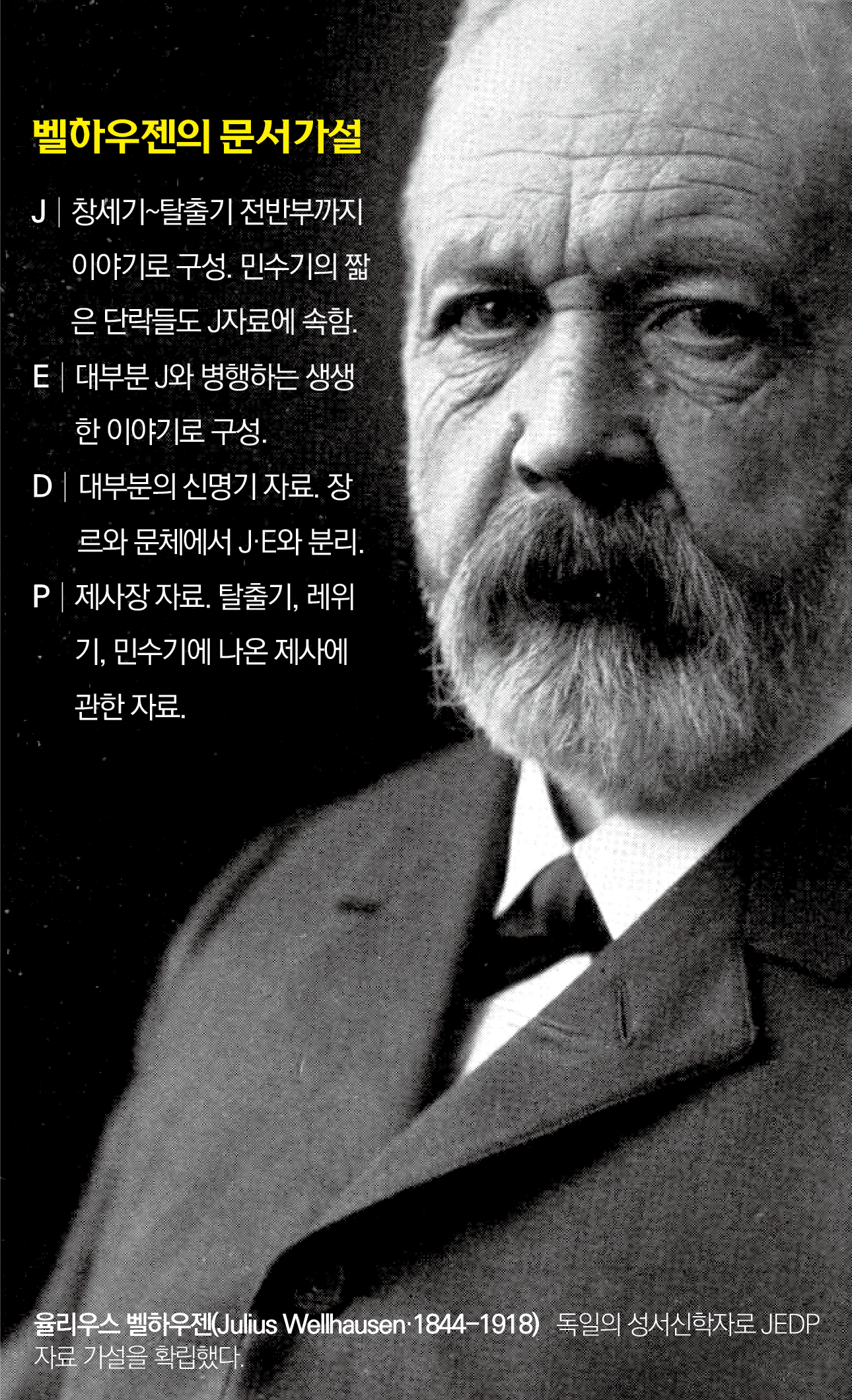 벨하우젠(Wellhausen)은 성서를 유심히 살피다 네 개의 자료로 분류했다. 주로 신명(神名)에 따라 J자료(Jehovah)와 E자료(Elohim)를. 율법에 관한 일련의 설교를 다룬 D자료(Deuteronomy). 제사장이 관심을 가졌을 만한 문제인 P자료(Pristly).