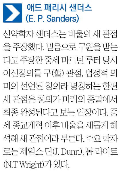 종교개혁시기 로마 가톨릭을 1세기 유대교와 일치시켜 율법주의라고 비판해야 했다. 샌더스는 그 비판이 지금까지 이르렀다고 봤다. 그러나 바울은 율법과의 단절을 요구해야 했다. 율법이 틀렸기 때문이 아니다. 그리스도만이 구원의 길이라고 믿었기 때문이다. 율법을 어긴다고 해서 구원의 길에서 떨어져 나가는 건 아니다. 제사가 존재하기 때문이다. 율법은 죄에서의 회복을 다루기에 율법을 구원 보상 체계로 봐서는 곤란한 것이다.