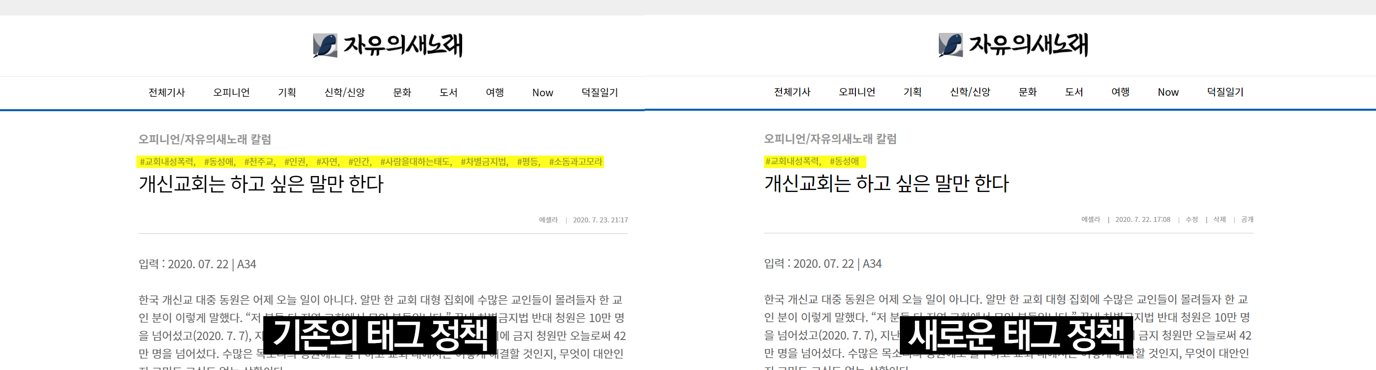 본지는 하단에 위치해 별 의미를 가지지 않았던 태그를 상단으로 끌어올려 제목 위에 배치함으로써 해당 기사와 관련성이 있는 단어를 태그로 설정해 검색에 용이하도록 내부 CSS를 변경하였습니다. 따라서 오늘 1,206개의 기사를 전수조사하여 모든 태그를 정리했습니다. 태그는 자료 검색과 연관 기사를 찾을 때 사용할 수 있도록 다음과 같이 전면 개편하고자 합니다.