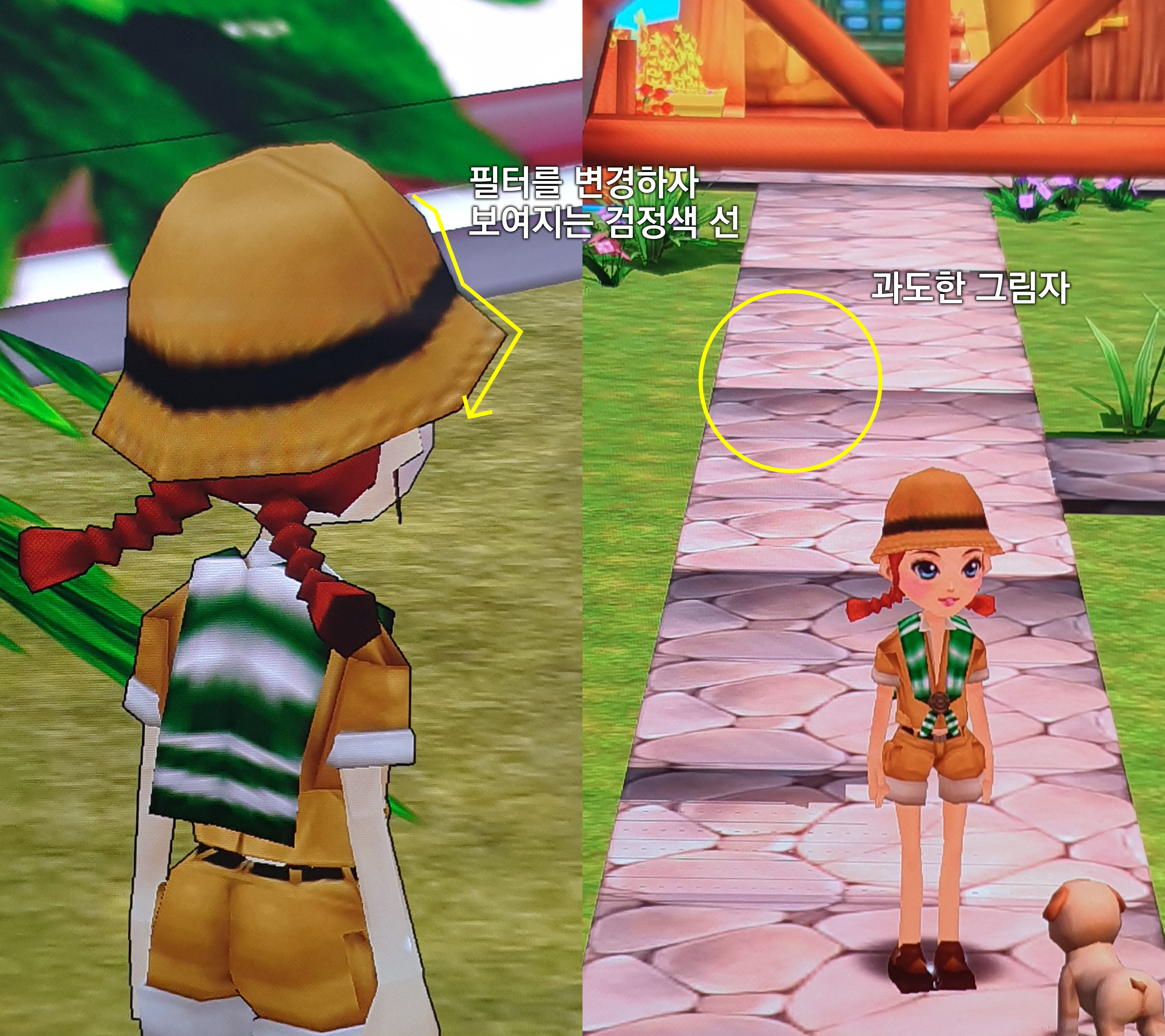 그러나 낮·밤 기능은 확인하지 못했다. 기본 필터에서 화려한 필터로 바꾸었을 때 전체적 색감이 붉어지면서 저녁노을이 비치는 장면으로 연출됐지만 조명이 필요한 수준으로 미니파크가 어두워지지 않았다. 필터와 낮·밤 기능이 분리된 것으로 보인다. 기본 필터와 달리 화려한 필터의 경우 과한 채도로 인해 미니파크가 맑게 보이지 않았다. 하지만 채도가 낮은 필터를 적용하자 캐릭터와 아이템 가장 자리에 얇은 검정색 선이 보여 캐릭터와 배경을 구분 지었고 덕분에 그래픽이 깔끔하다는 느낌을 주었다.