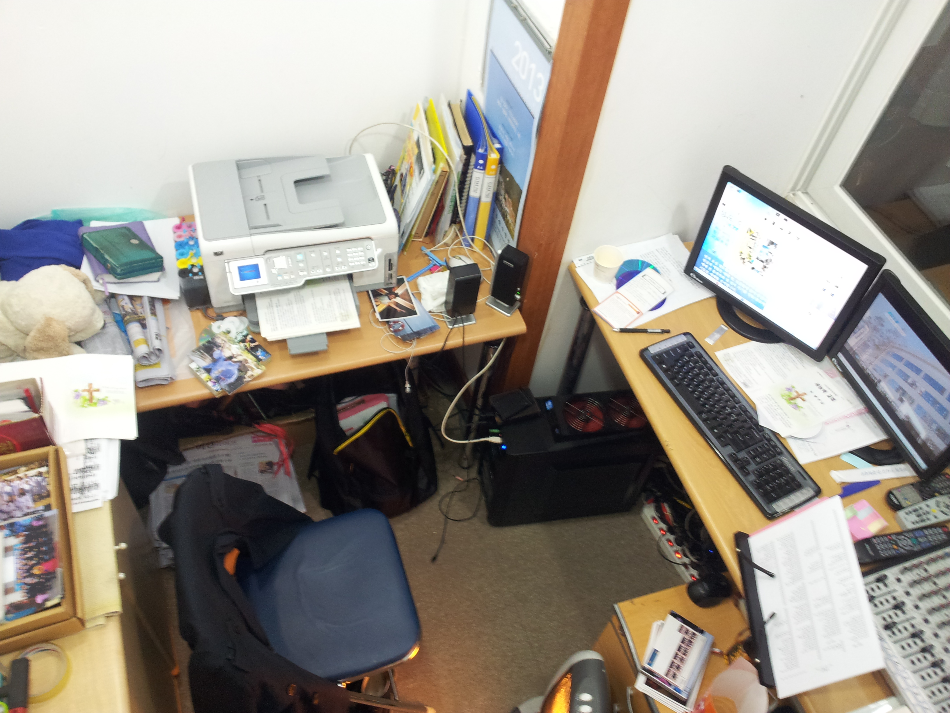 방송실 업무 강도는 어땠을까. ‘주일오전예배는 방송용으로 녹음됩니다’ 화면에서 시작한 pptx 화면은 네 줄 찬송가, 복음성가 가사를 넘어 성가대 찬송, 광고, 성경봉독, 다시 복음성가, ‘할렐루야! 한 주간도 승리하세요!’ 인사로 마쳐지면 대략 100장에서 150장 사이 완성된 하나의 프리젠테이션 자료를 발견할 수 있다. 관건은 찬송가와 복음성가, 은혜성가 자막이 얼마나 만들어졌느냐다. 개신교회는 가끔 정해진 순서대로 찬송을 진행하지 않는다. 찬송만 하더라도 불렀던 곡 또 부르고, 마음의 감동이 주어지면(아니 기독교적 표현으로 성령의 감동) 순서지에 없던 곡을 갑작스레 부르기도 한다. 그걸 대비해야 했다. 찬송가 645장, 복음성가 200여장, 은혜성가 300여장. 물론 다 만든 건 아니다. 자주 선곡하던 찬송 위주로 선별해 놓고 폴더 째 켜놓은 상태에서 예배에 돌입한다. 송출까지 맡았다면 완전한 생방송 체계였을 것이다.