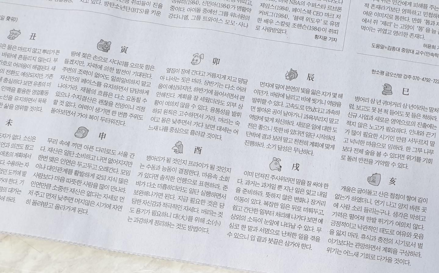비 많이 내리던 날 브런치 작가 여섯 번째 탈락에 절망하던 날 운세는 내 마음을 적셨다. “동트기 전이 가장 어두운 법” 그런 신문이 운세로 웃으라고 말했다. “어떤 값진 것보다 웃음이 소중” 용기를 가지고 끝까지 해보라고 조언도 던졌다. “한번 맡은 일 끝까지 책임을” 건강도 챙겨줬고. “충분한 쉼과 심신의 안정 중요” 때론 넓은 포부를 갖추라고도 말한다. “사소한 일에 만족하면 큰일 못해” 아직은 존재도 모를 배우자 걱정도 해주면서. “배우자에게도 할 말 안 할 말 있다” 답 없는 것들에도. “해답은 사건 속에 있음을 기억하라”