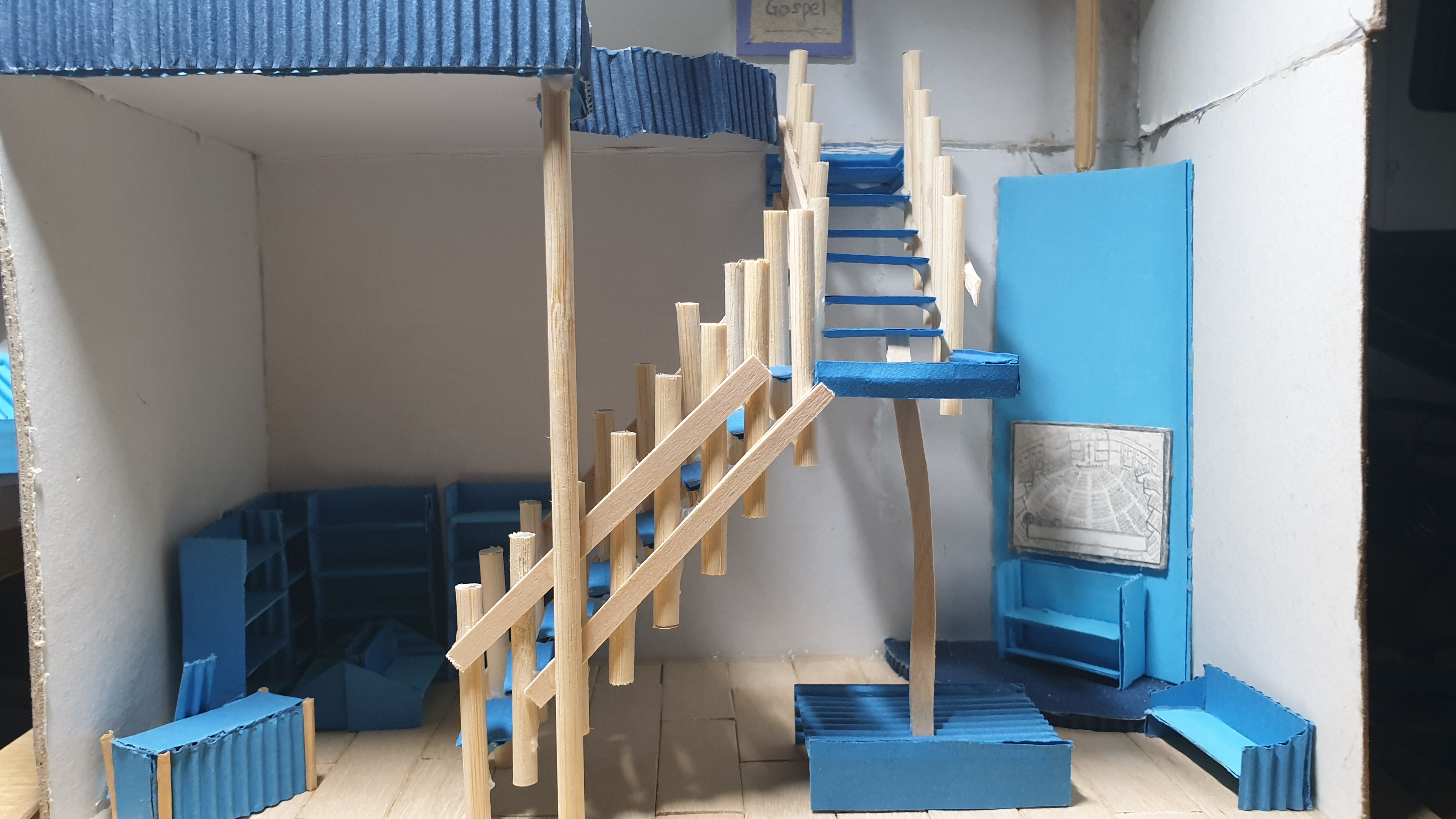 1층과 기둥에 붙일 커다란 계단은 쉬웠다. 기둥이 아니었다면 서 있기 어려웠을 것이다. 관건은 위층에 목공용 풀로 고정한 발판이다. 발판 끄트머리에 접착제를 발라 계단을 붙였고 막대로 고정했다. 1층 계단과 위층 계단을 이어줄 발판이 필요했다. 골판지는 가볍다. 순간접착제를 옆으로 바르고 셋만 세어도 그 자리에 붙는다. 덕분에 이음새까지 완벽하게 만들었다.