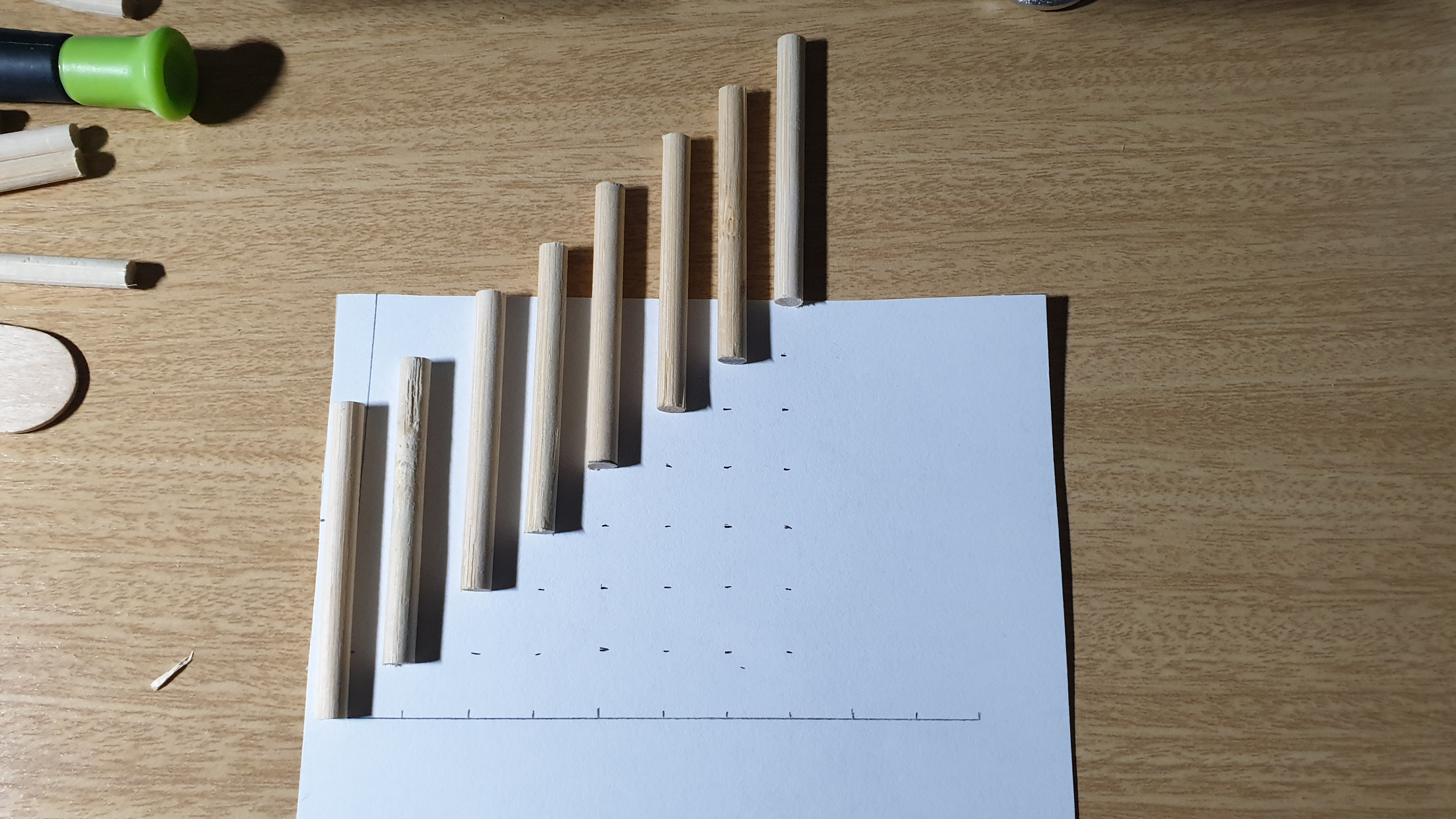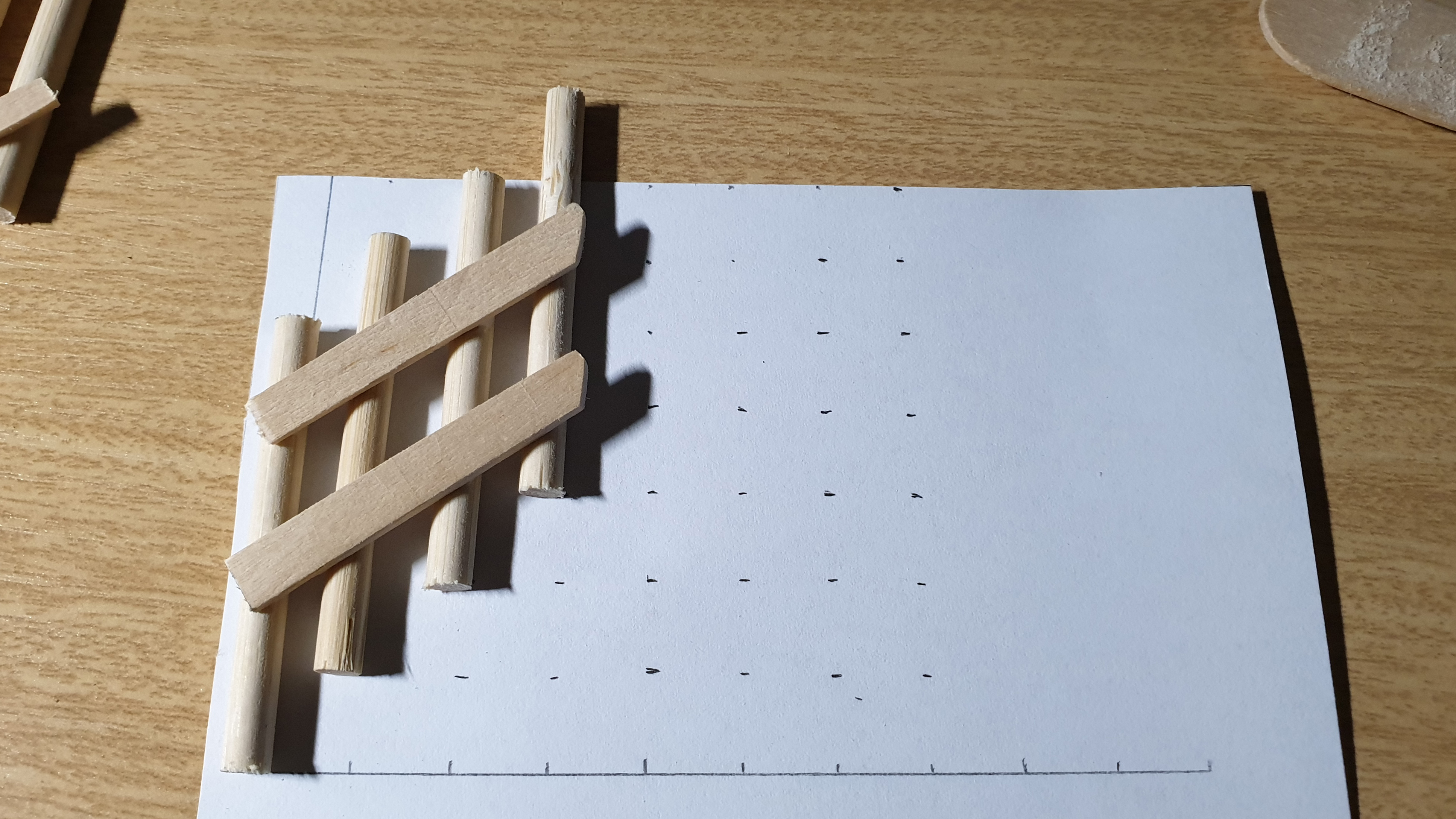 계단을 이룰 기둥은 일 센티 간격으로 일정해야 했다. 빈 용지에 자를 대어 표시하고 그 위에 잘라둔 나무 막대를 올려 두고 면적이 넓은 나무 막대로 고정했다. 일 센티 간격으로 일정하게 붙은 나무 막대까지는 좋았다. 하지만 생각대로 이뤄지지 않았다. 꼬치용 나무 막대는 둥근 기둥이라 골판지처럼 가벼운 종이조차 붙질 않았기 때문이다.