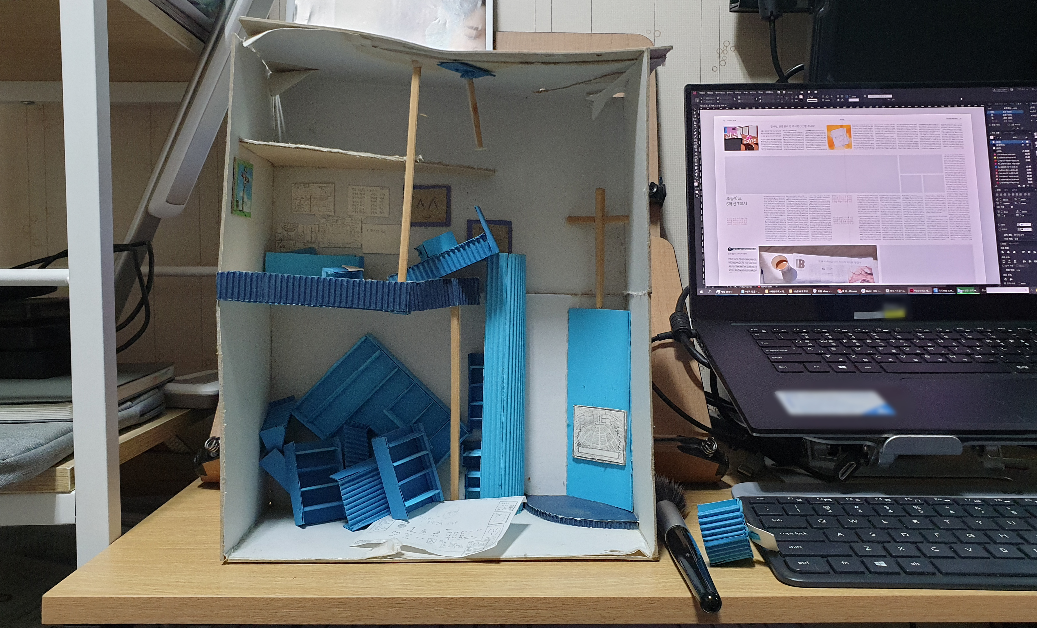 예상보다 흔쾌히 허락한 선생님 덕분에 하나의 작품이 완성되었다. 학교 축제에 전시하기 위해 전 학년이 참여한 ‘내 방 만들기’는 거대한 프로젝트였고 그 프로젝트 안에 나의 2층 방도 있었다. 코로나가 전국을 덮치며 파동처럼 밀려들었다. 쓰나미처럼 밀려든 코로나에 기억을 기억할 여력도 없이 모두가 현실로 쓸려 내려갔다.