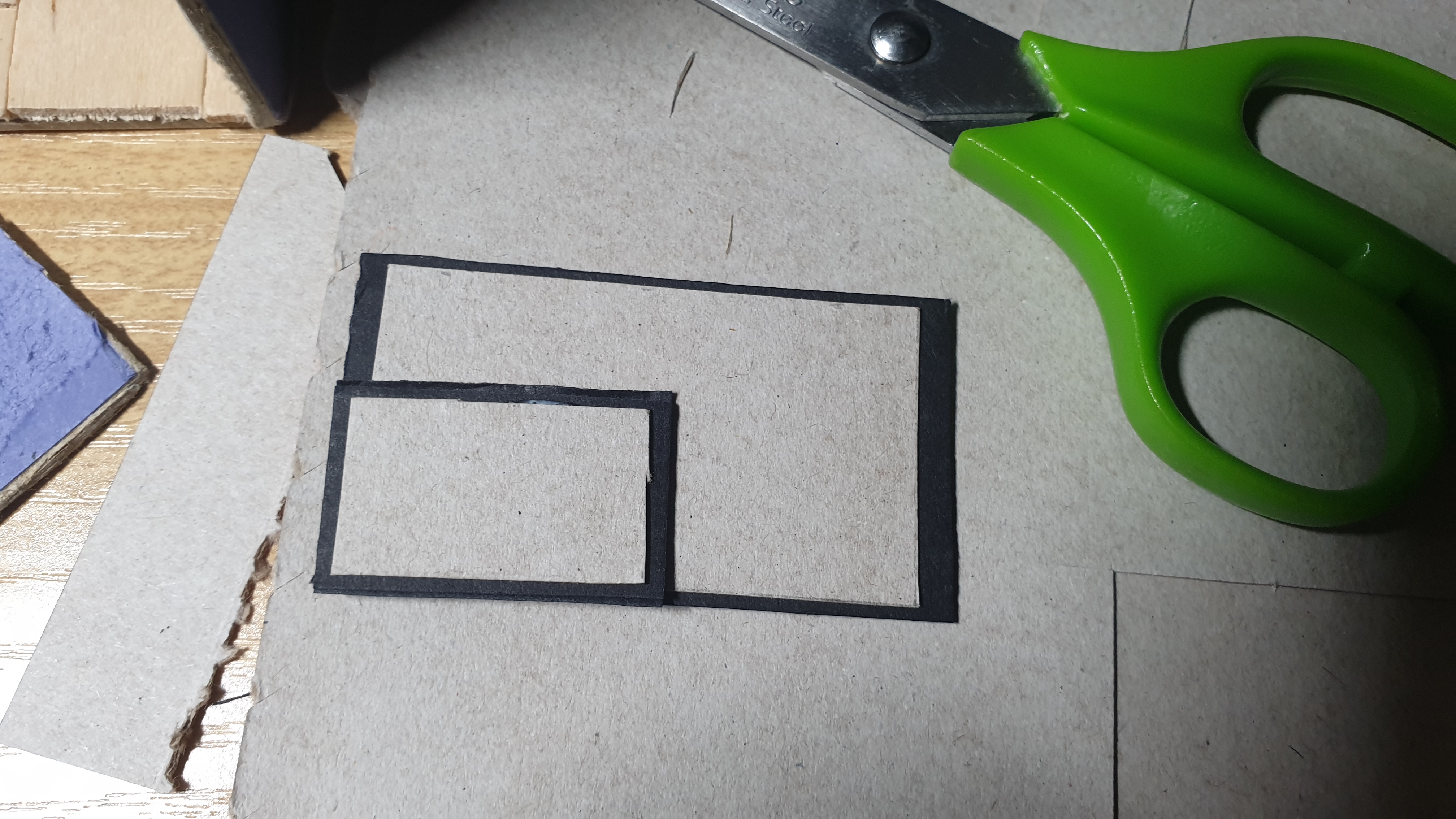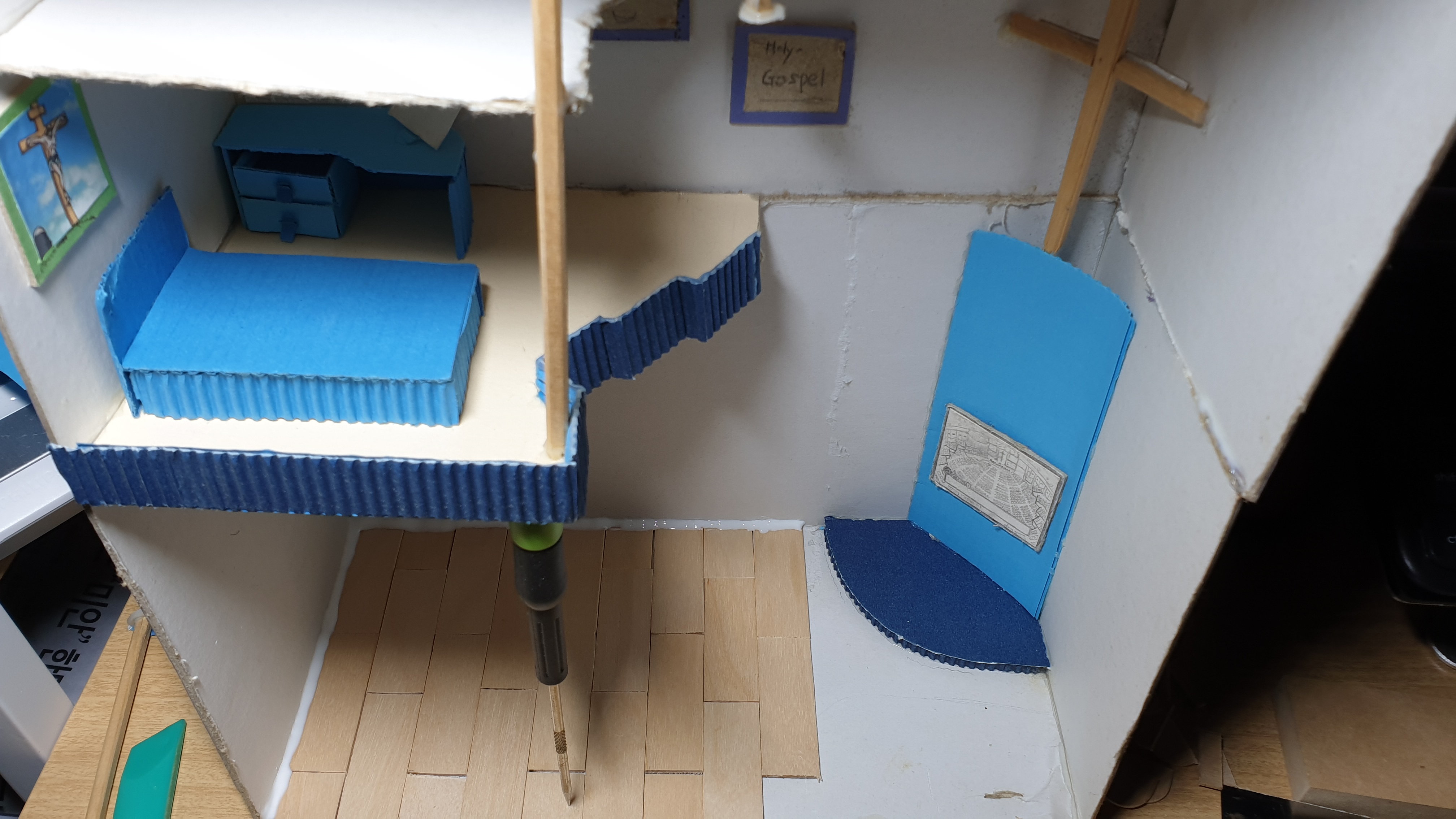 순서는 이렇다. 네 개의 널빤지를 상자처럼 붙이기. 골판지 잘라서 가구로 만들기. 텔레비전 화면은 직접 그리기. 그러나 욕심이 생겼다. 미술 선생님은 하나의 상자로 만들라고 하셨지만 두 개의 상자로 이어서 중간에 2층을 지으면 어떨까하고.