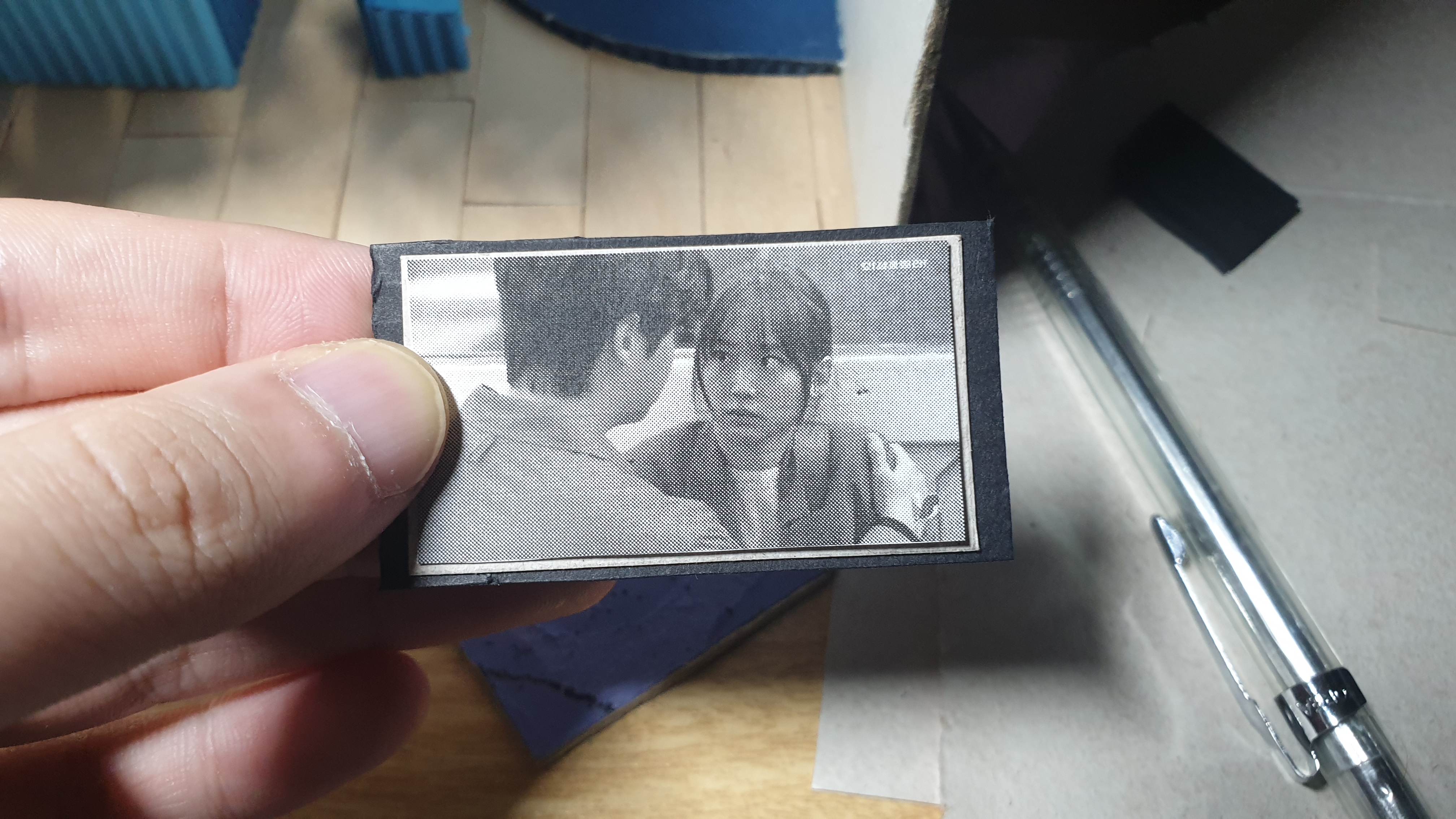 불과 1년이 지나서 프린트를 접하기 전까진 텔레비전과 빔 프로젝터 화면은 직접 그려왔다. 당시 화면은 당대 좋아하던 프로그램이 무엇인지를 드러낸다. 텔레비전보다 골판지 작품을 제작하며 라디오 듣던 시간이 많아선지 예배실황이 텔레비전으로 방영됐으면 했다. 그 의지가 그림에 담겨 있었다. 시대가 바뀐 만큼 10년 동안 같은 화면만 송출되던 프로그램도 바뀌어야 했다. 요즘 재밌게 보던 ‘오! 삼광빌라!’ 화면을 담았다. 우재희를 바라보던 이빛채운. 이 장면이면 충분했다. 빔 프로젝터 화면은 본지 디지털판인 뉴송어스닷컴 첫 페이지로 프린팅 했다.