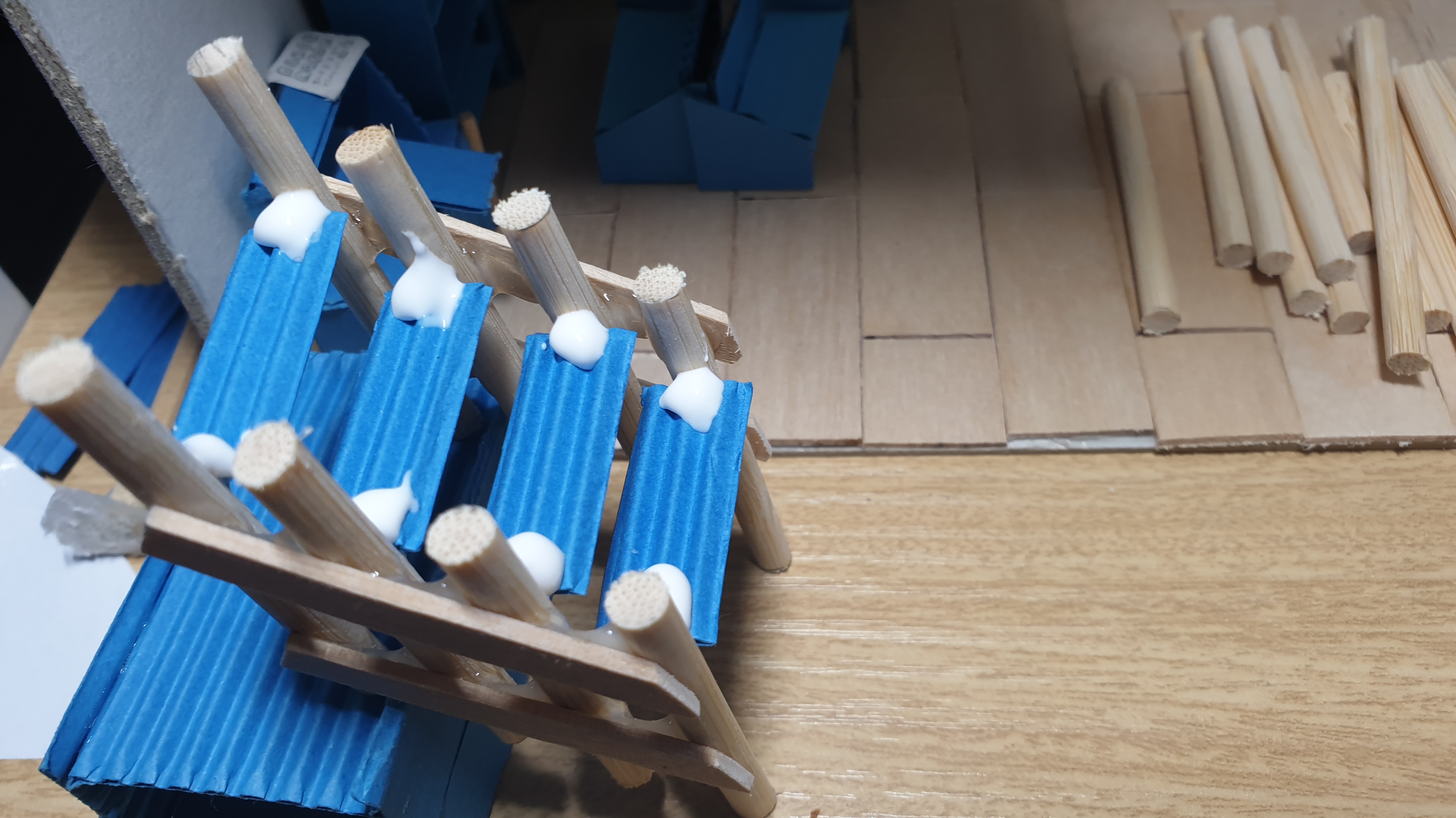 계단을 이룰 기둥은 일 센티 간격으로 일정해야 했다. 빈 용지에 자를 대어 표시하고 그 위에 잘라둔 나무 막대를 올려 두고 면적이 넓은 나무 막대로 고정했다. 일 센티 간격으로 일정하게 붙은 나무 막대까지는 좋았다. 하지만 생각대로 이뤄지지 않았다. 꼬치용 나무 막대는 둥근 기둥이라 골판지처럼 가벼운 종이조차 붙질 않았기 때문이다.