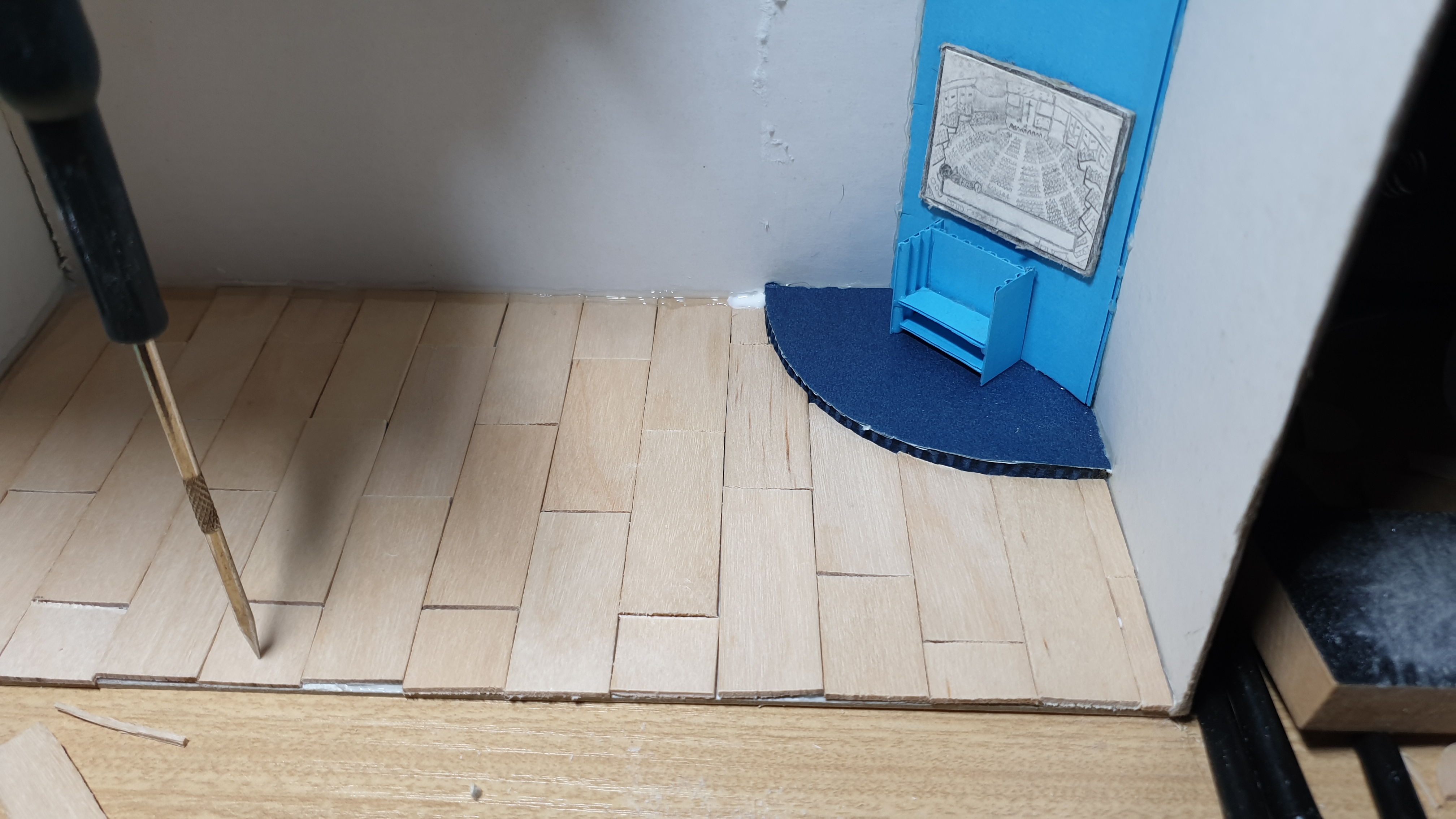 모든 가구를 빼냈다. 어떤 바닥이 어울릴지는 미리 정해뒀다. 지난 해 사둔 막내 아이스크림 나무를 꺼냈다. 바닥에 어울리는 재료다. 일자로 차례차례 붙여놓으면 밋밋했다. 하나씩 어긋나게 배치하면 그럴싸한 마룻바닥이 보인다. 적당히 5센티 자로 잰 후 샤프로 표시만 해주었다. 톱으로 켰다. 예전엔 일일이 커터 칼로 잘라댔다. 미니어처용 톱이라는 위대한 재료로 마룻바닥에 사용할 만큼 잘라두었다.