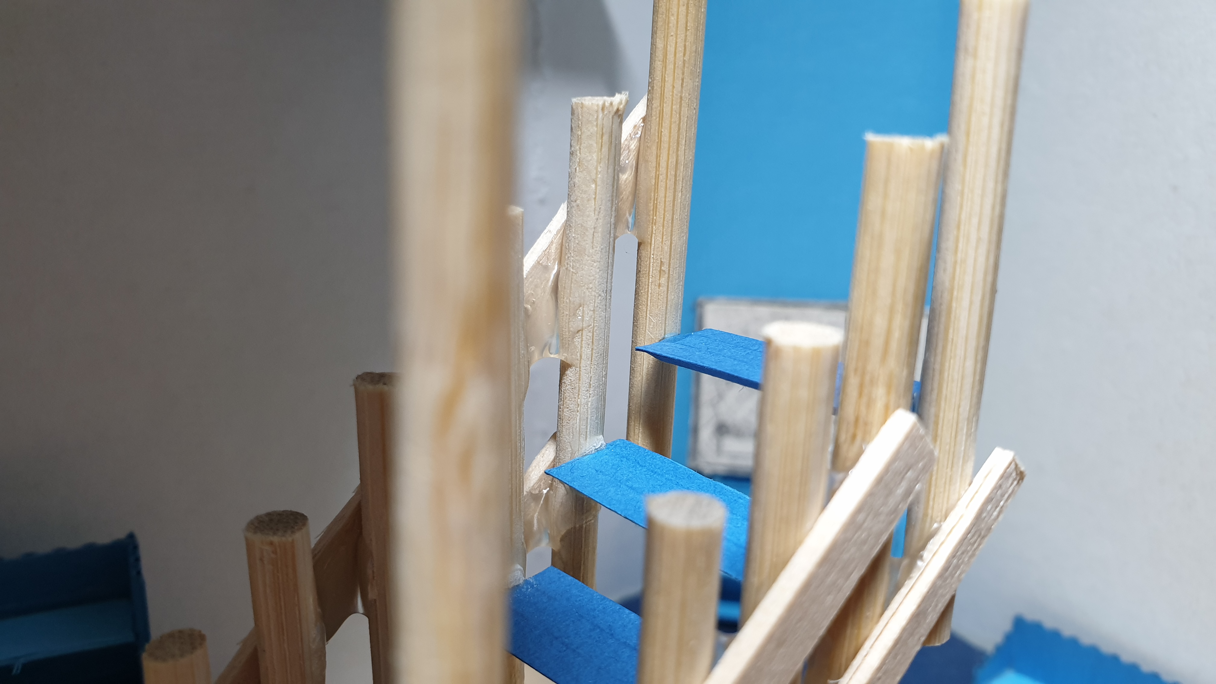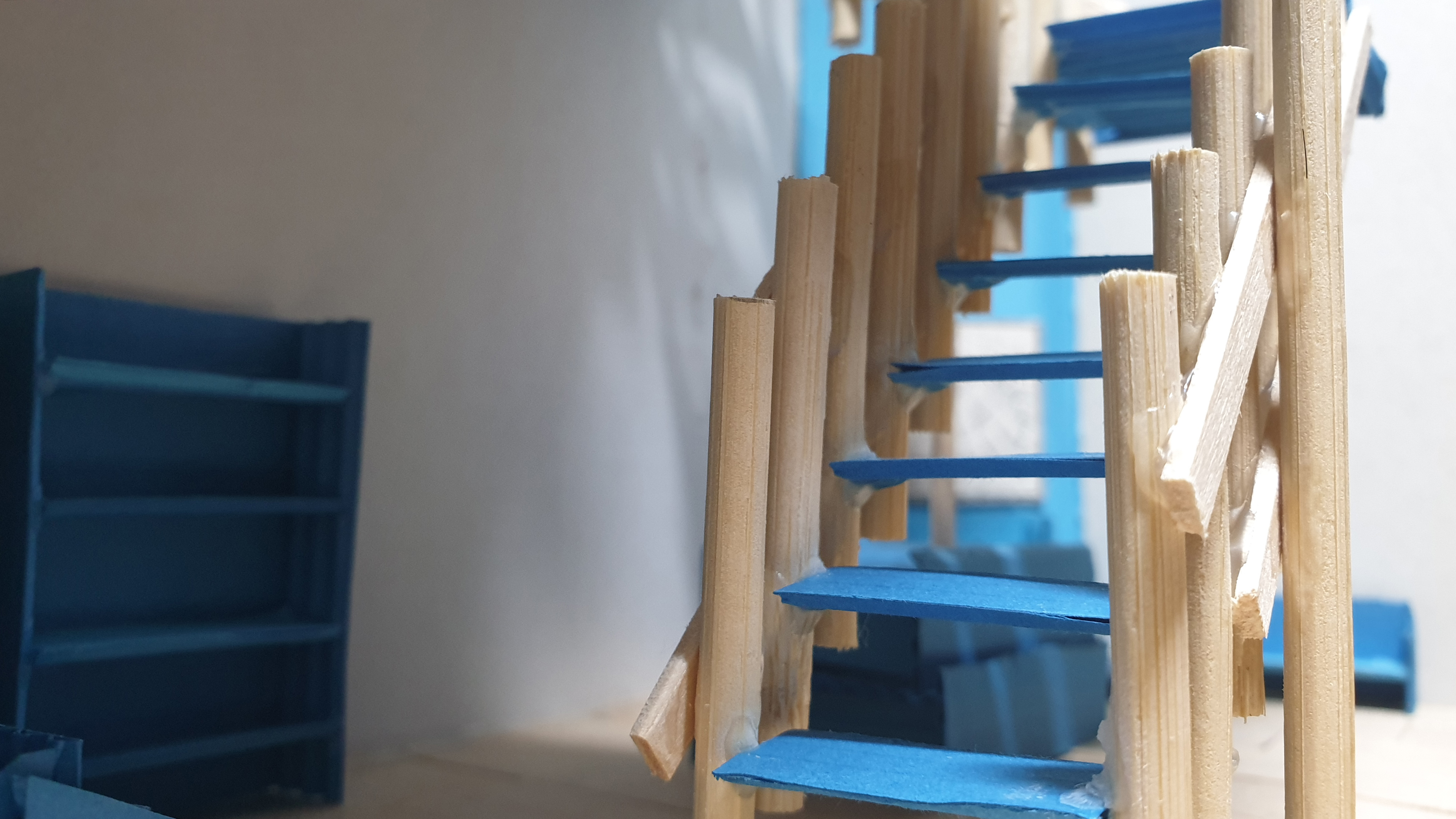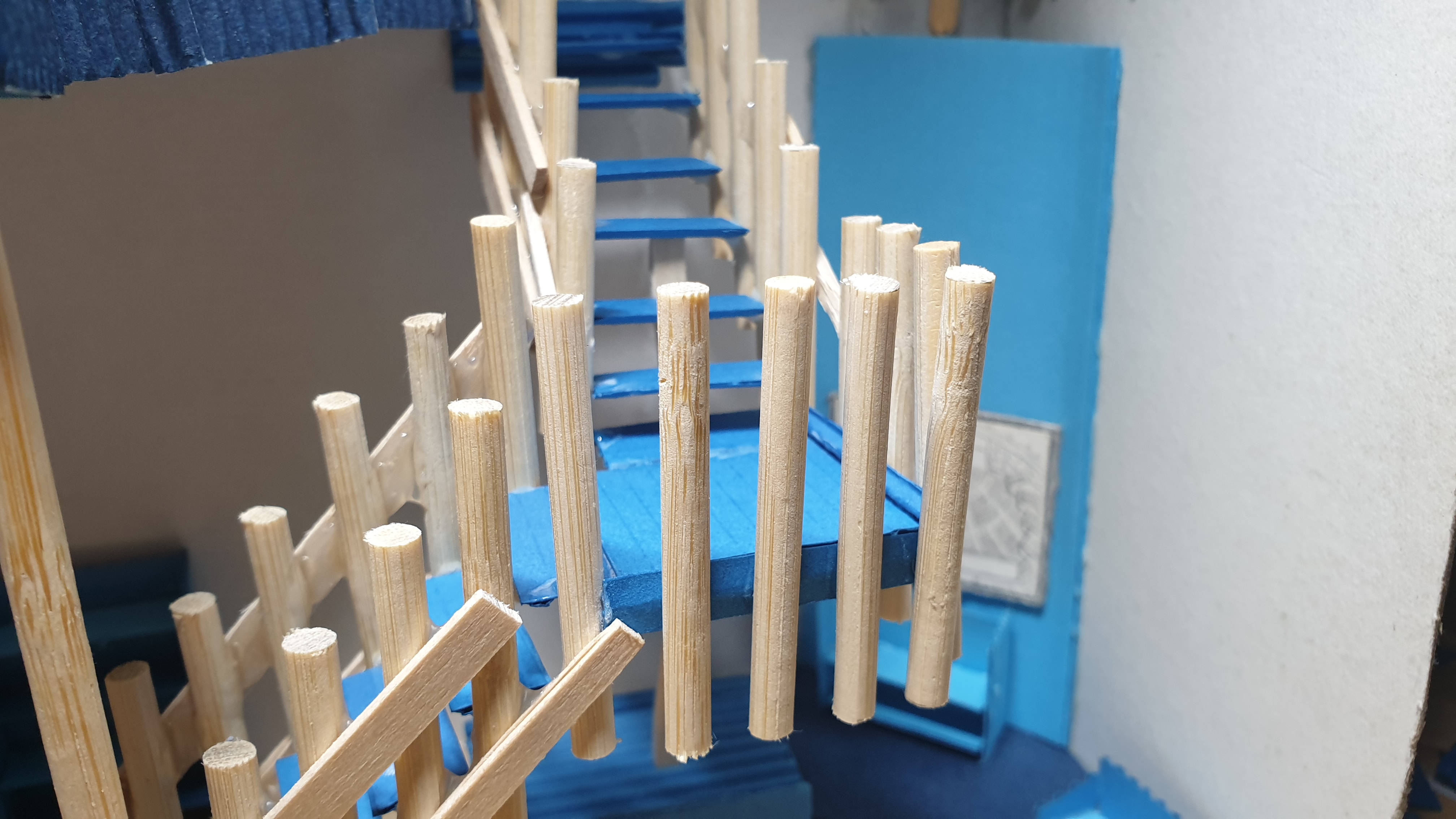 2층에서 1층으로 내려가는 계단도 순간접착제를 이용해 붙여주고 나서 기둥으로 고정해준다. 마를 때까지 주니엘 노래를 들으며 기다리자.