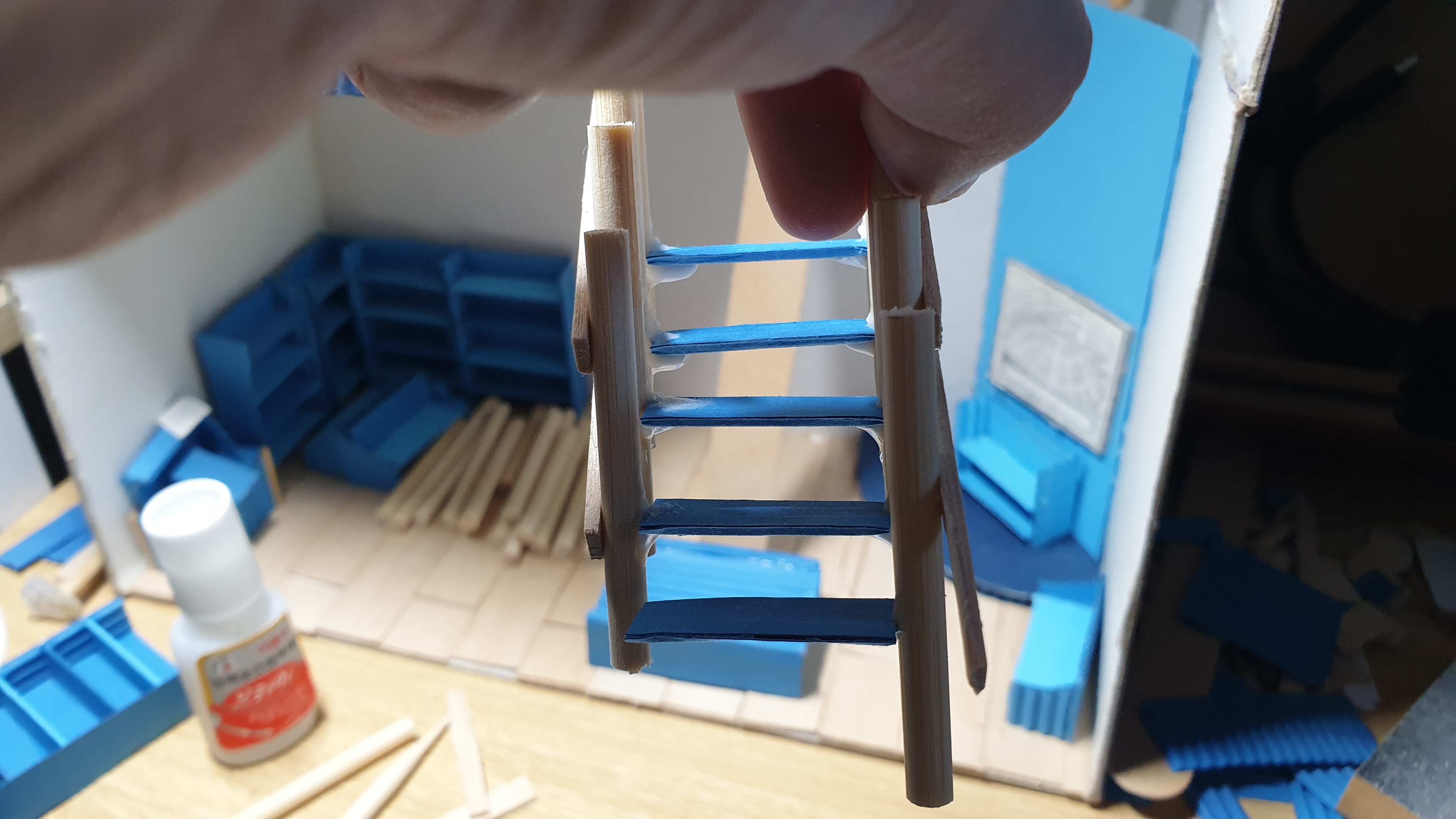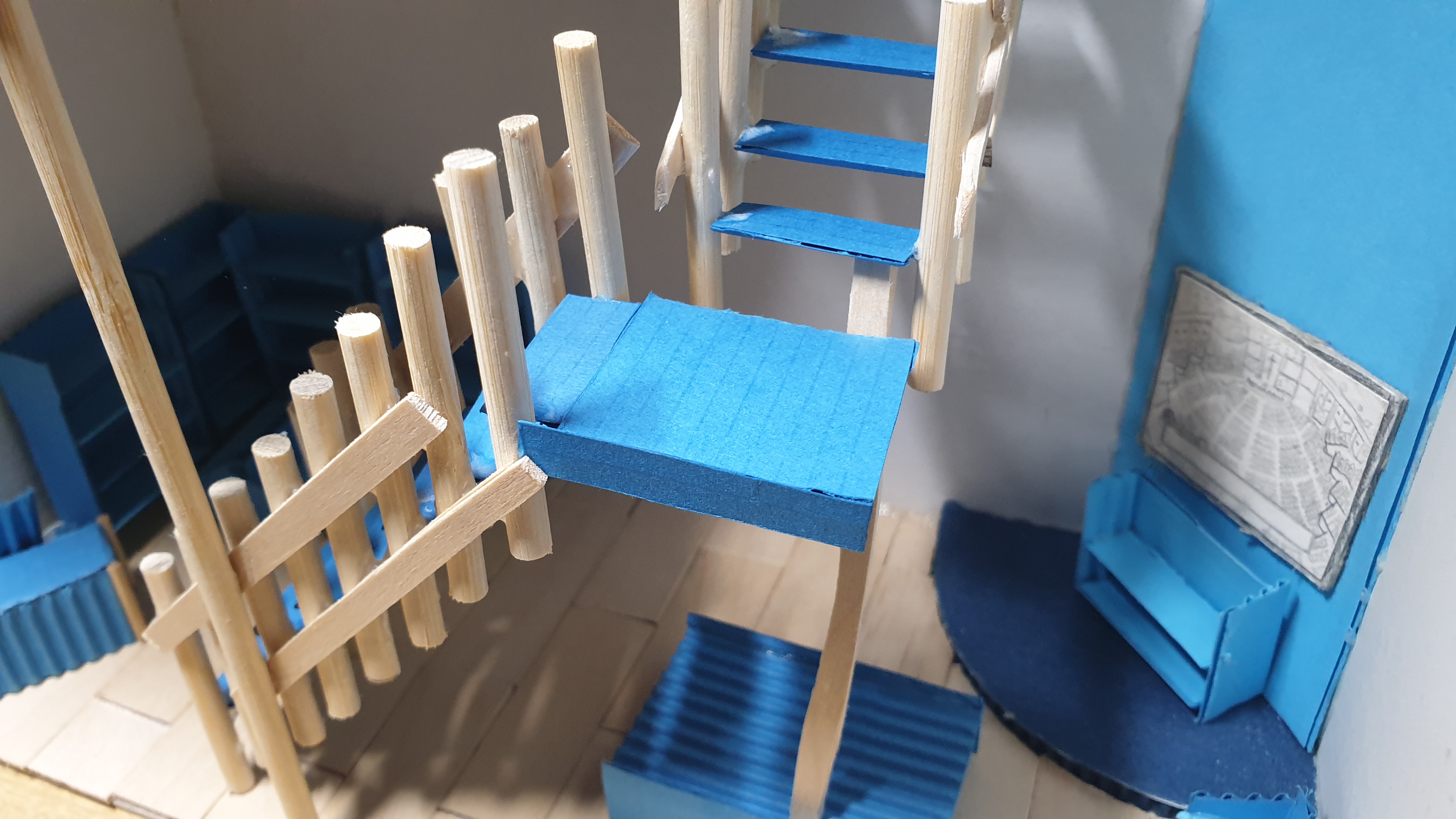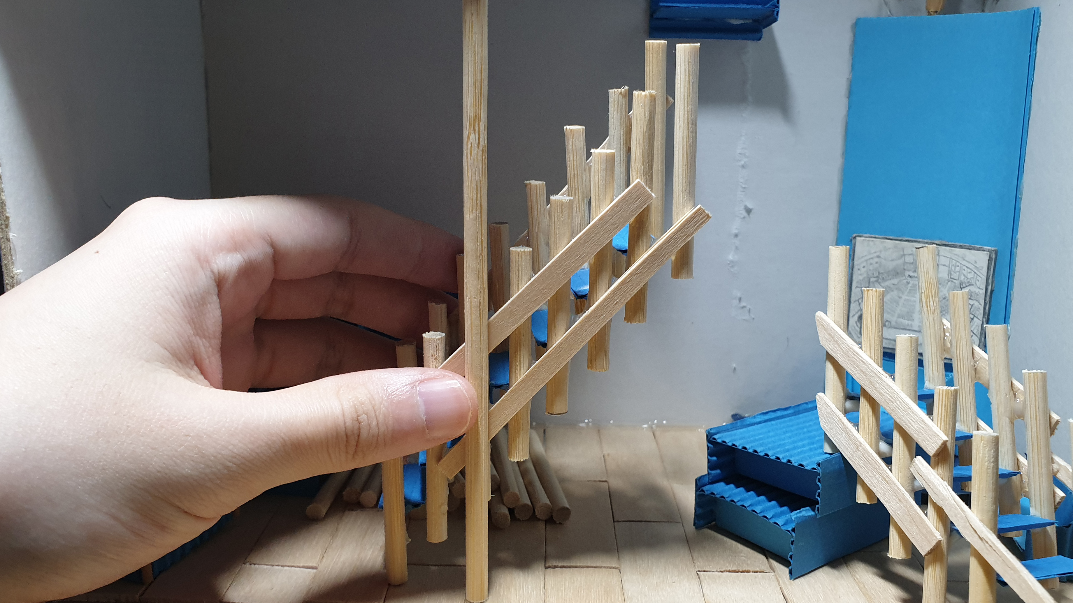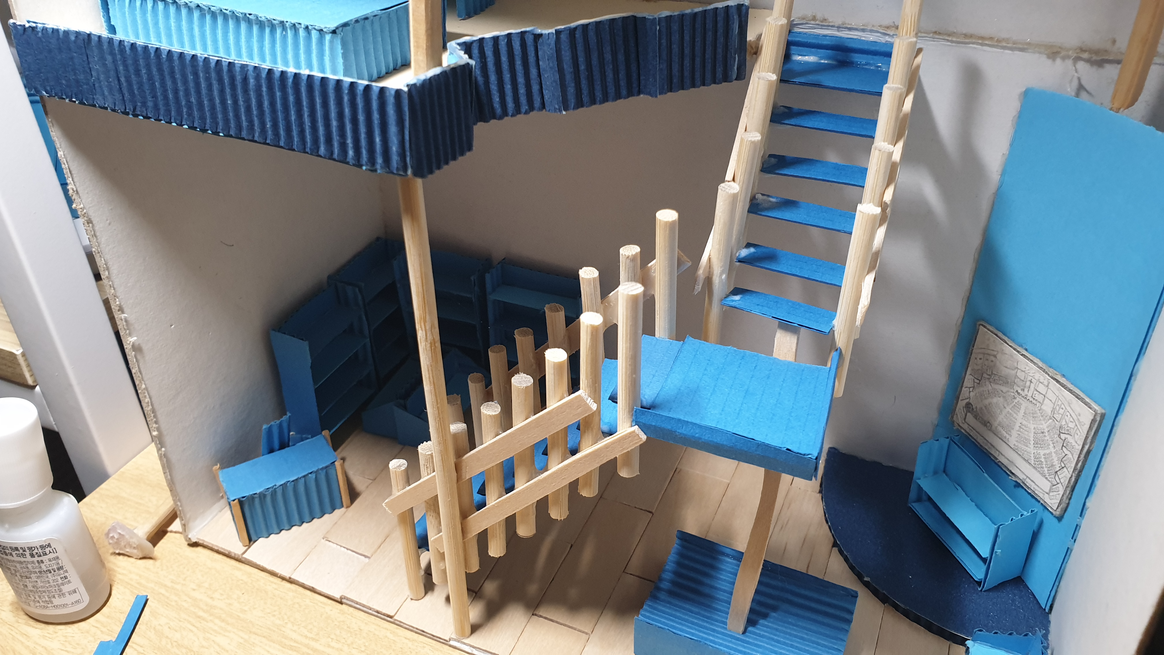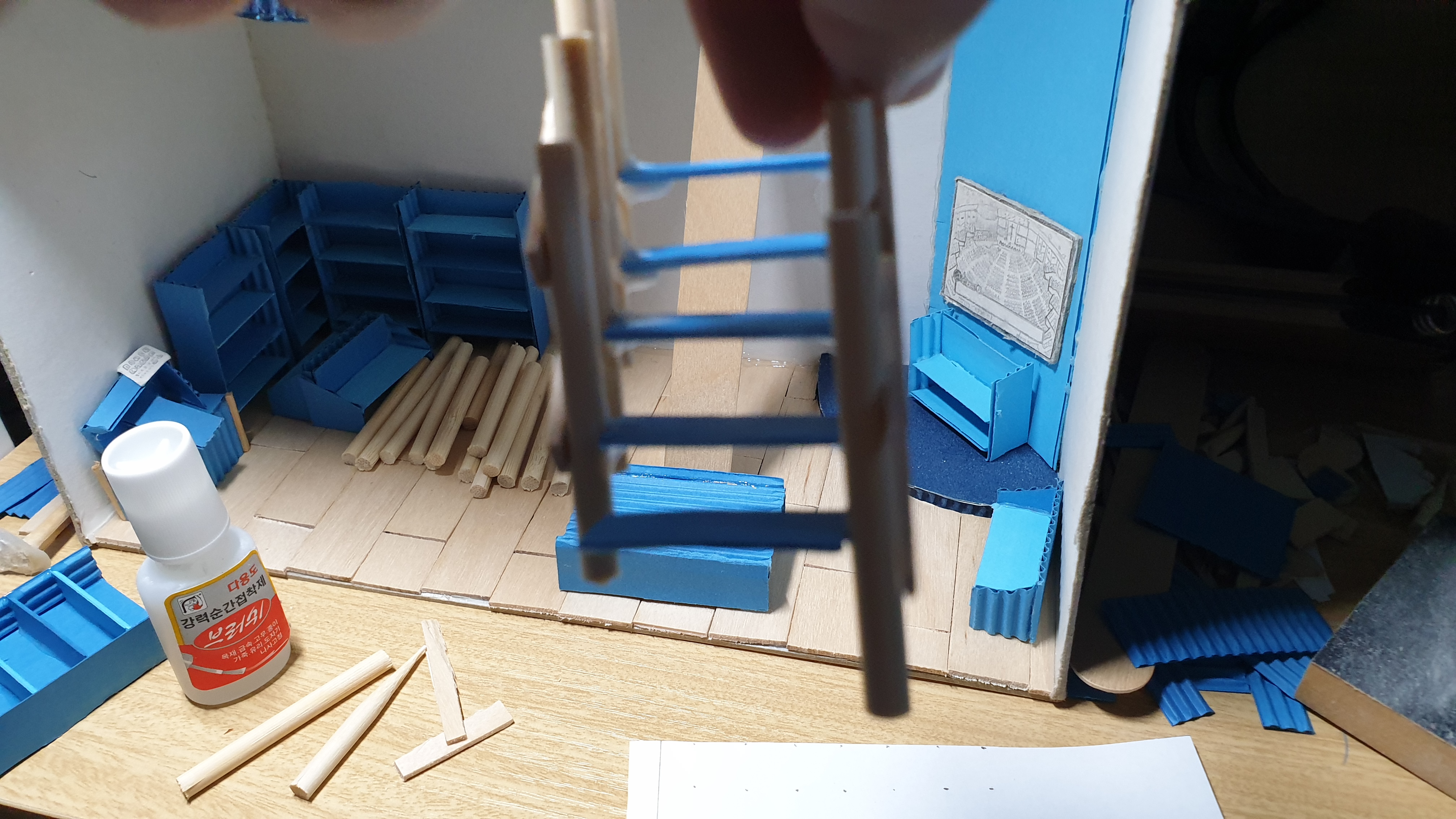 2층에서 1층으로 내려가는 계단도 순간접착제를 이용해 붙여주고 나서 기둥으로 고정해준다. 마를 때까지 주니엘 노래를 들으며 기다리자.