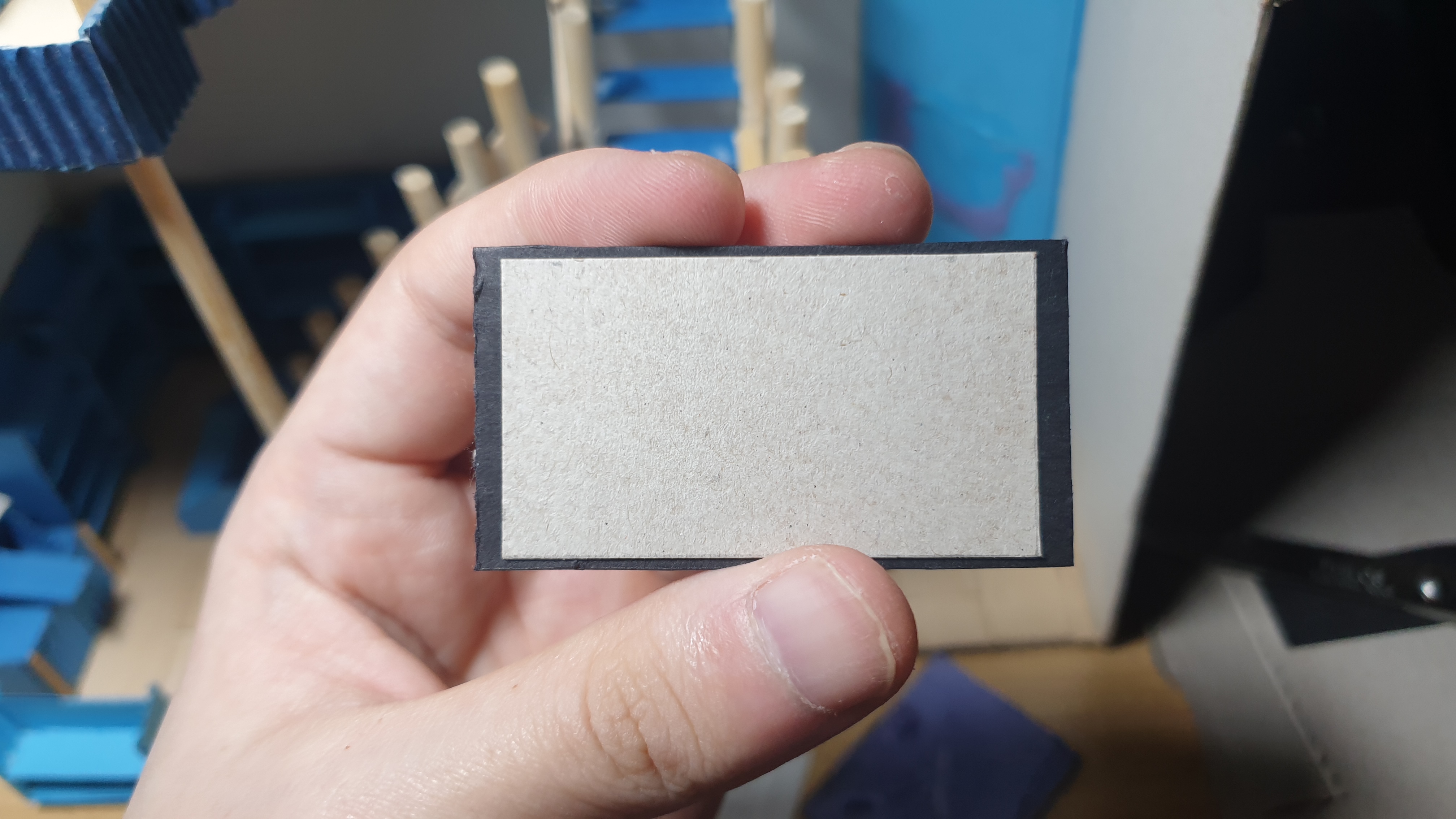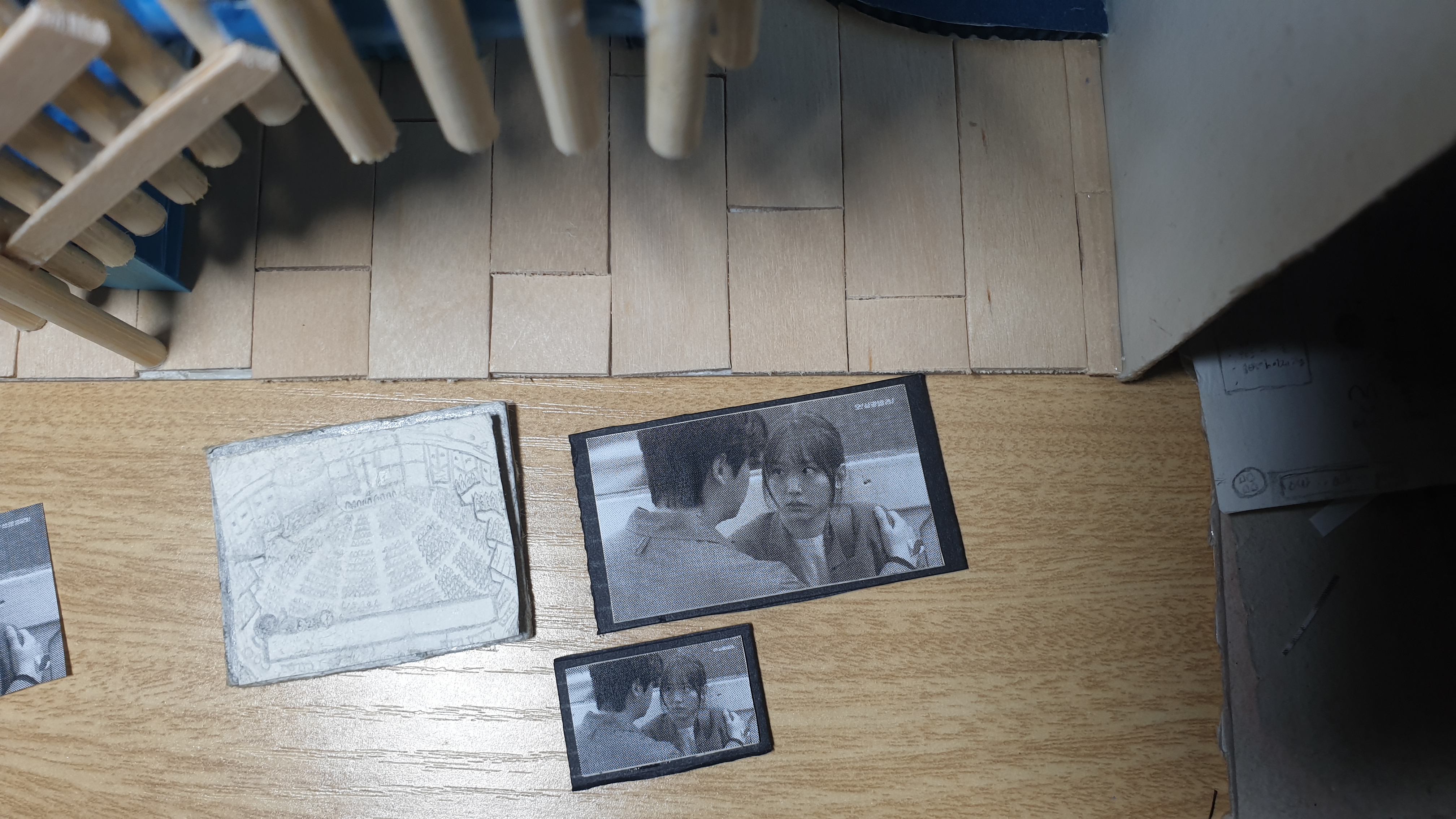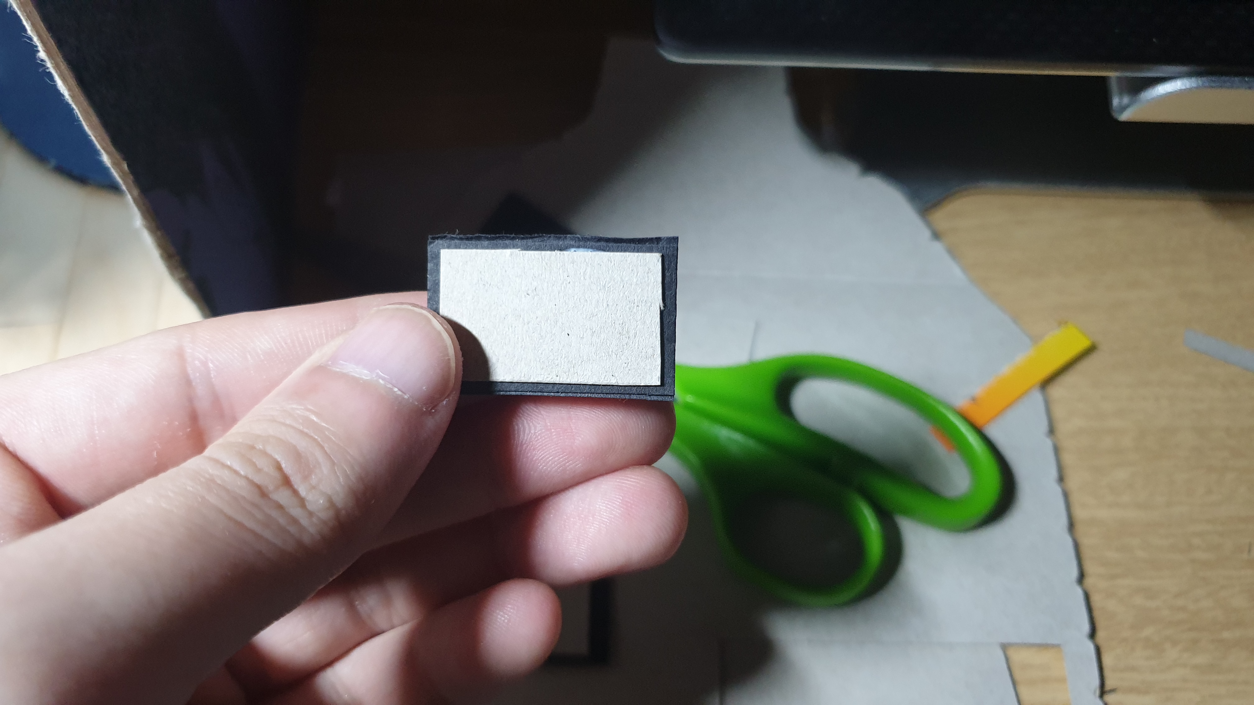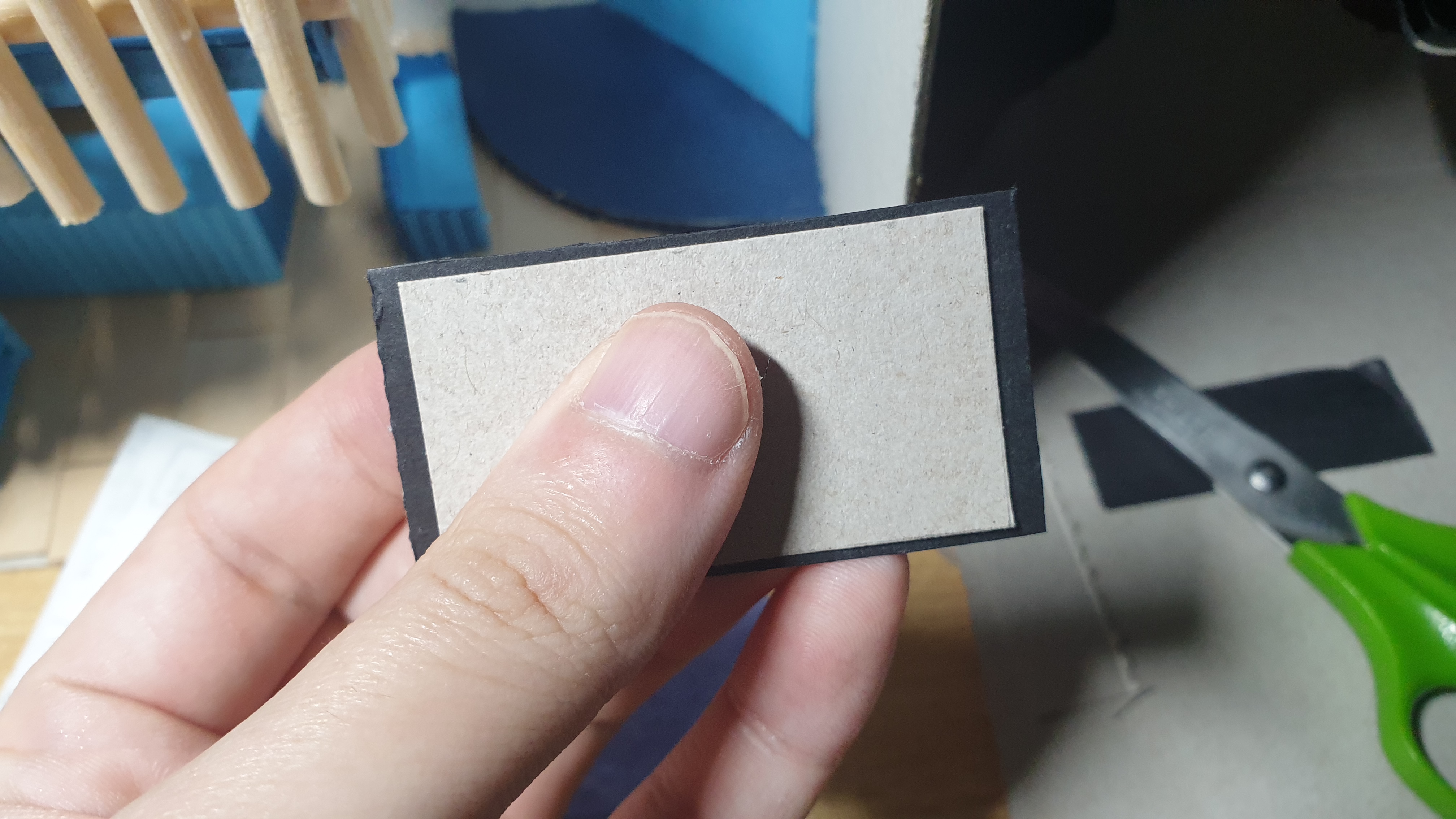 검정색 골판지로 테두리를 만들어준다. 1층 거실에 달 텔레비전 크기는 5.0×2.8cm.