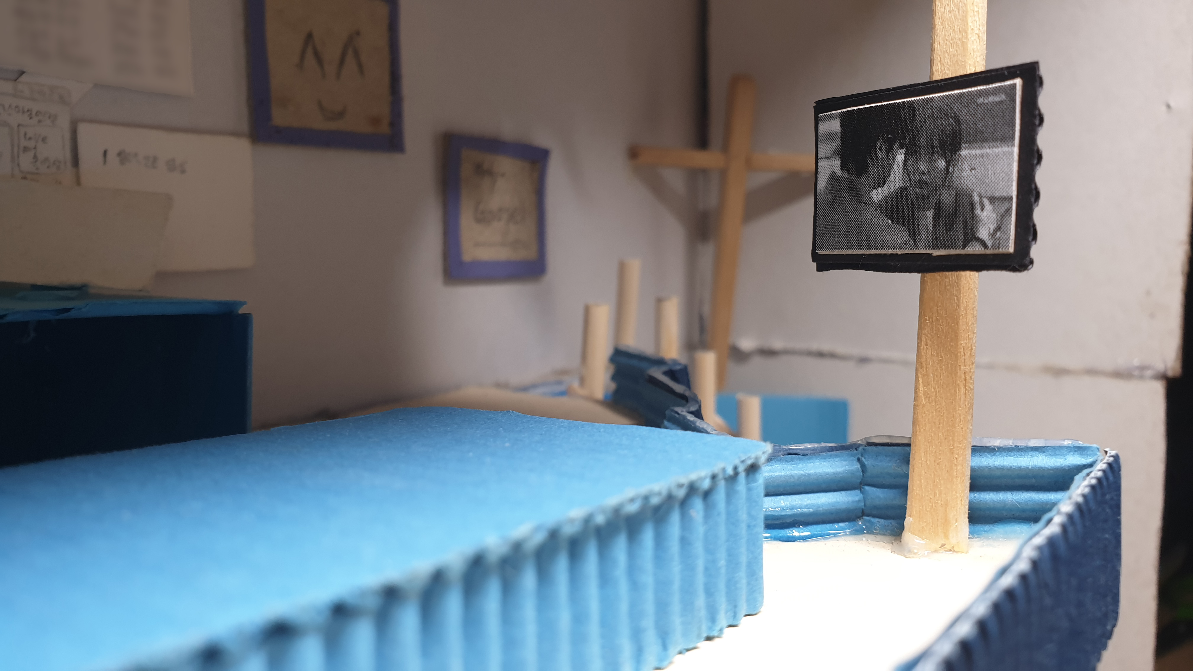 검정색 골판지로 테두리를 만들어준다. 1층 거실에 달 텔레비전 크기는 5.0×2.8cm.