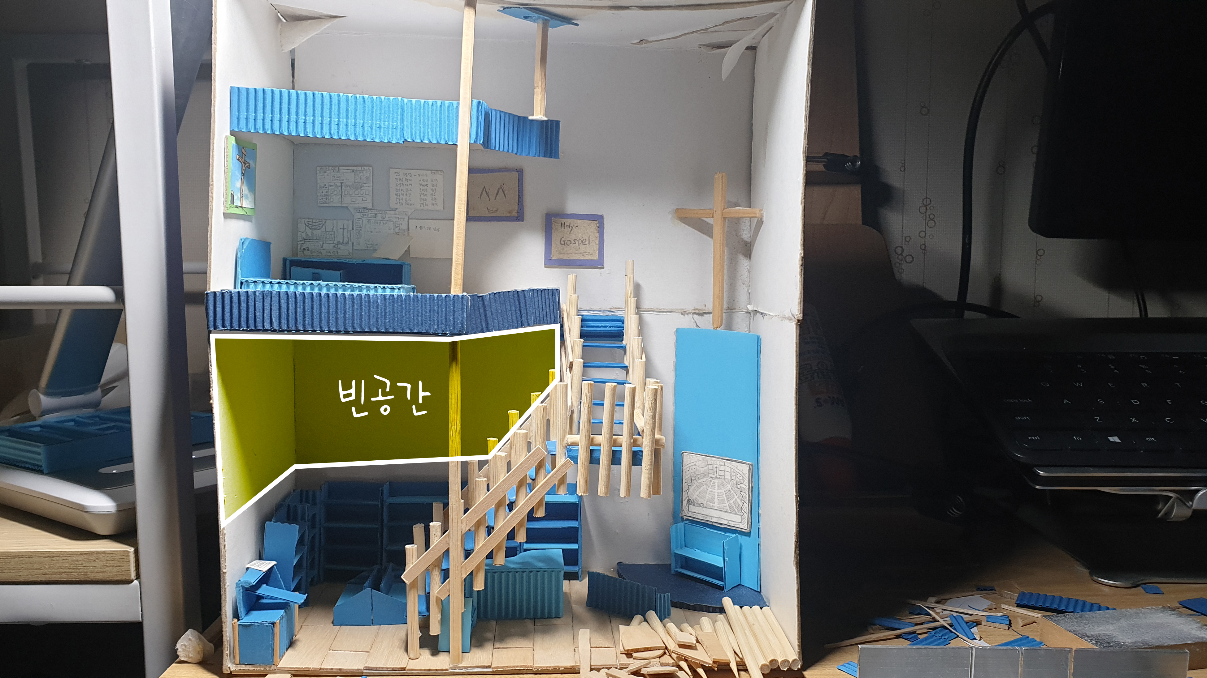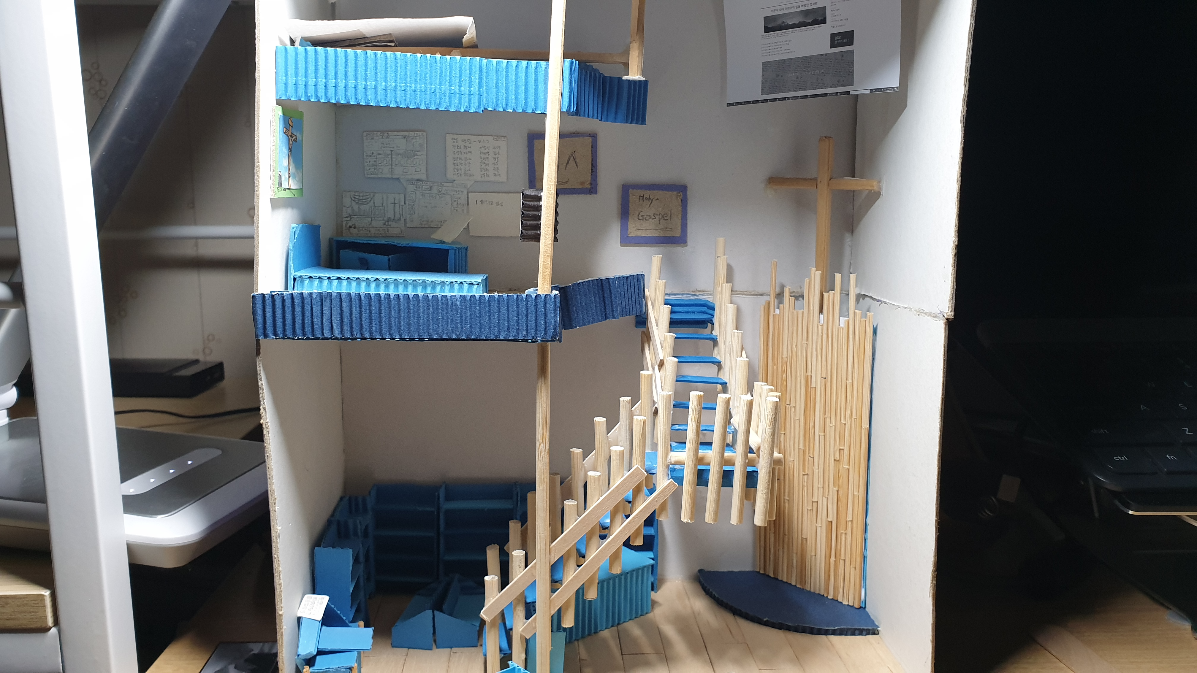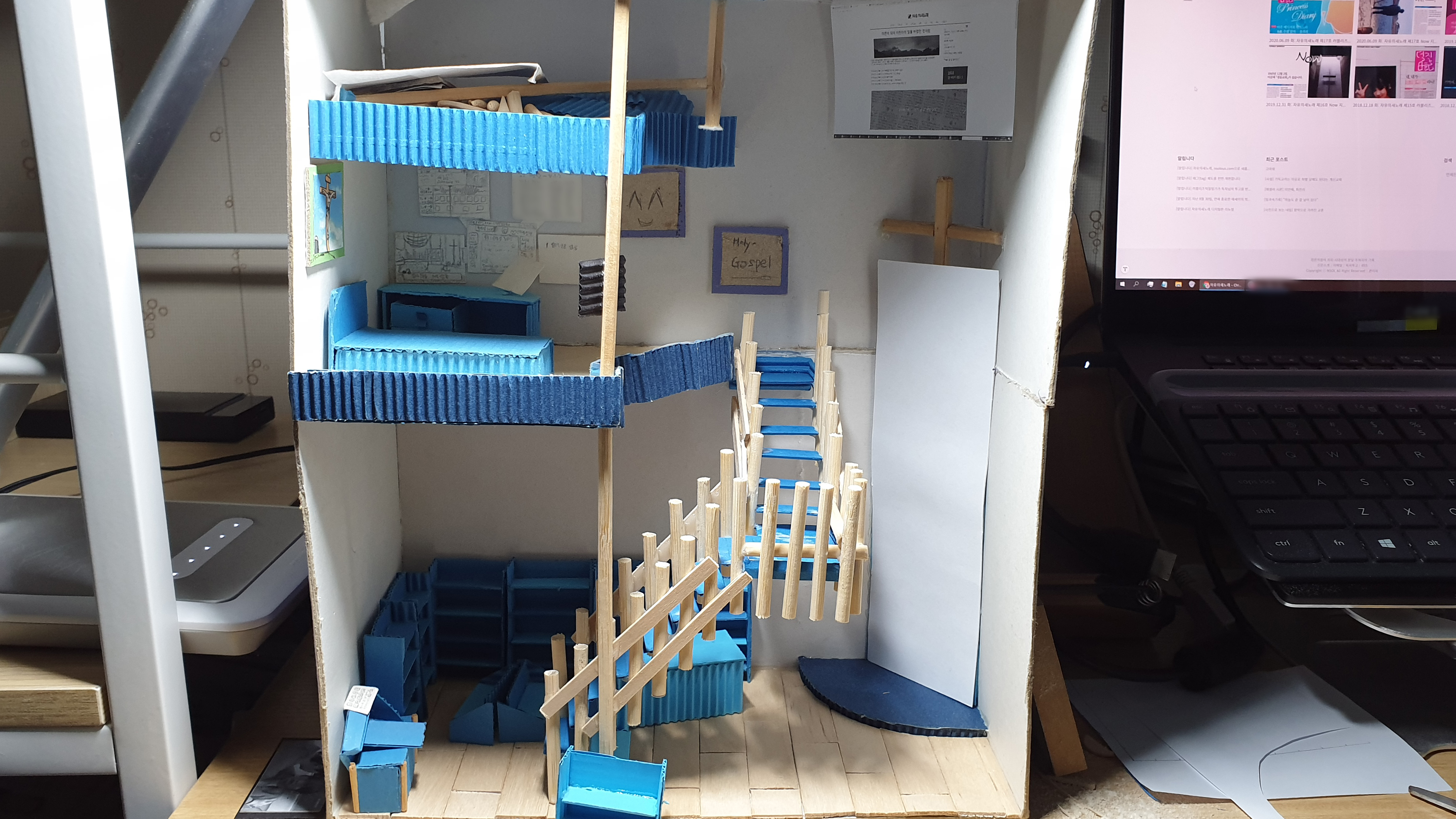 옆면 하늘색 골판지가 보이는 부분도 가려주기 위해 손 써야 한다.