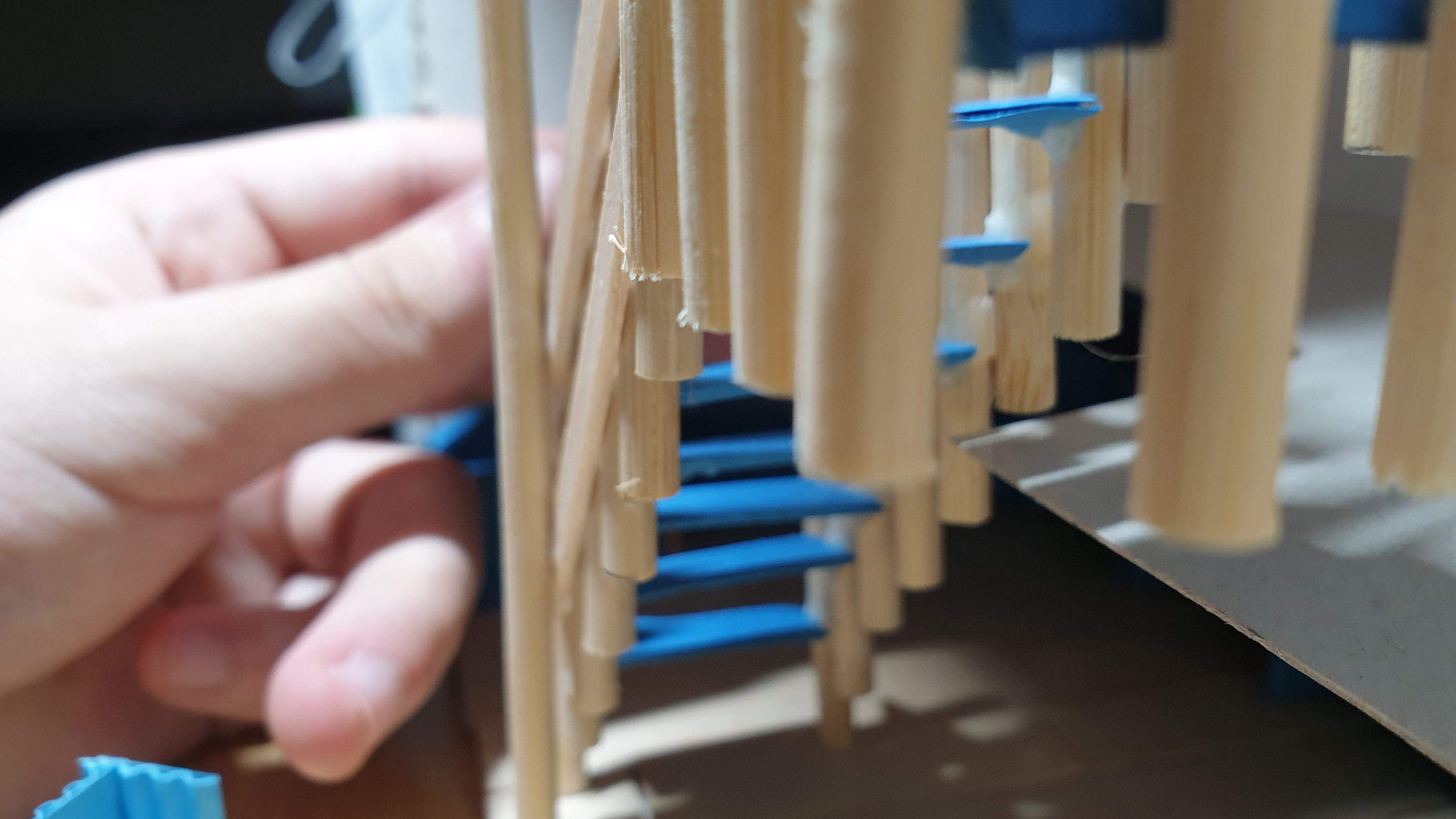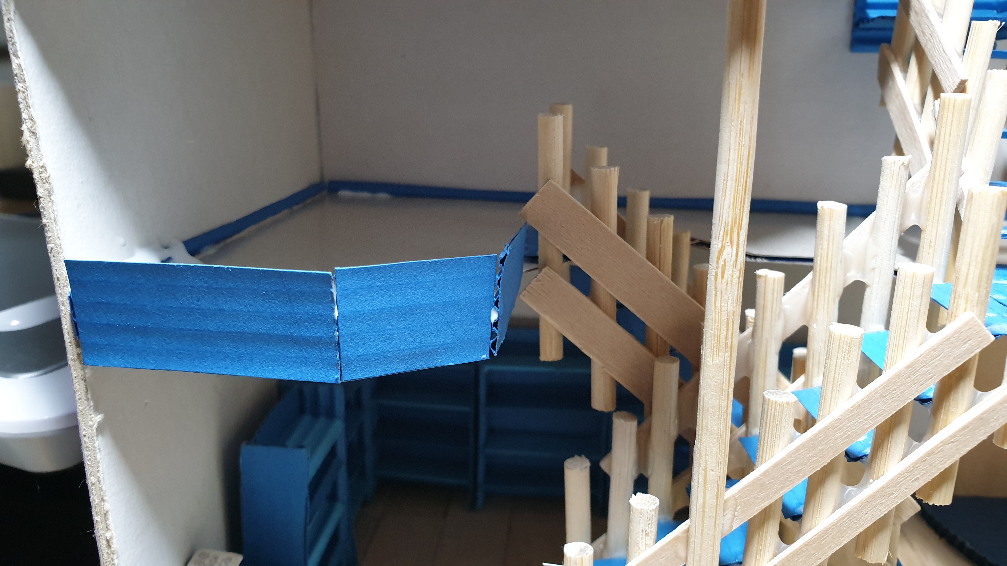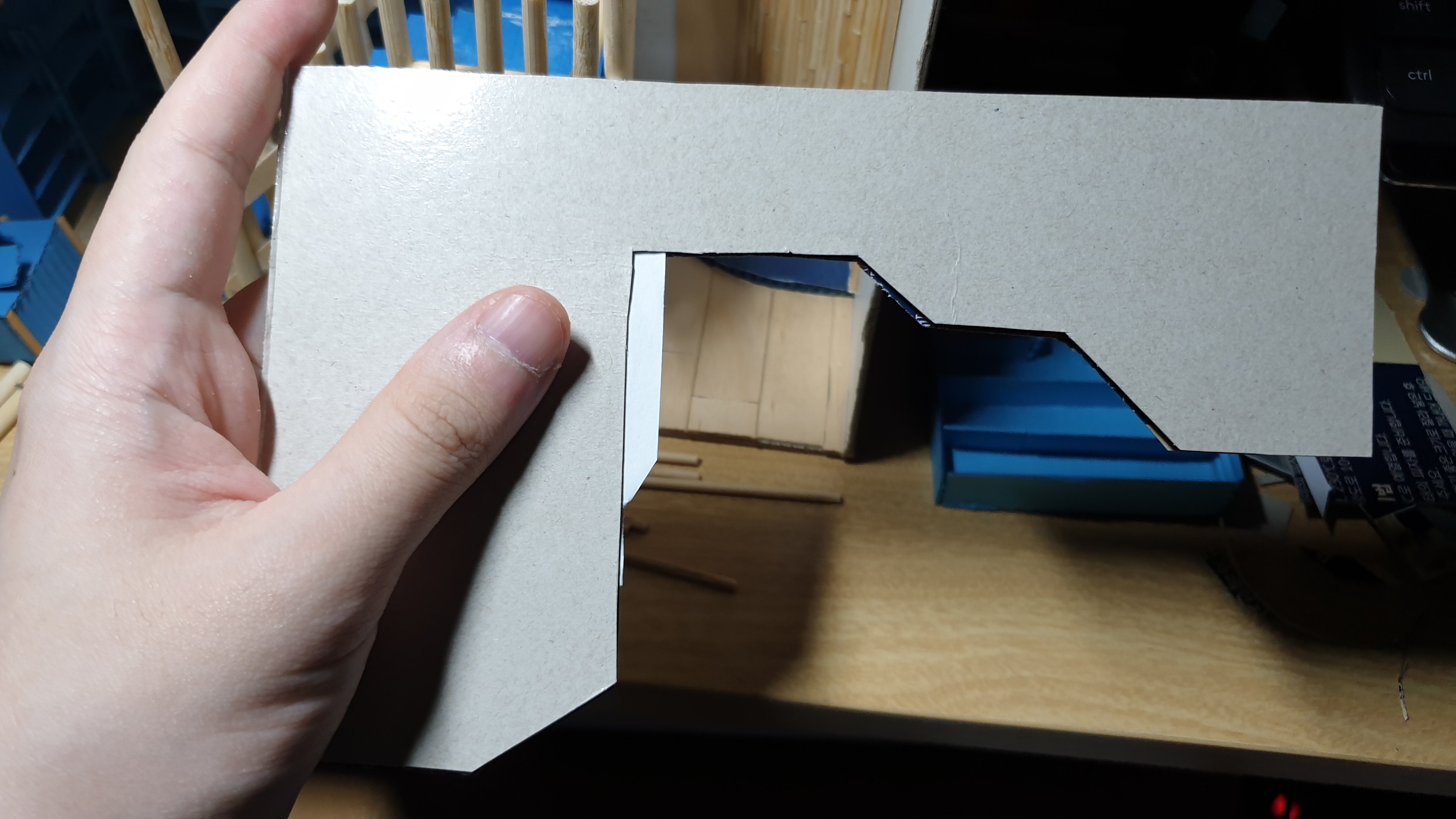 이렇듯 나무막대 난간과 집어넣은 냉동피자 상자가 닿는 방식으로 증축한 2층을 부착할 생각이다.