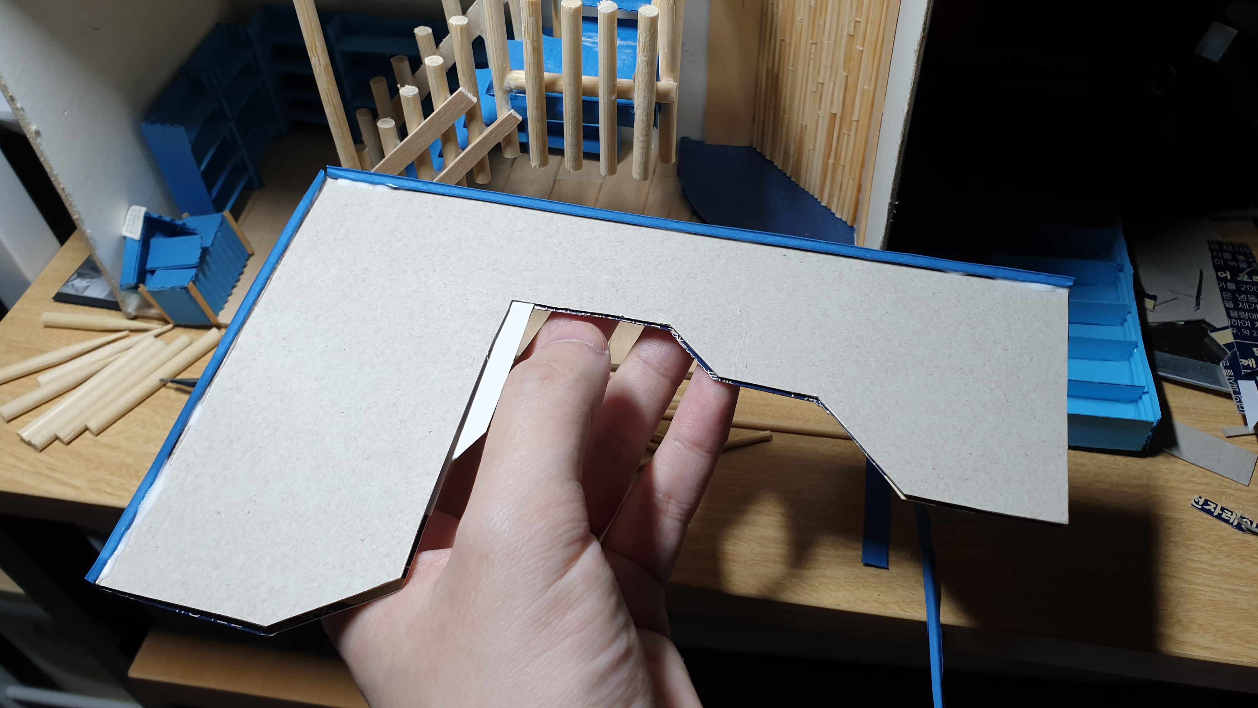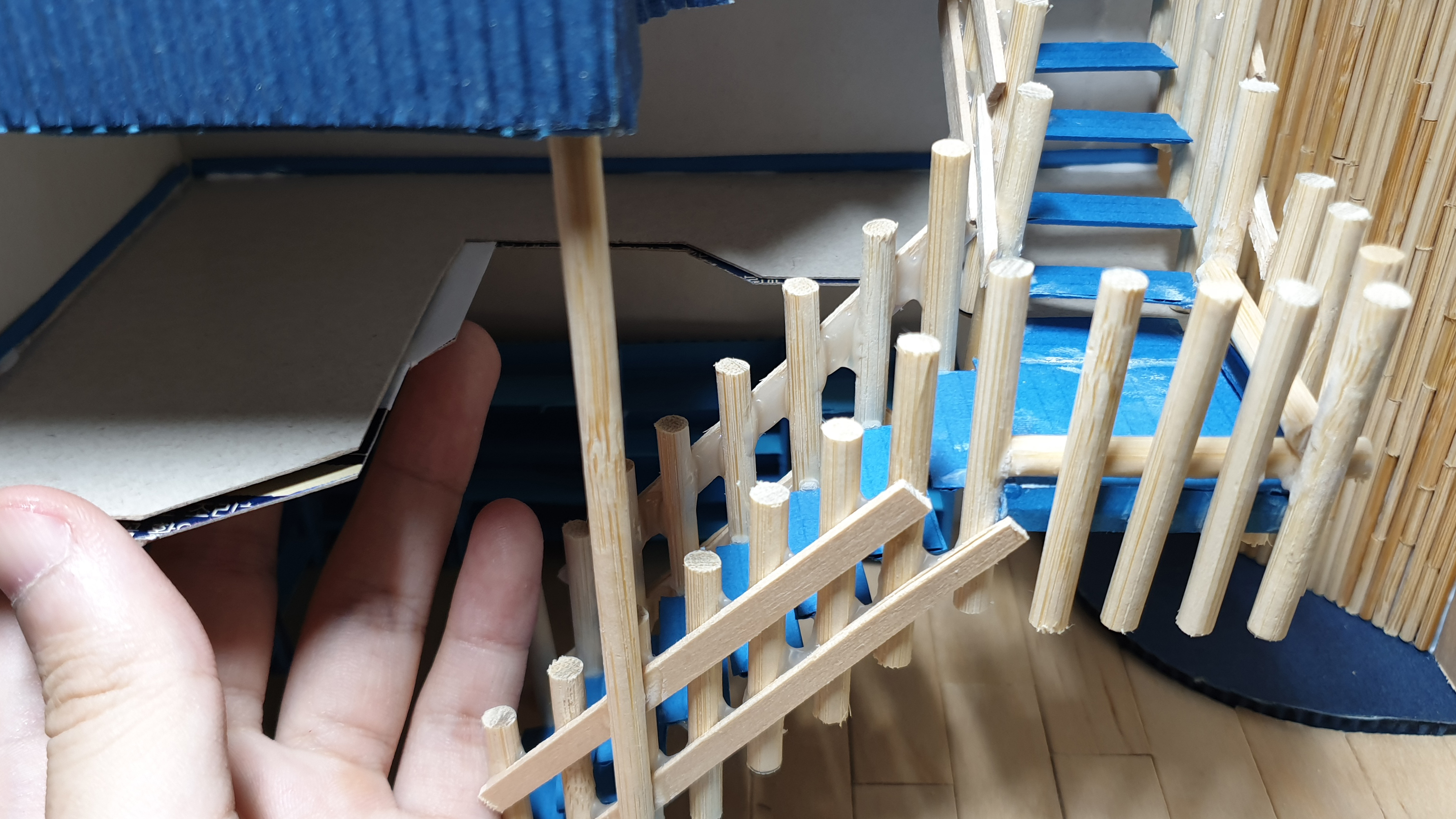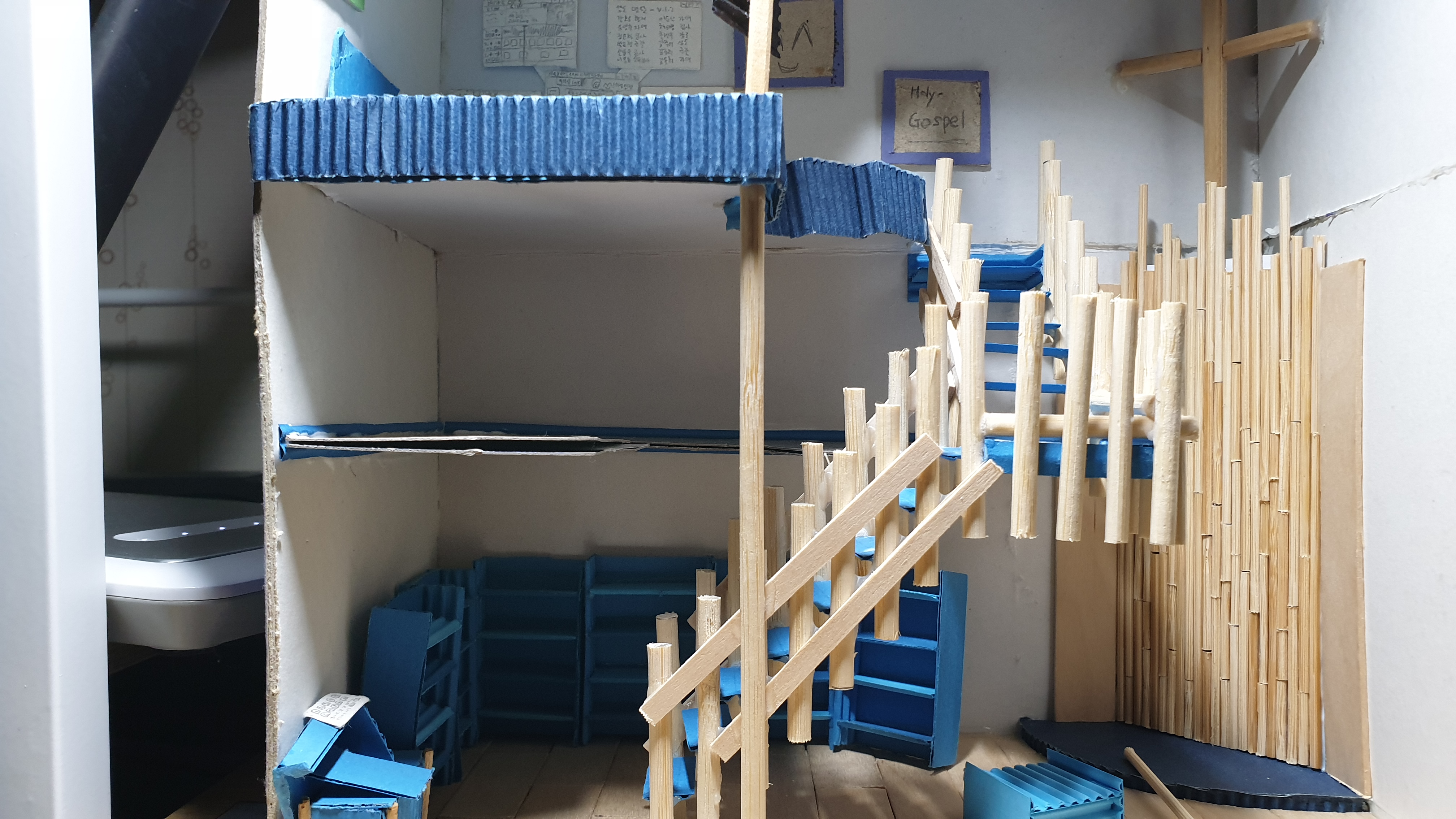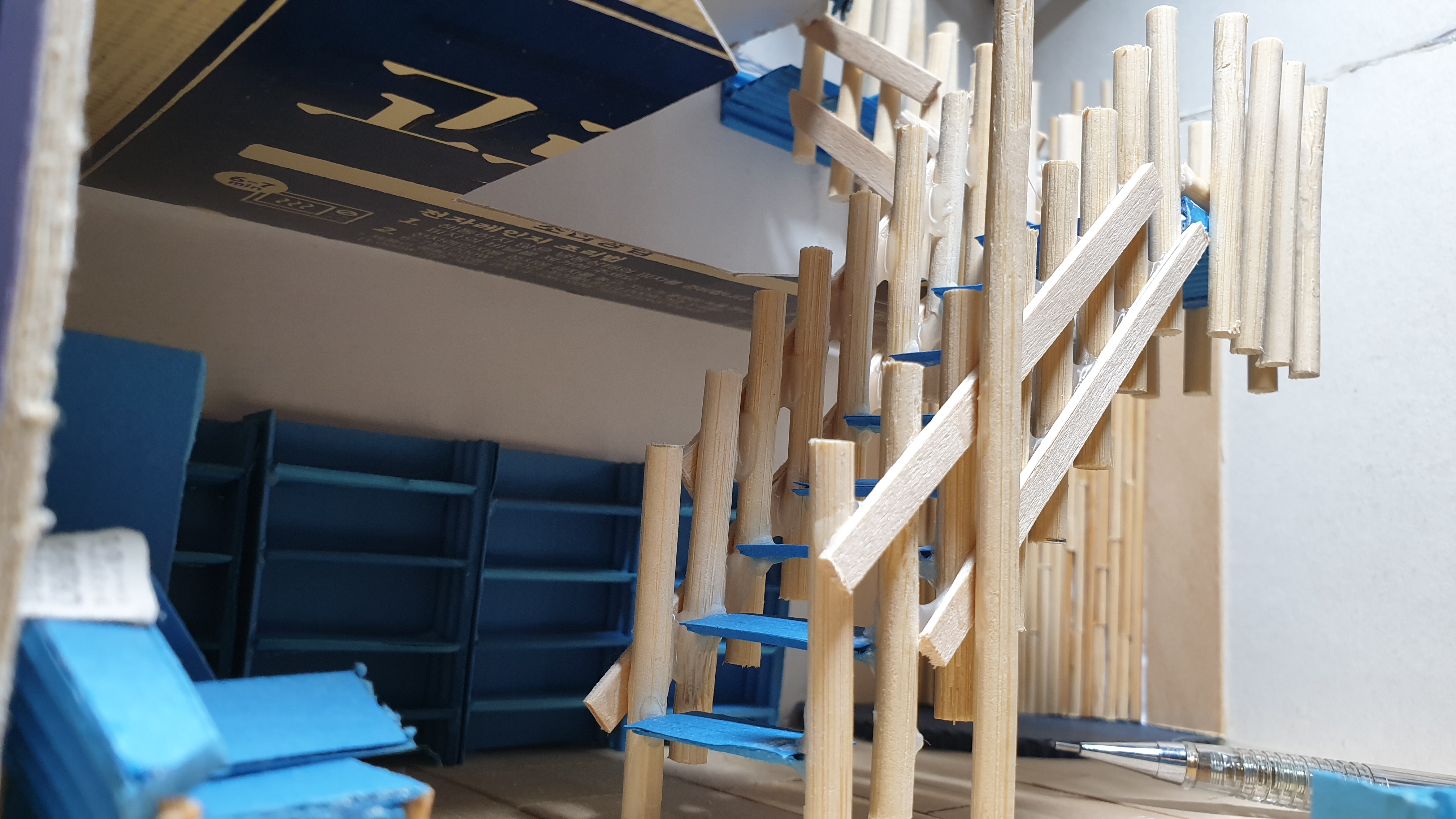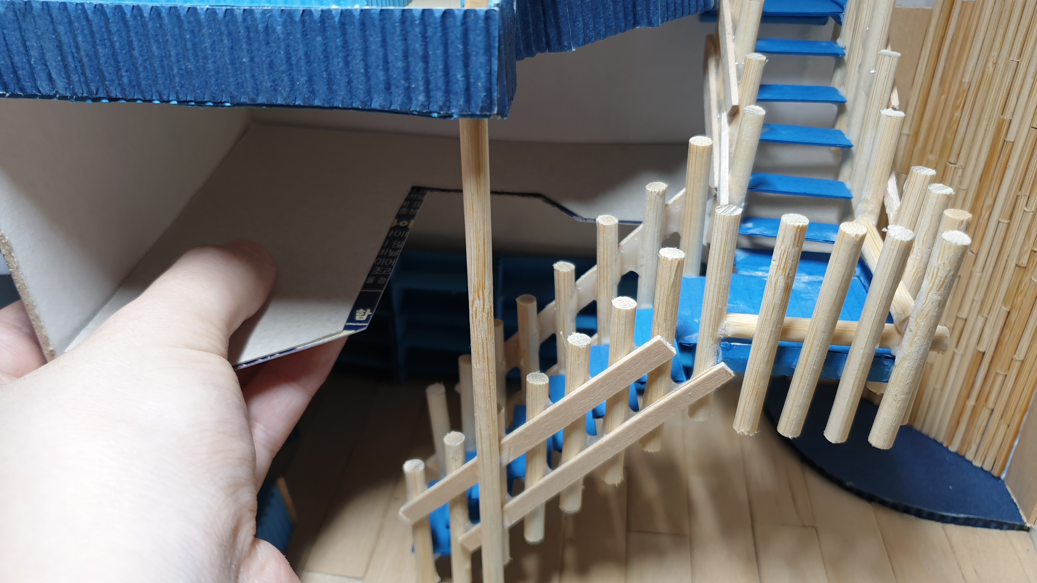 이렇듯 나무막대 난간과 집어넣은 냉동피자 상자가 닿는 방식으로 증축한 2층을 부착할 생각이다.