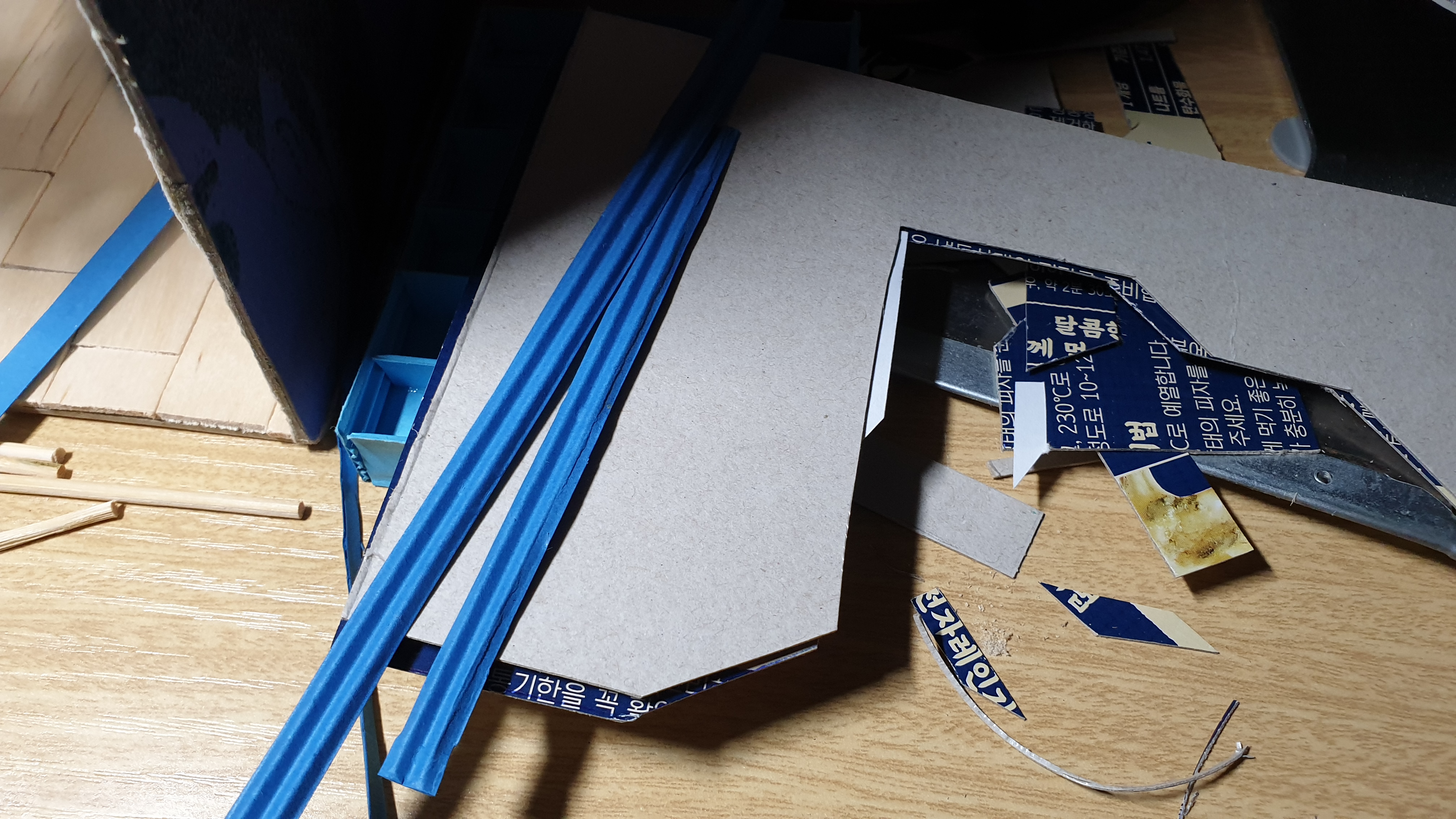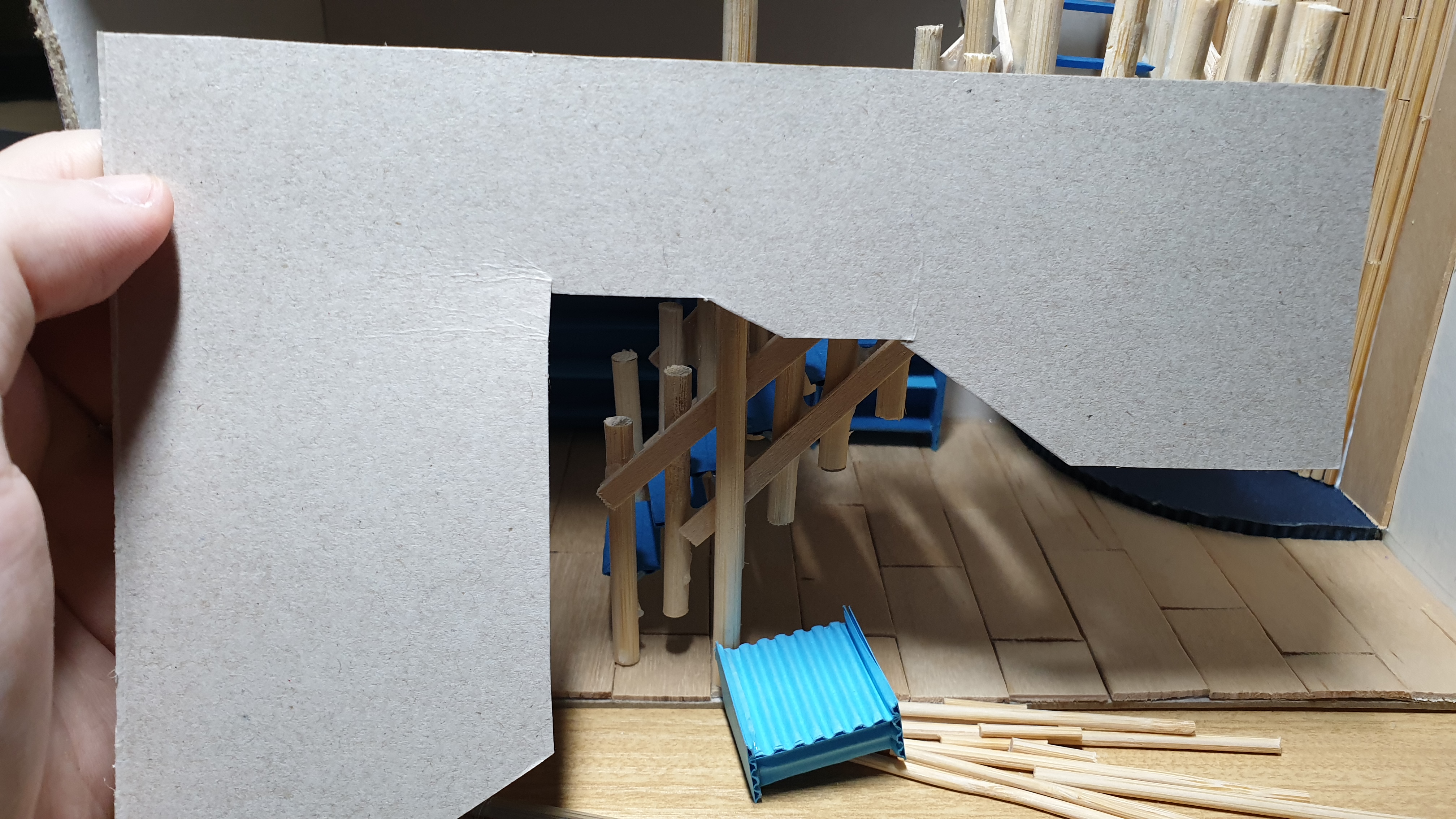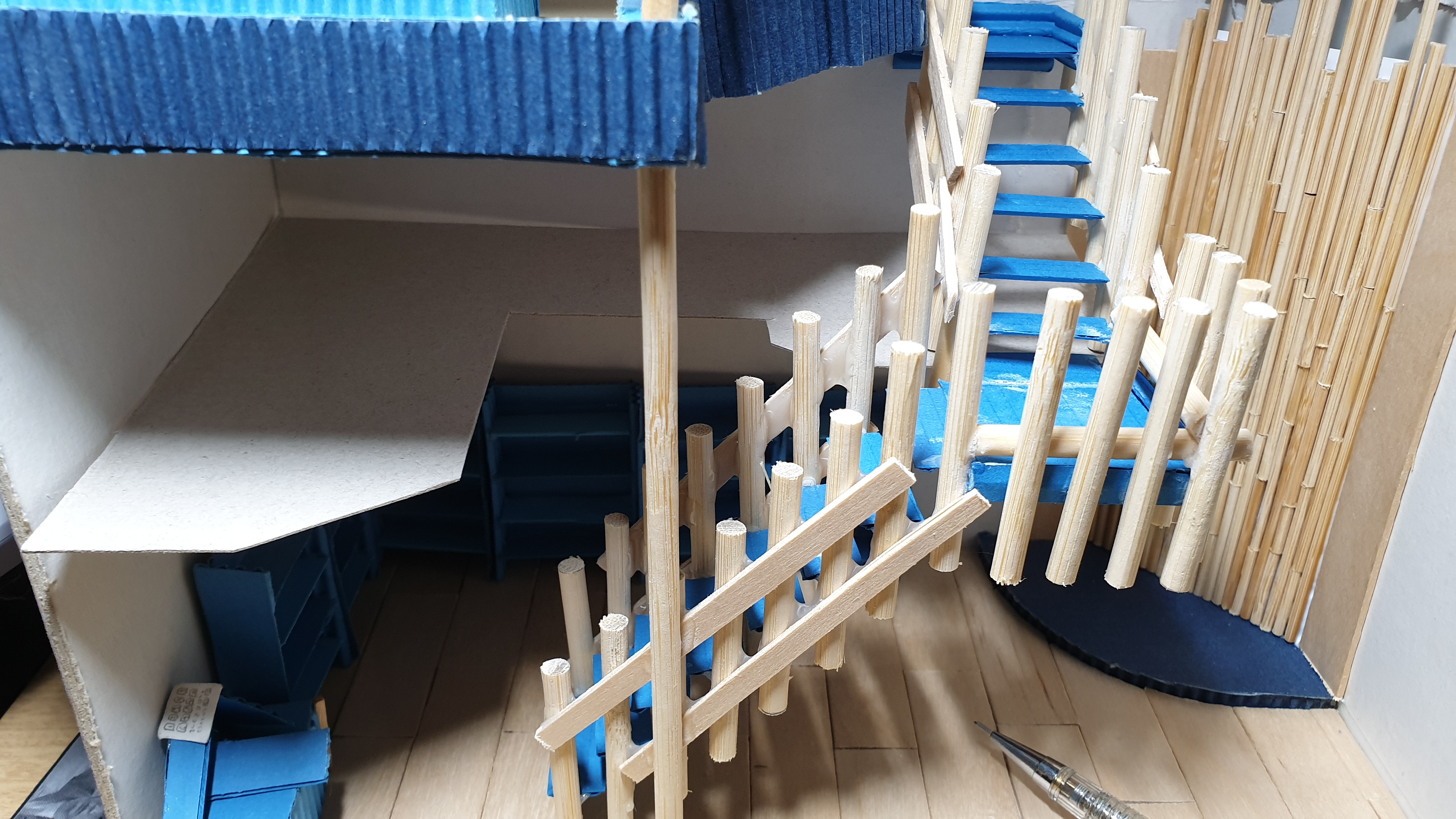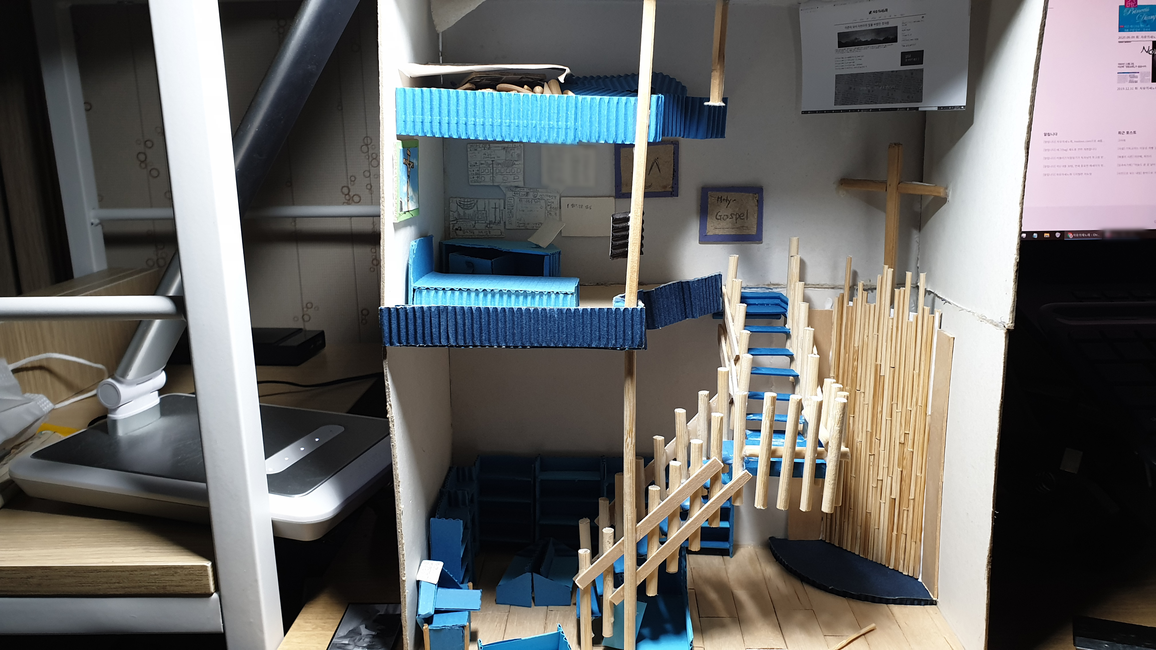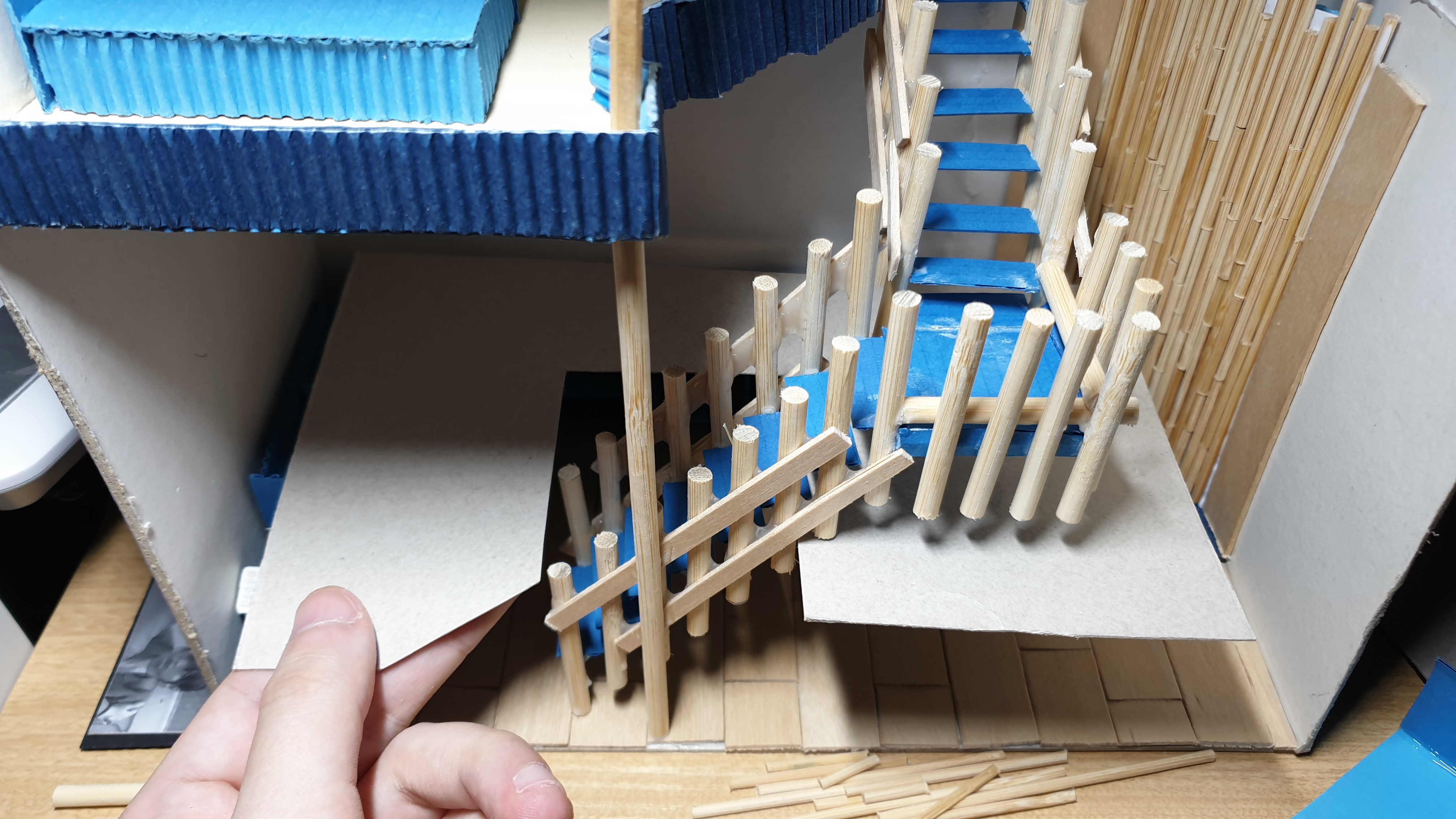 이렇듯 나무막대 난간과 집어넣은 냉동피자 상자가 닿는 방식으로 증축한 2층을 부착할 생각이다.