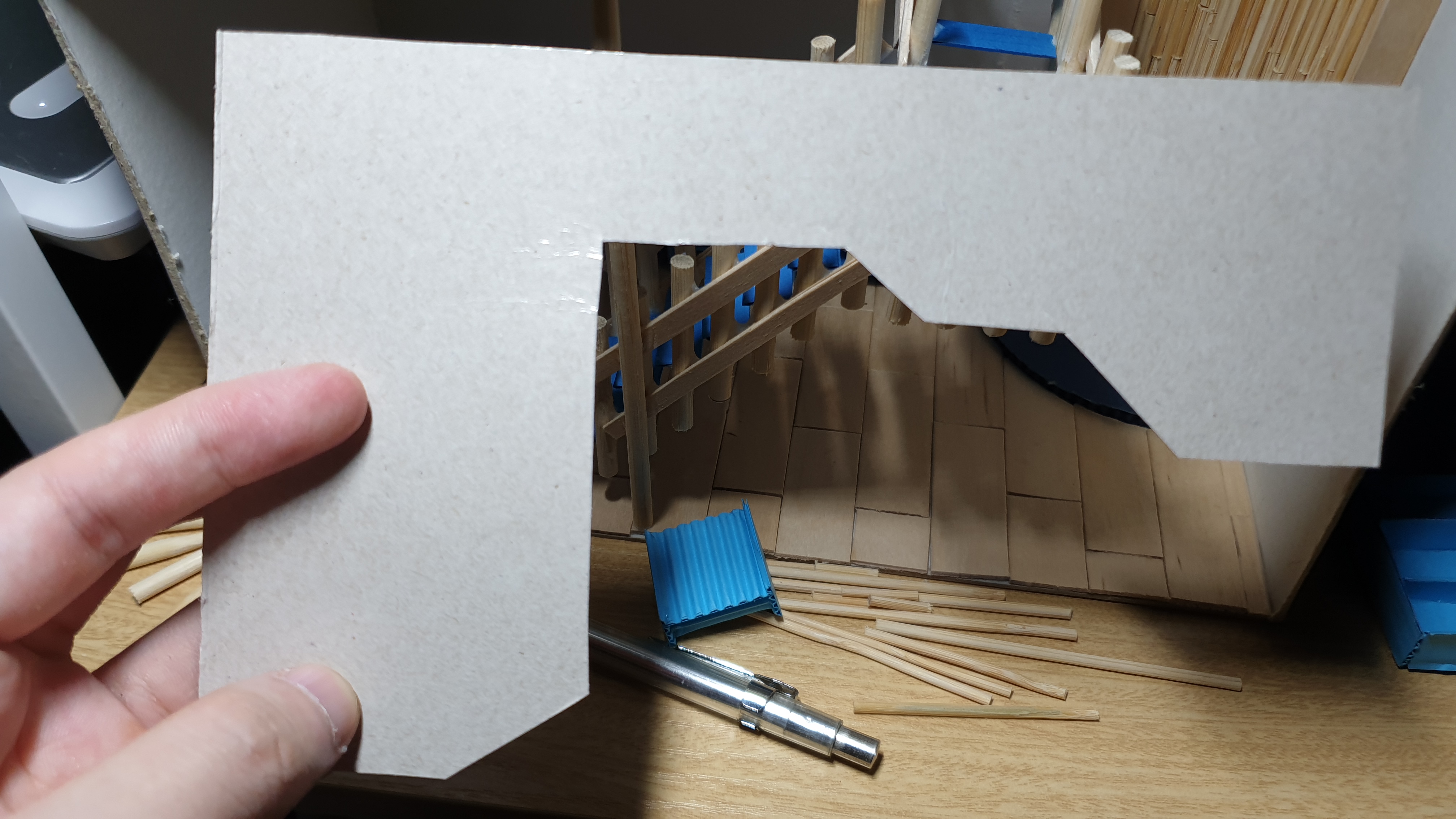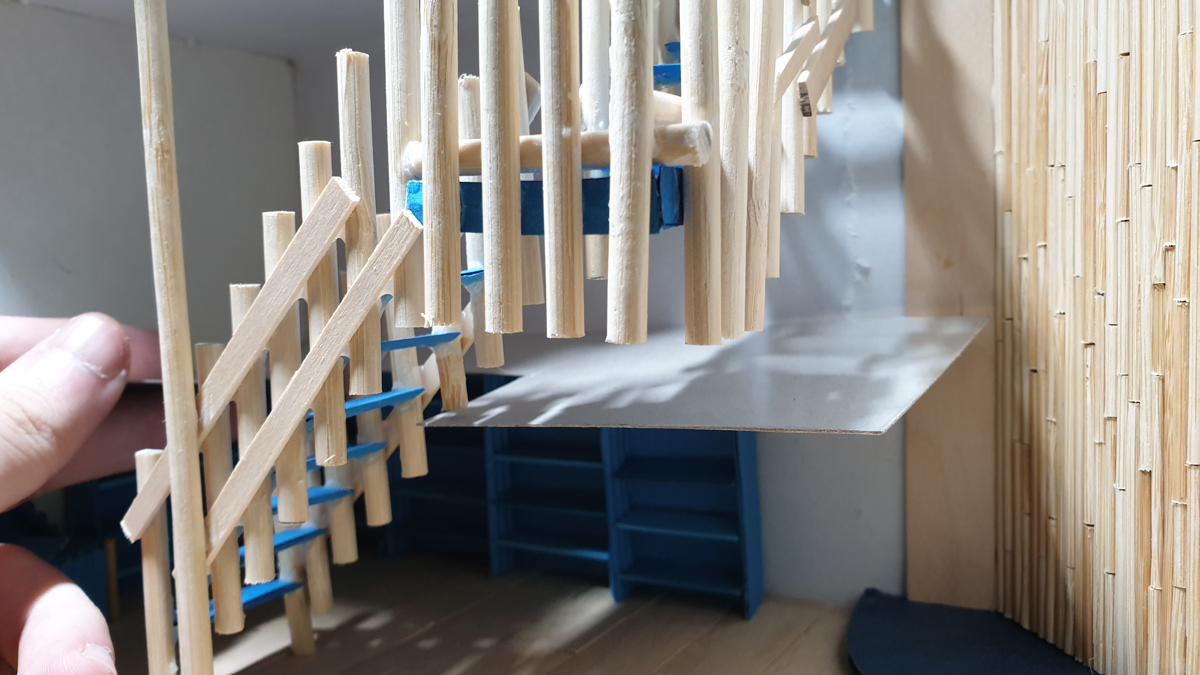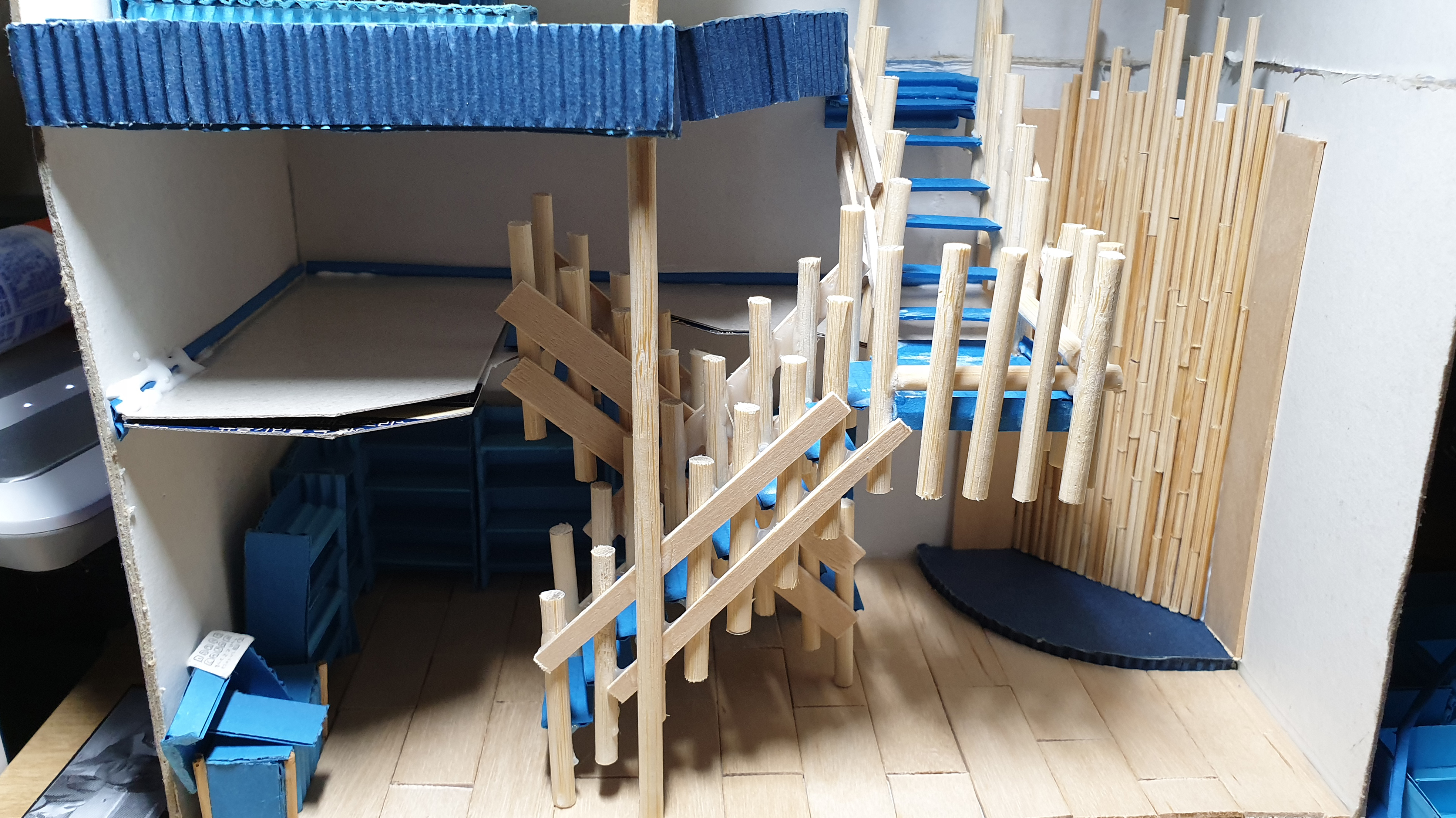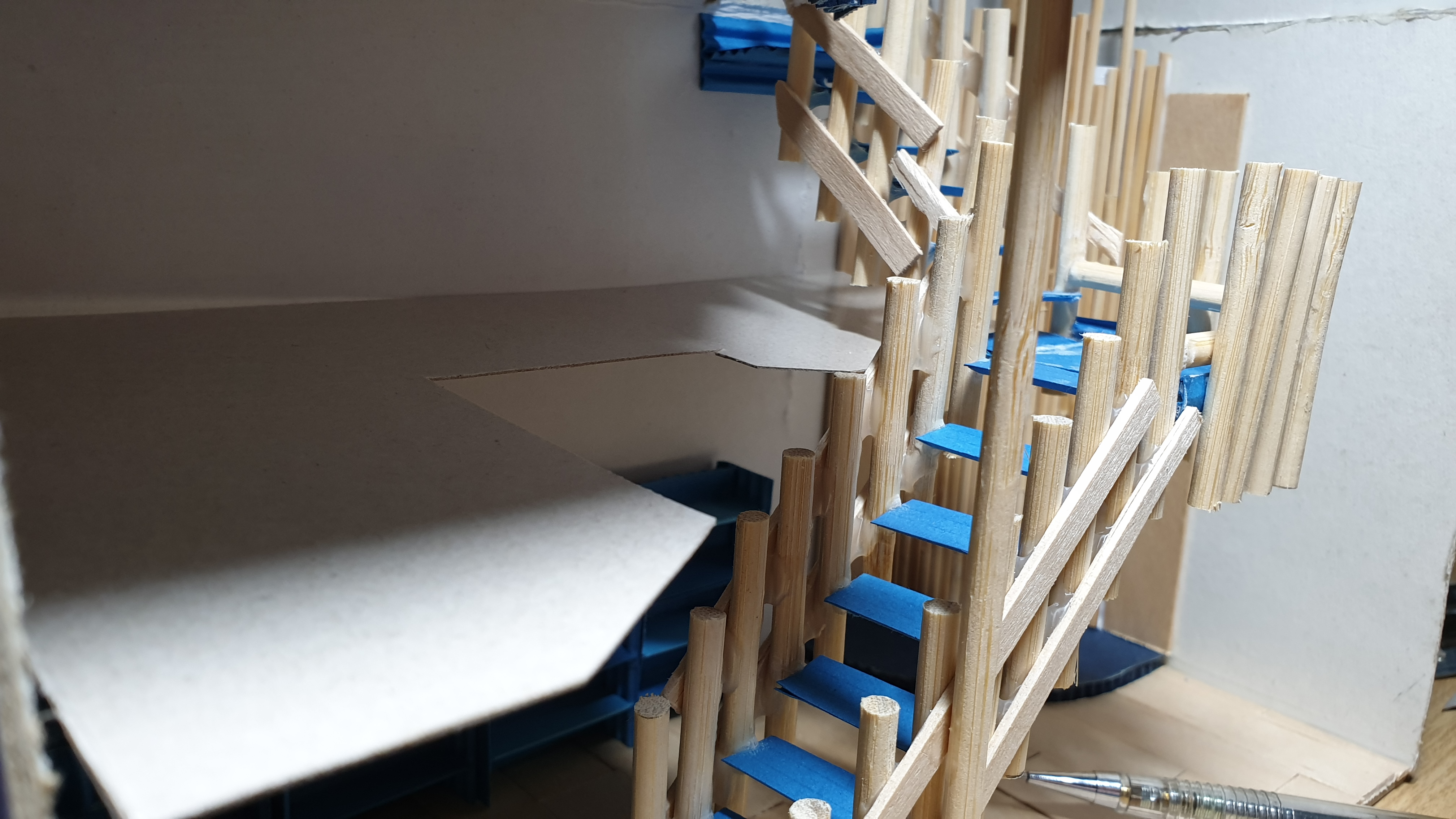 이렇듯 나무막대 난간과 집어넣은 냉동피자 상자가 닿는 방식으로 증축한 2층을 부착할 생각이다.