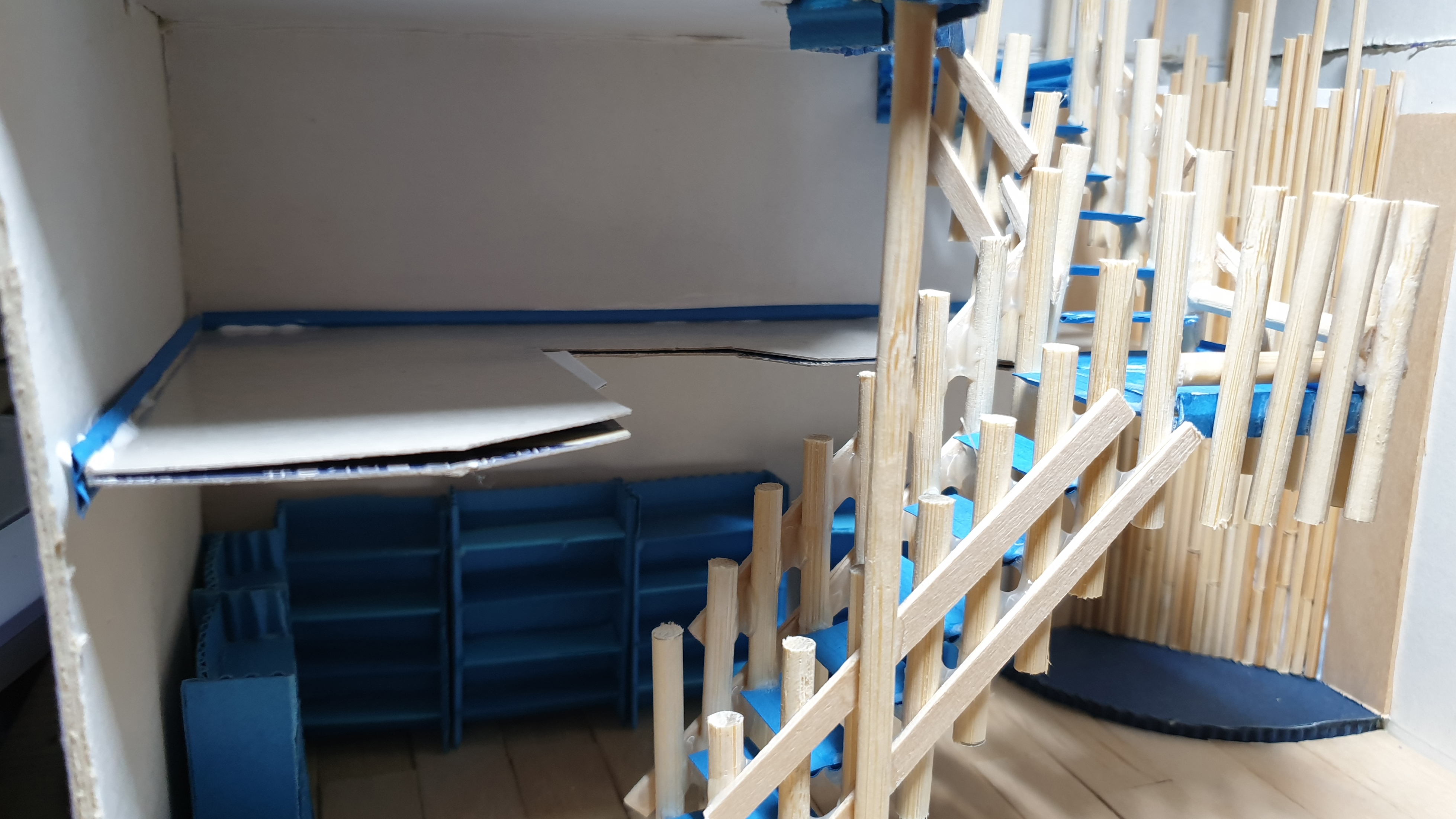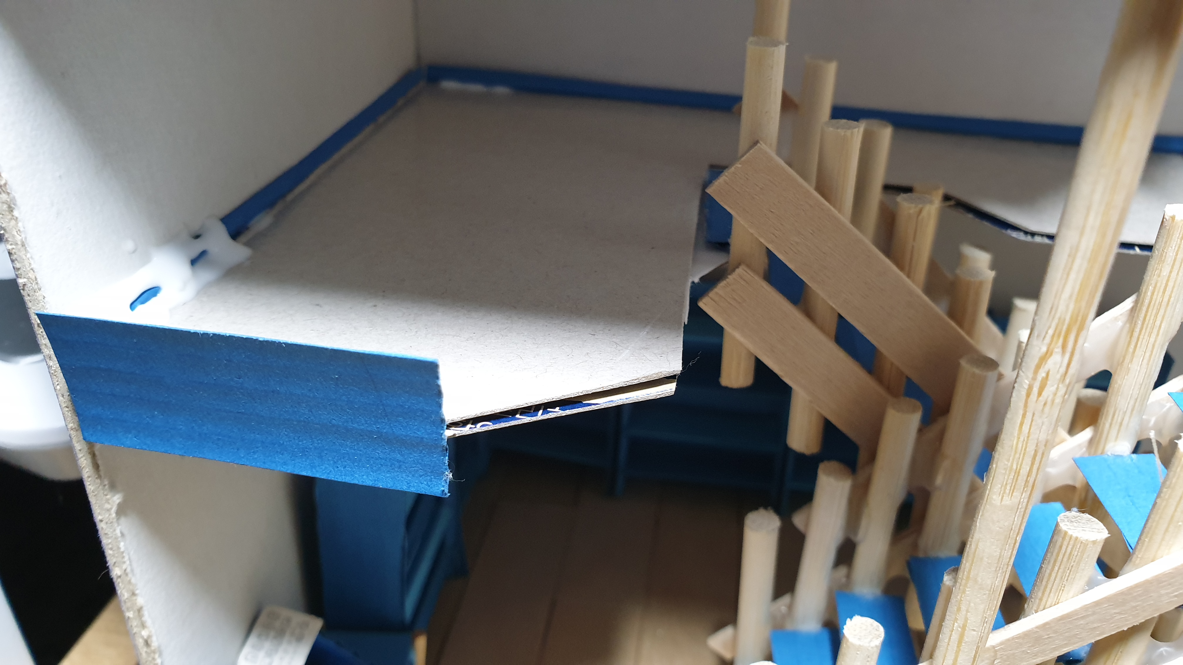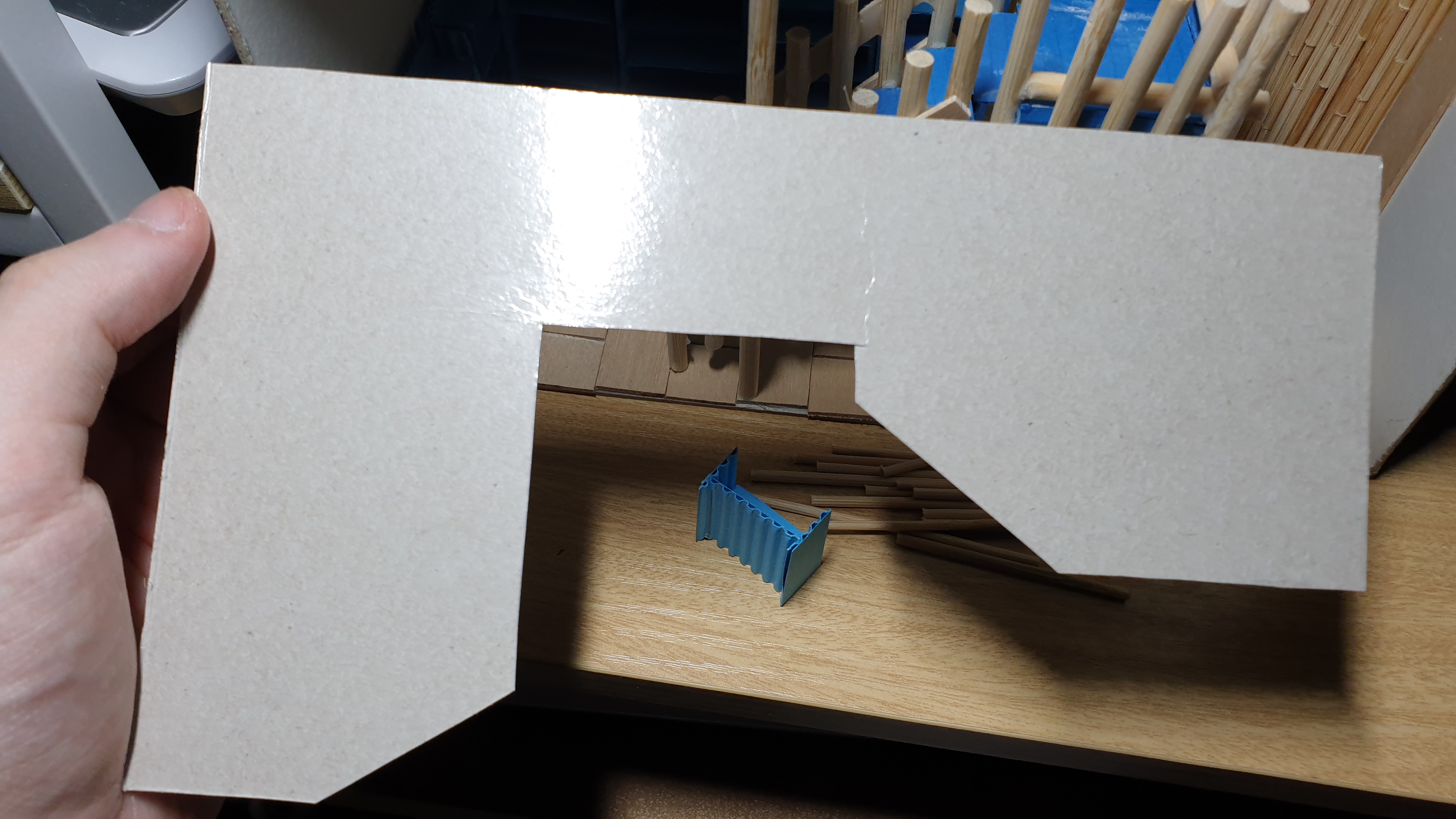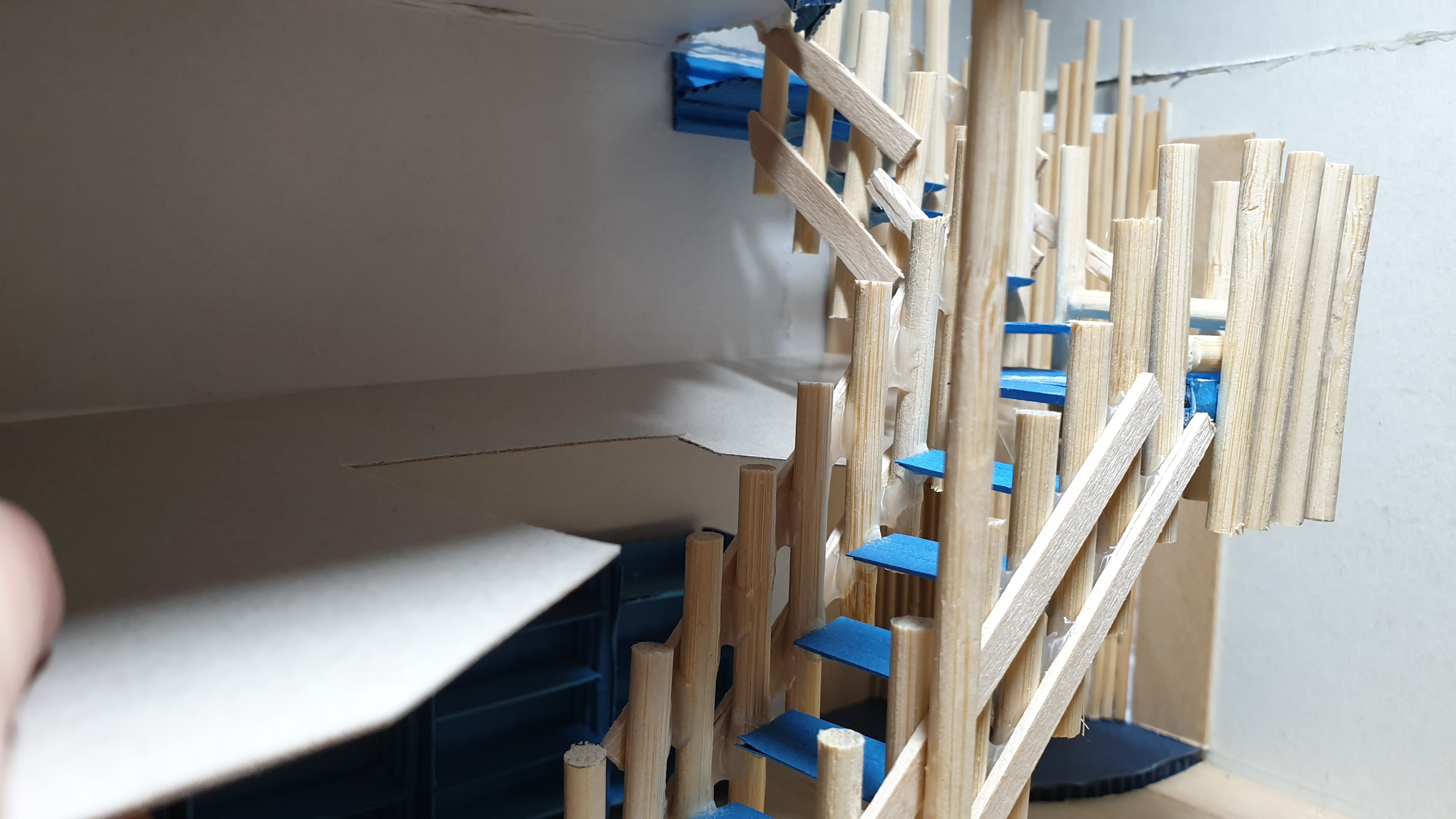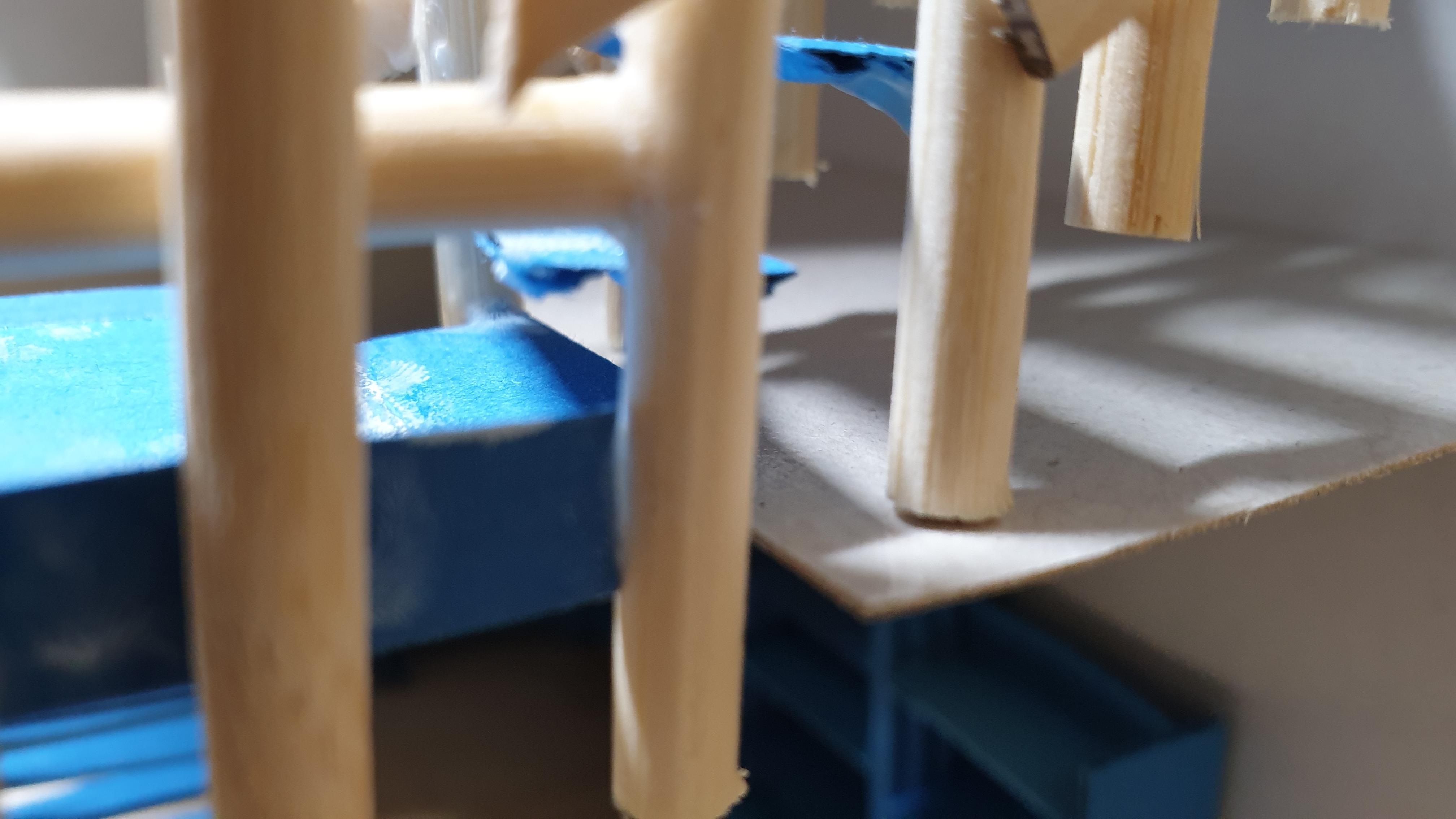 이렇듯 나무막대 난간과 집어넣은 냉동피자 상자가 닿는 방식으로 증축한 2층을 부착할 생각이다.