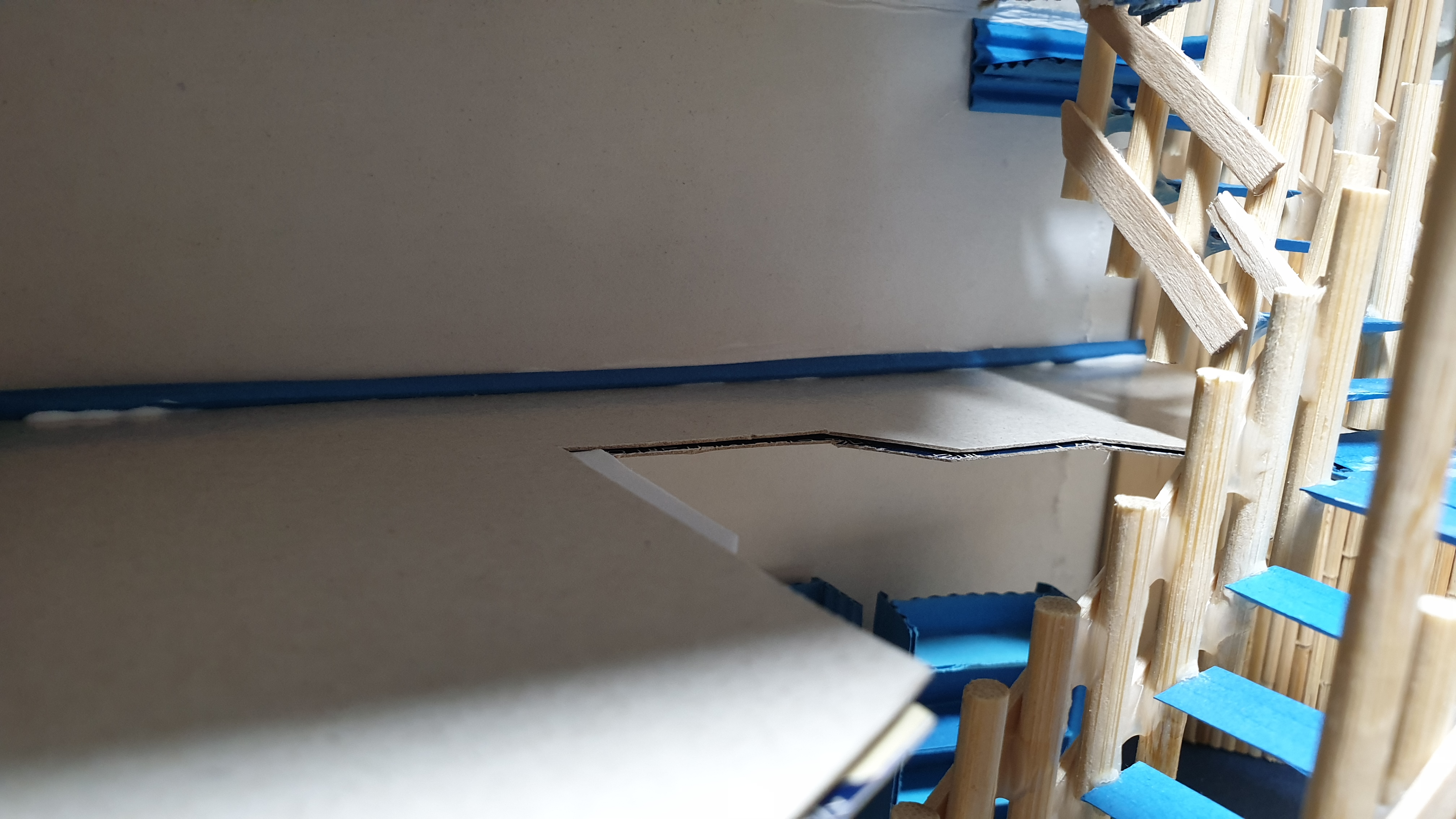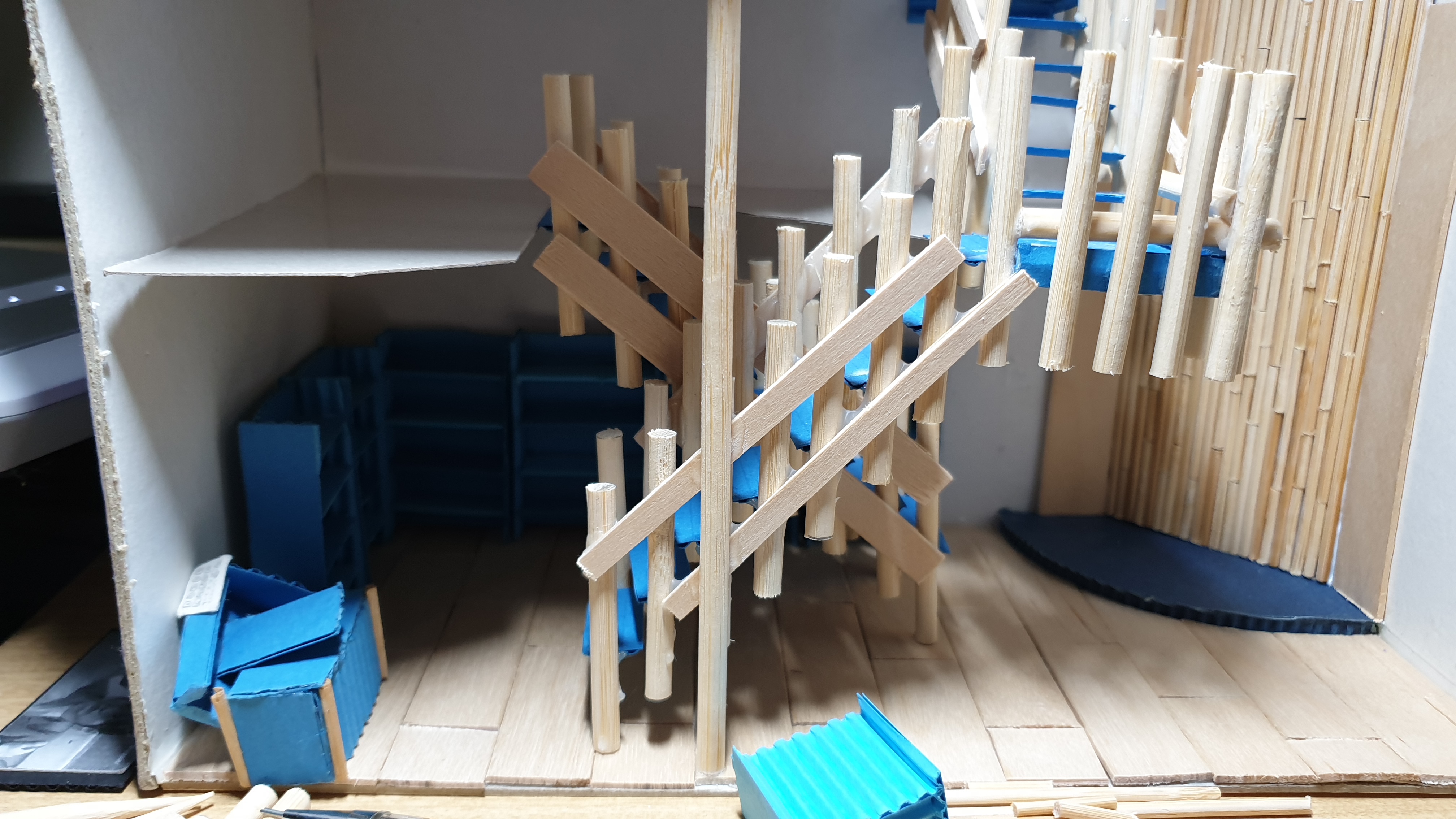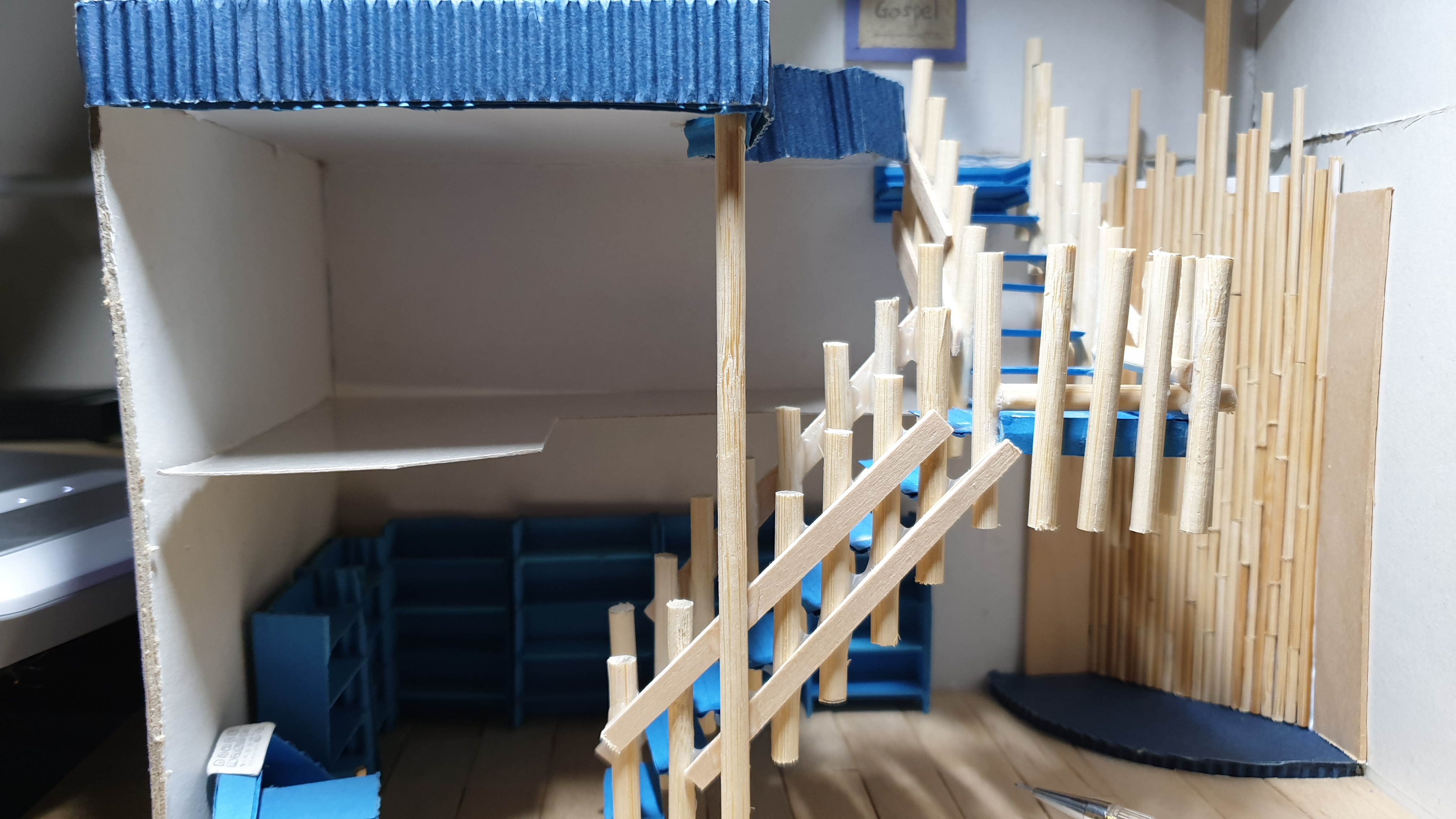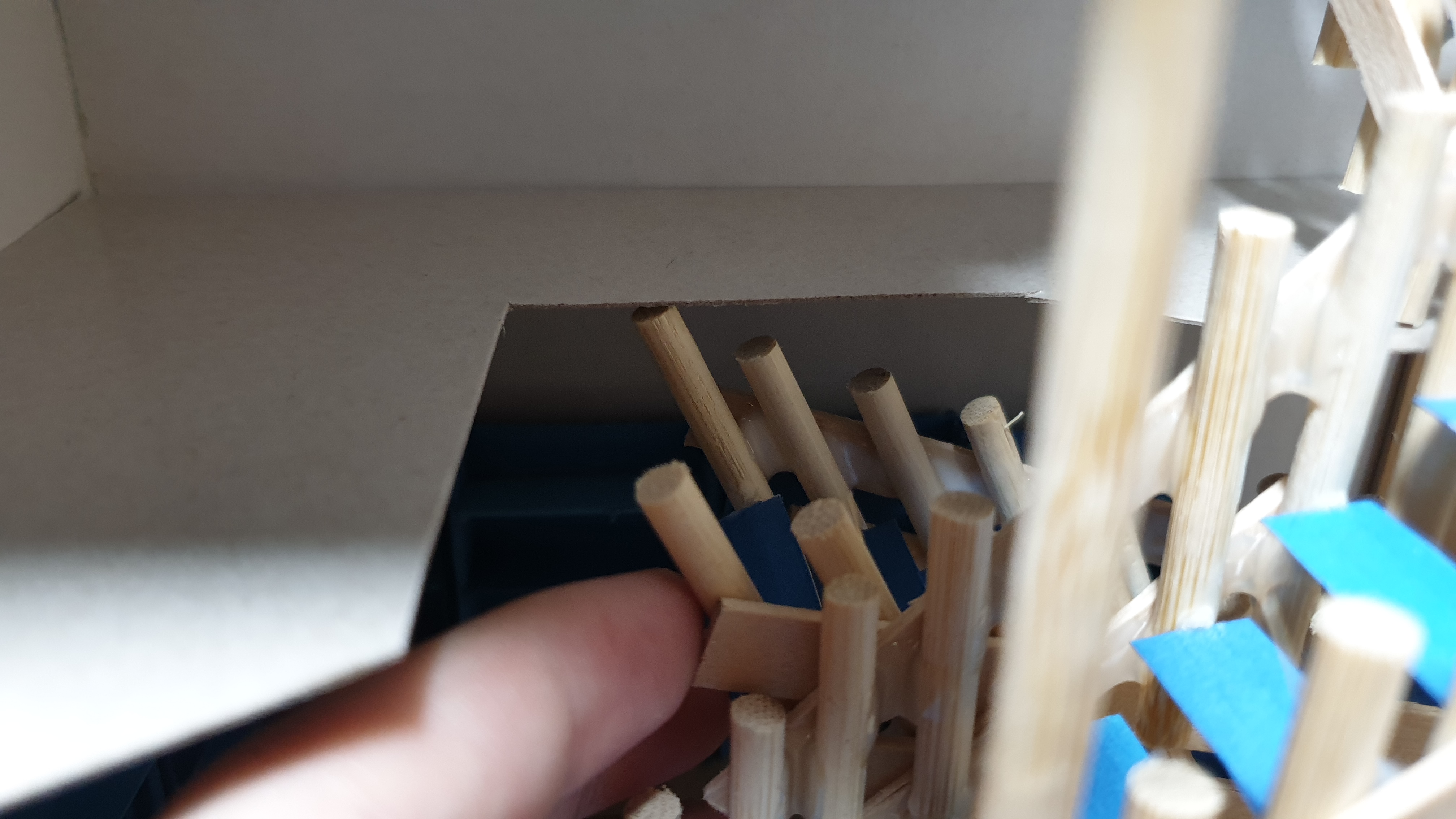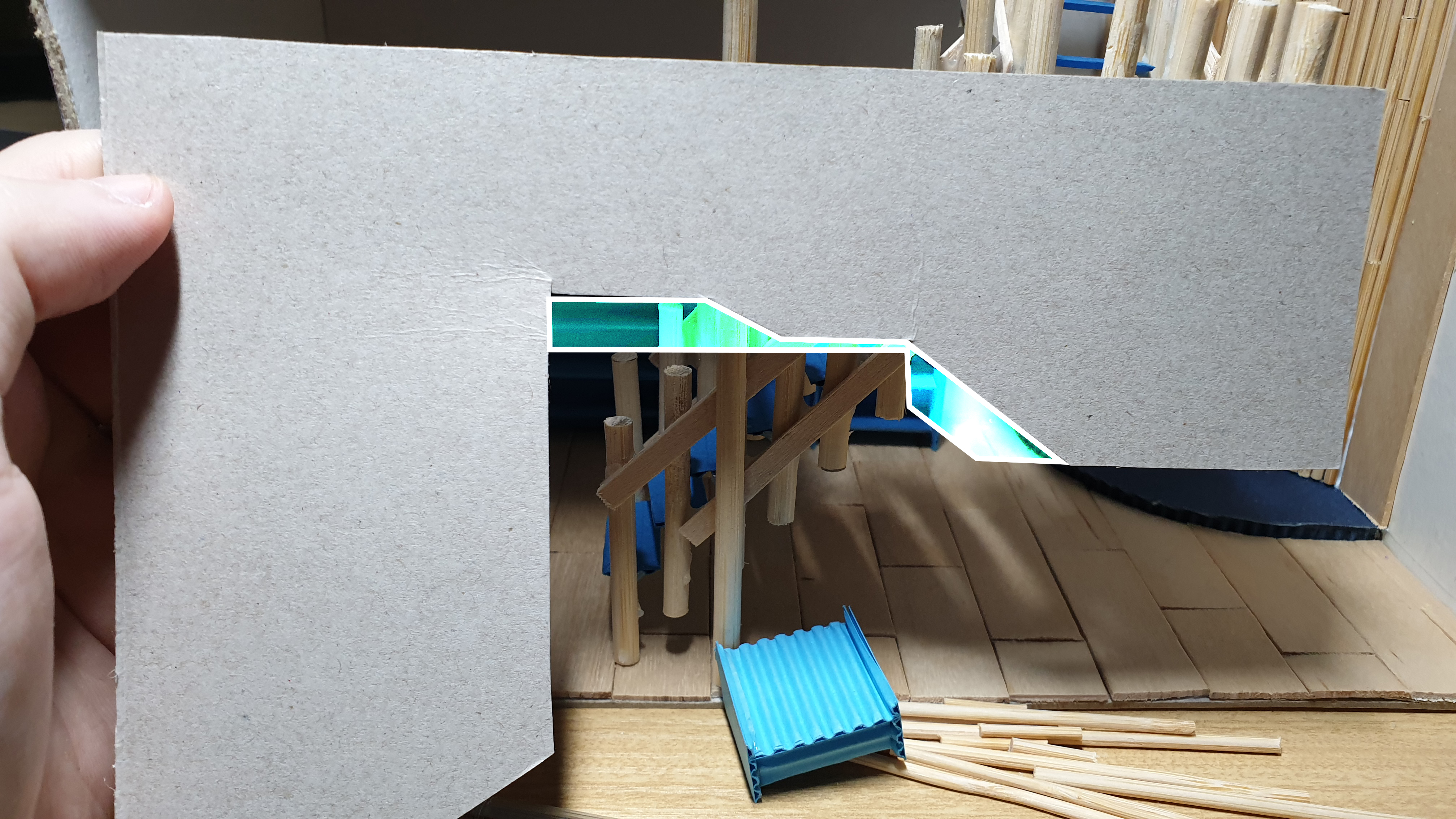 이렇듯 나무막대 난간과 집어넣은 냉동피자 상자가 닿는 방식으로 증축한 2층을 부착할 생각이다.