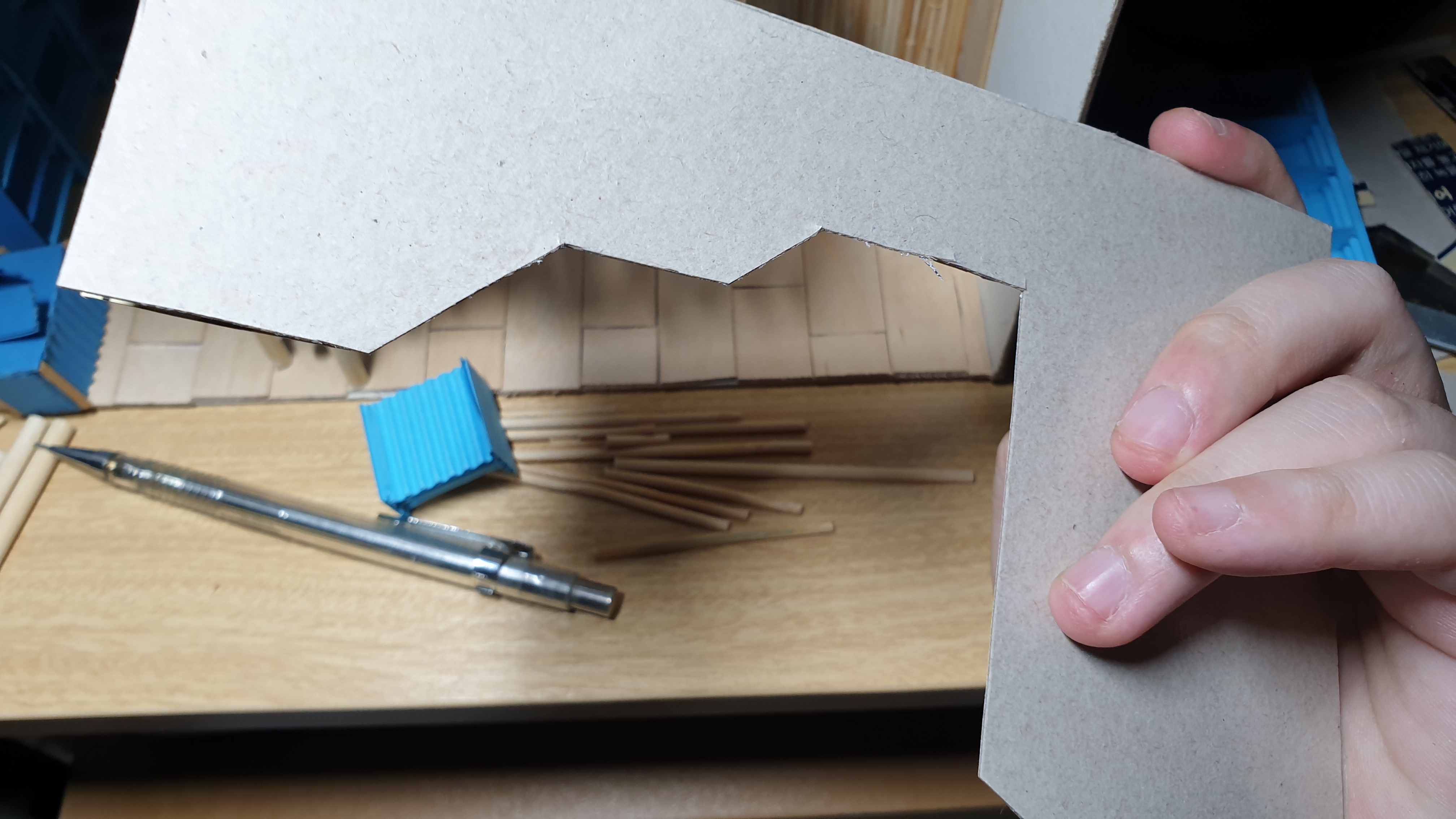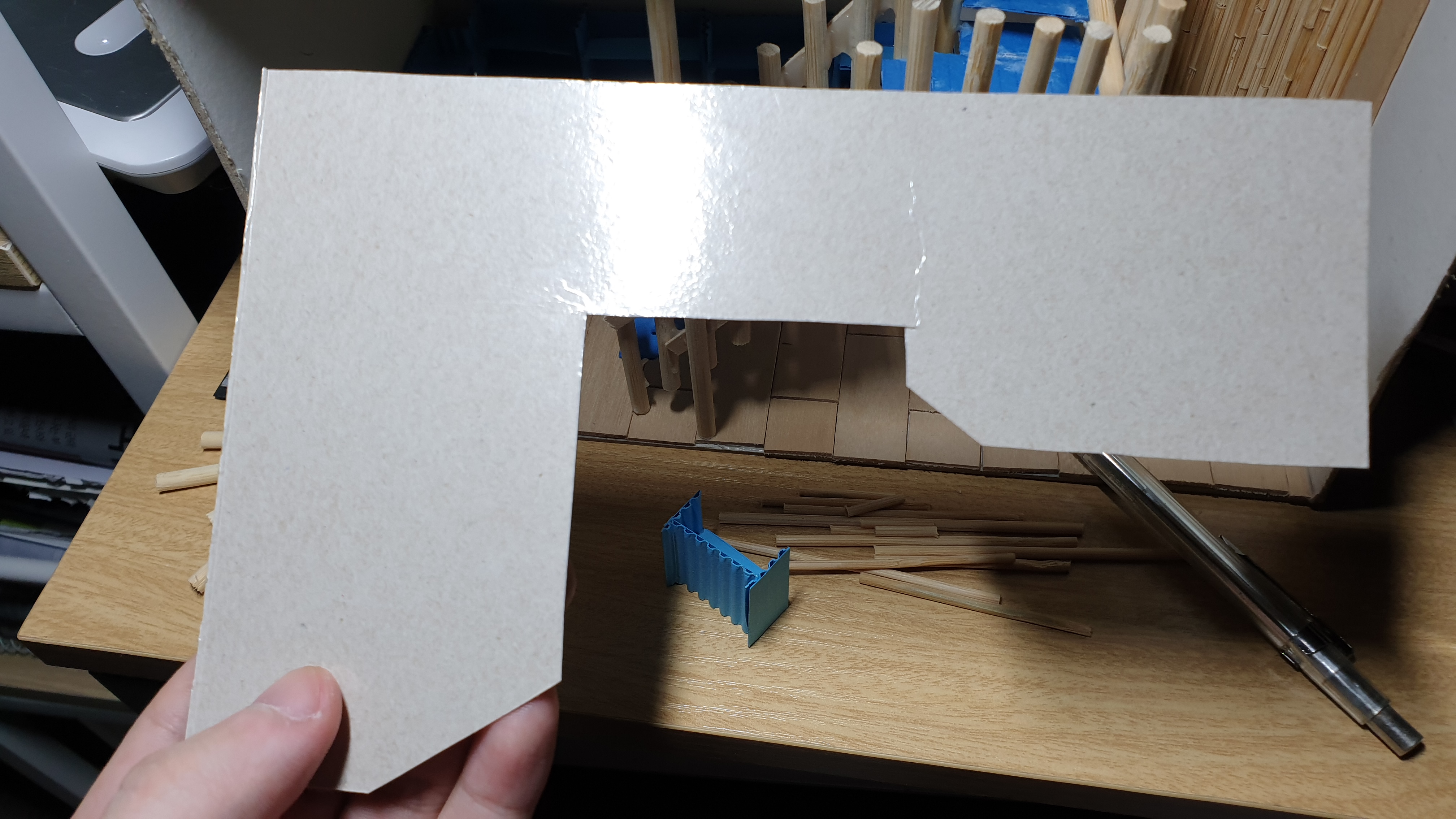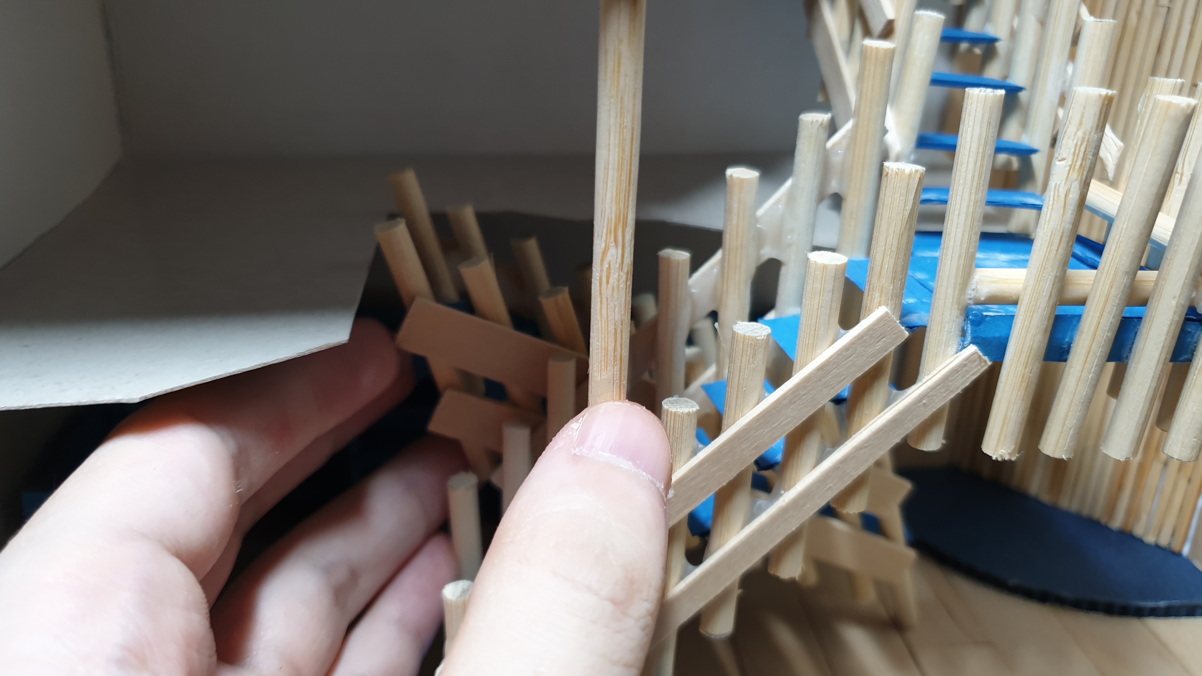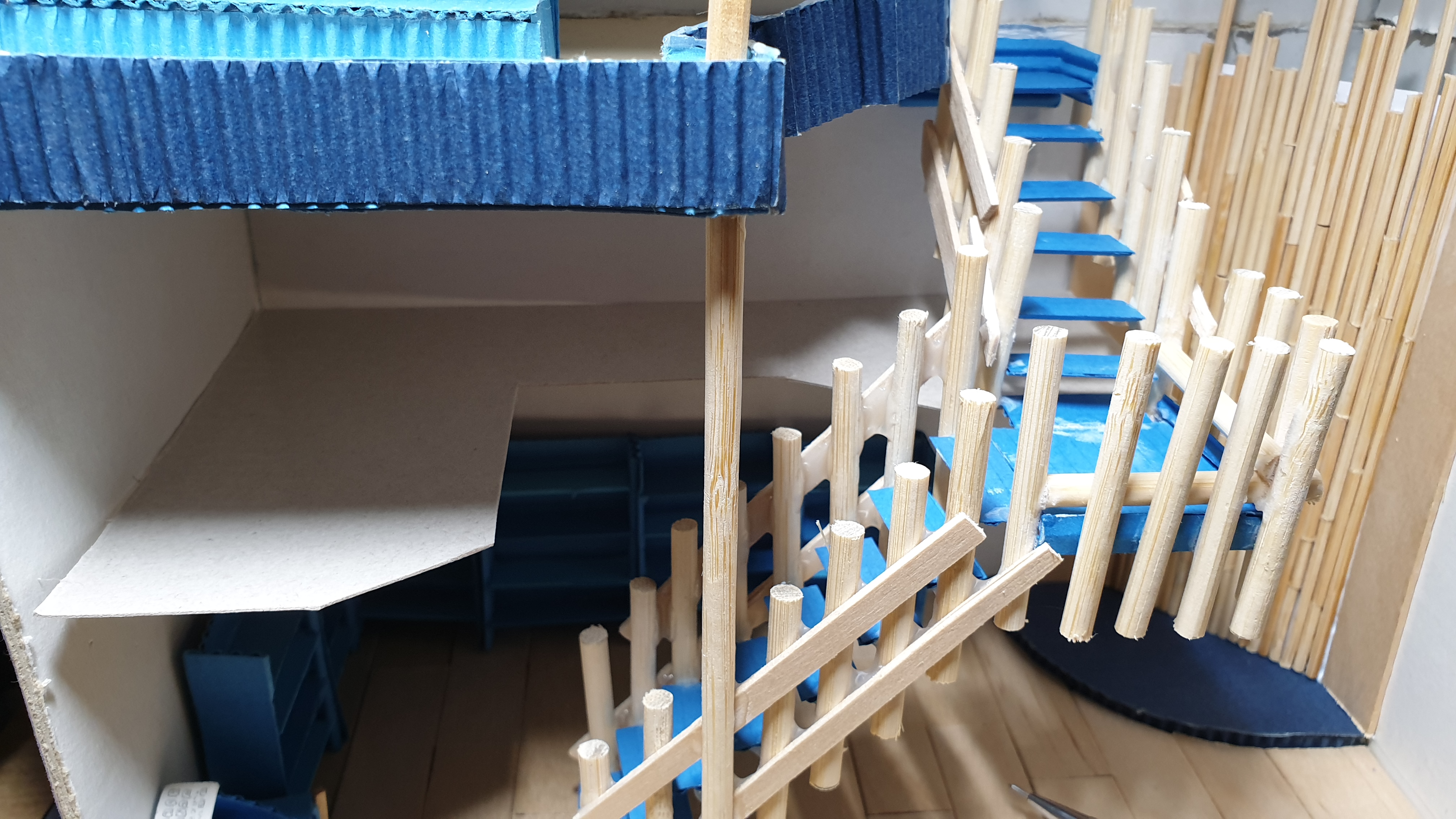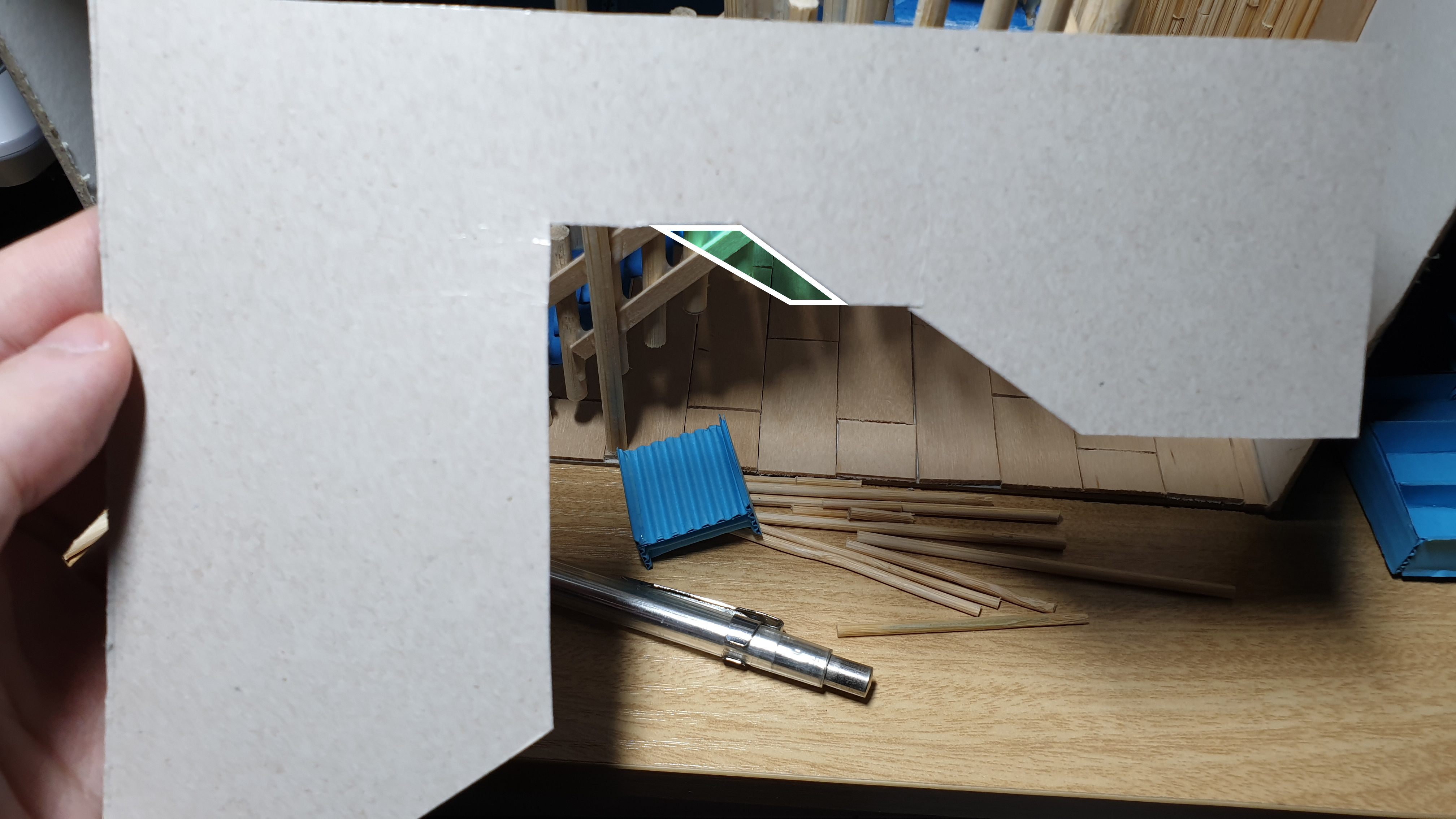 이렇듯 나무막대 난간과 집어넣은 냉동피자 상자가 닿는 방식으로 증축한 2층을 부착할 생각이다.