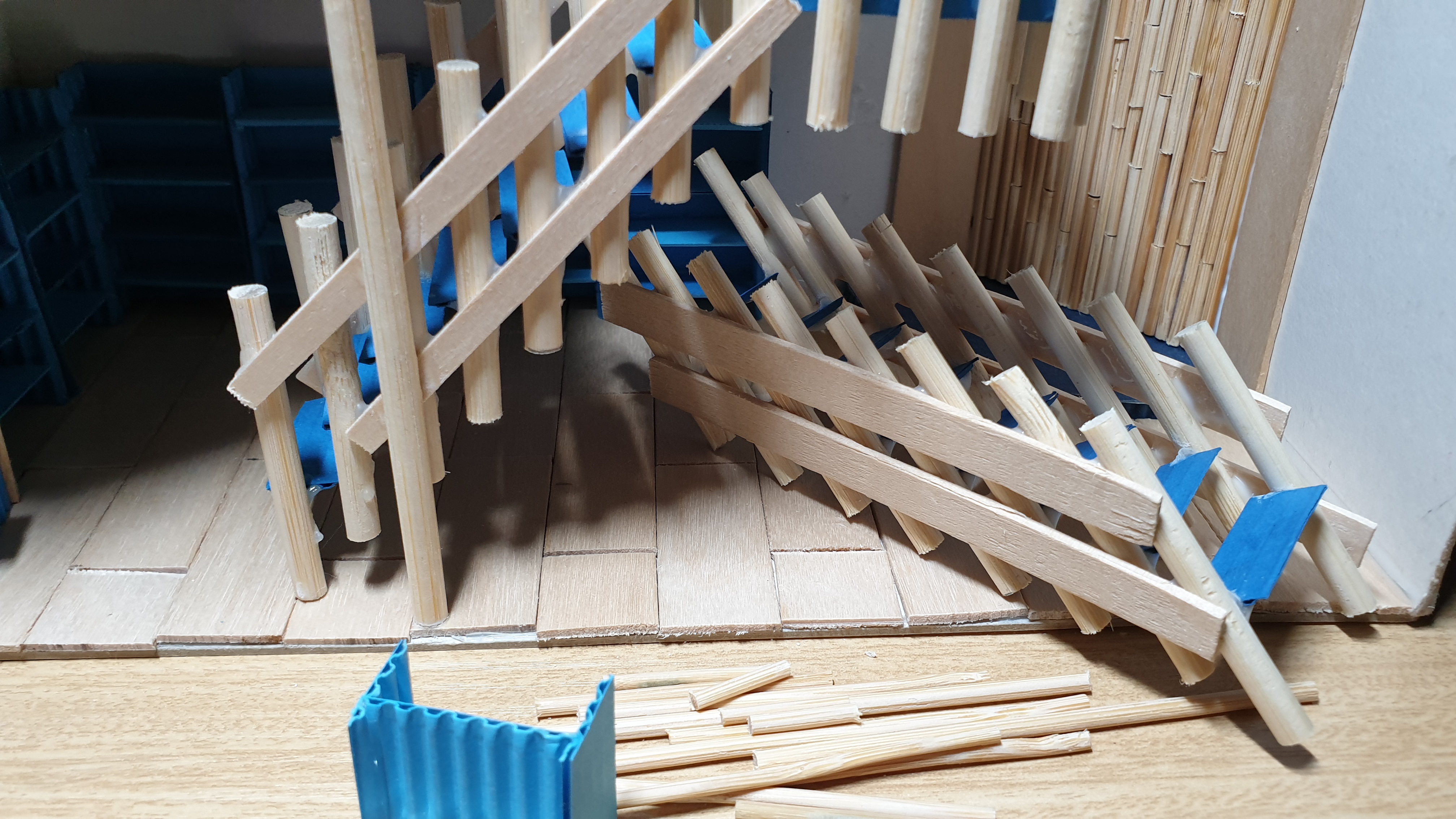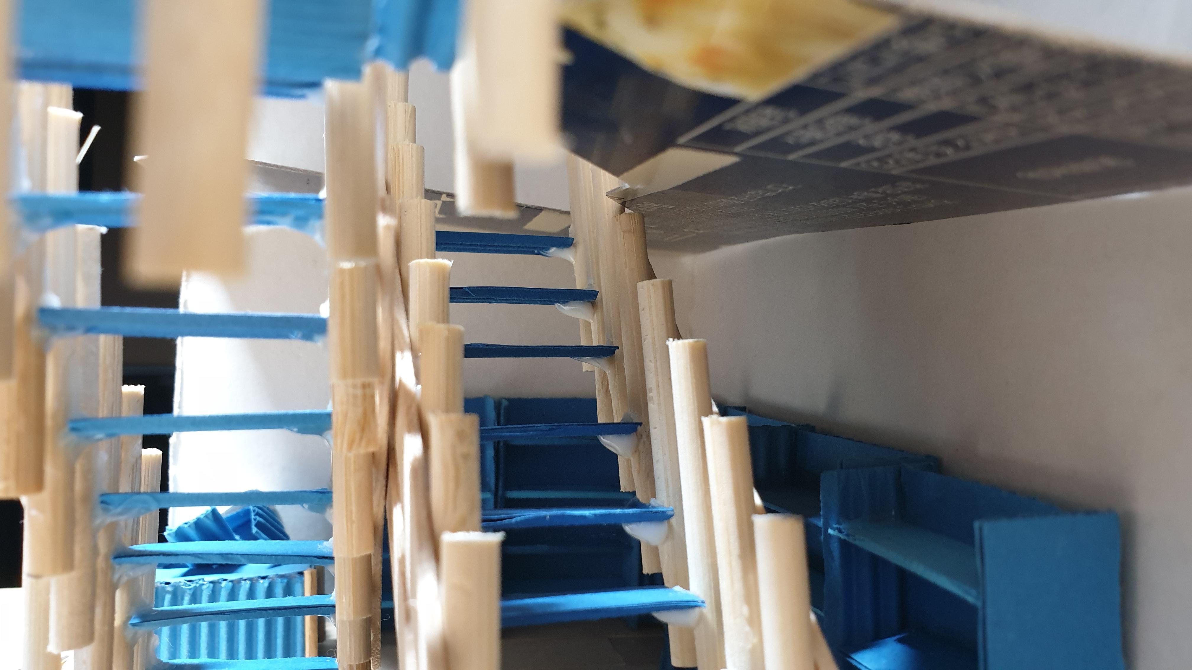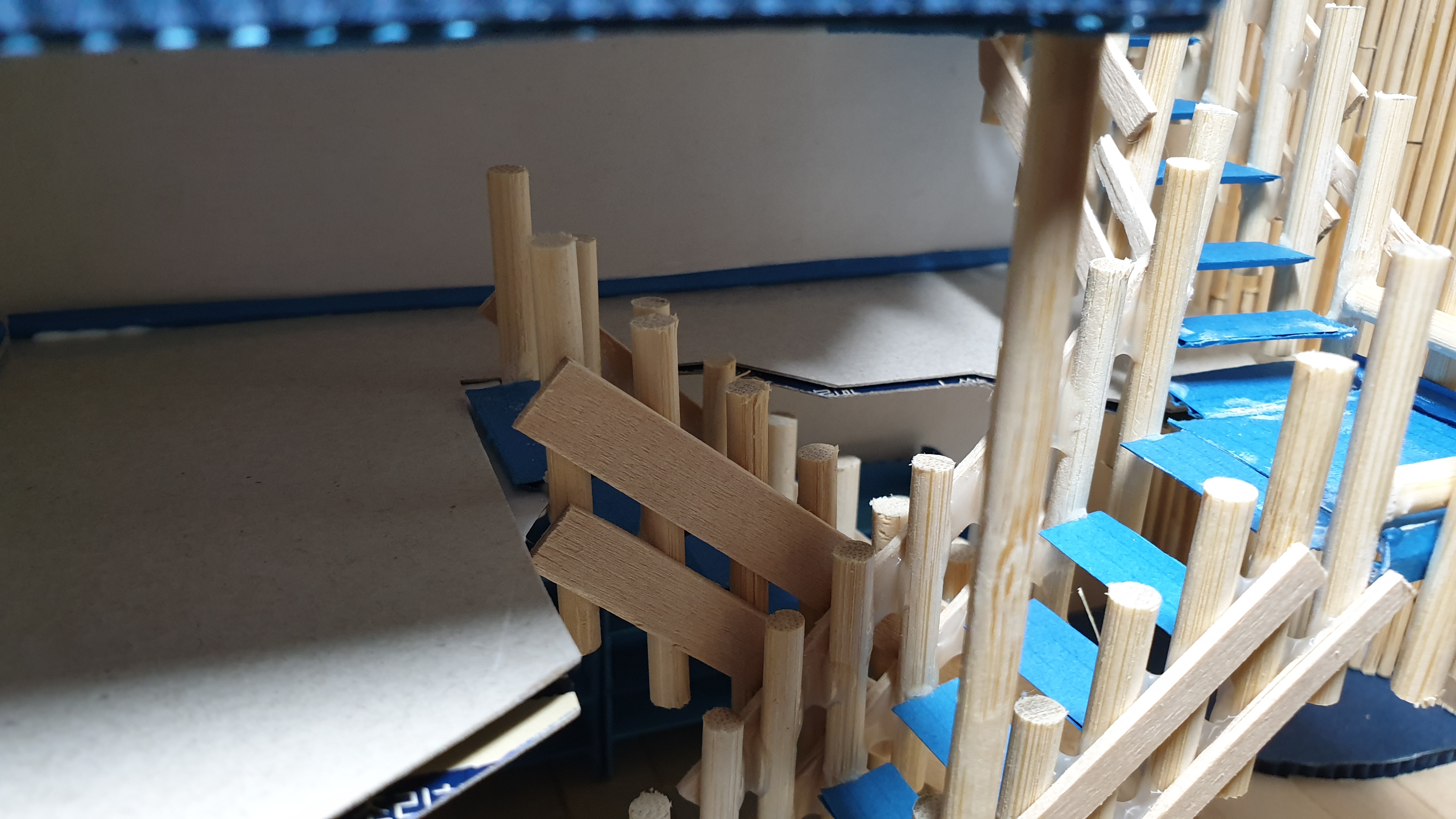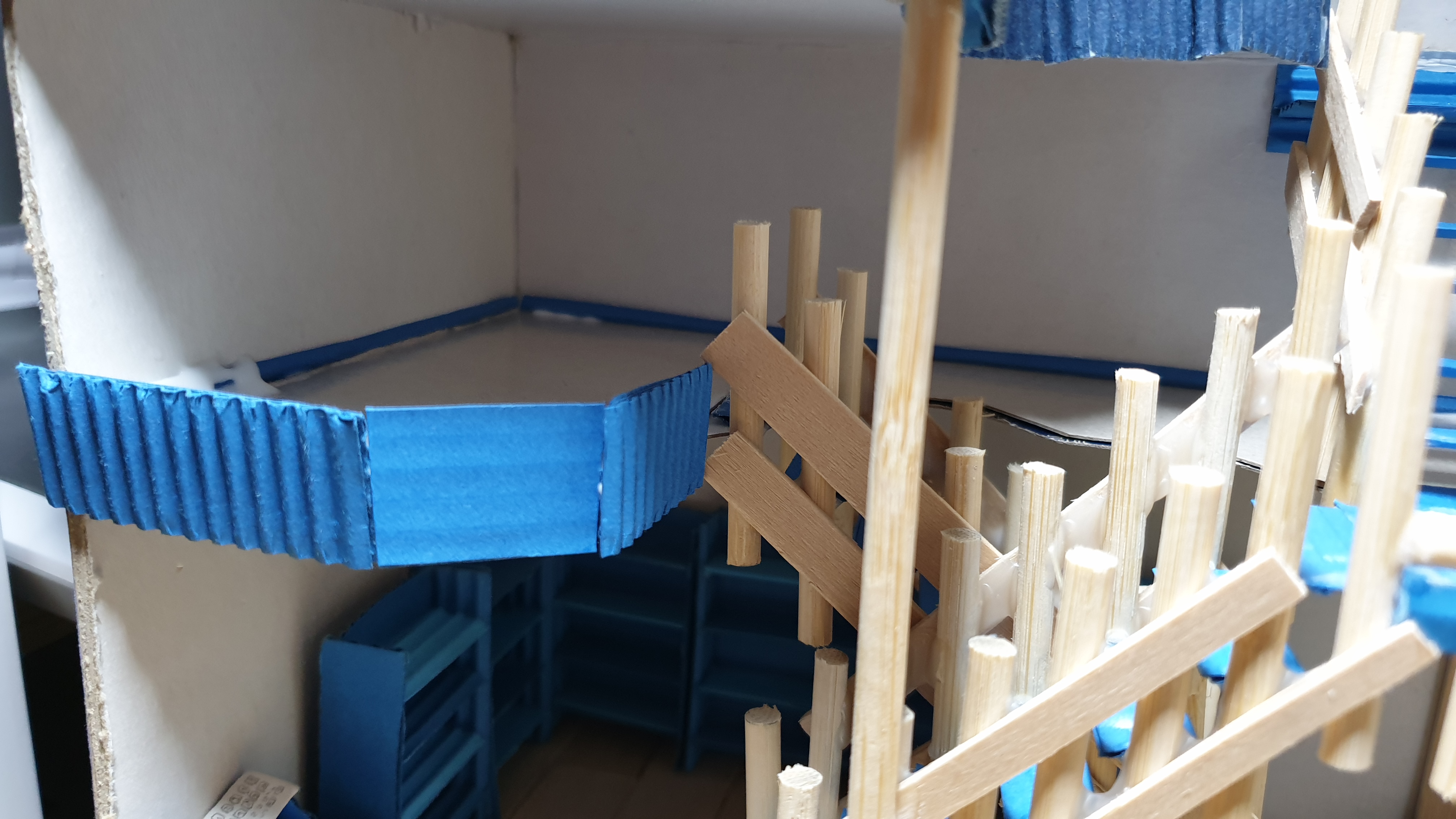이렇듯 나무막대 난간과 집어넣은 냉동피자 상자가 닿는 방식으로 증축한 2층을 부착할 생각이다.