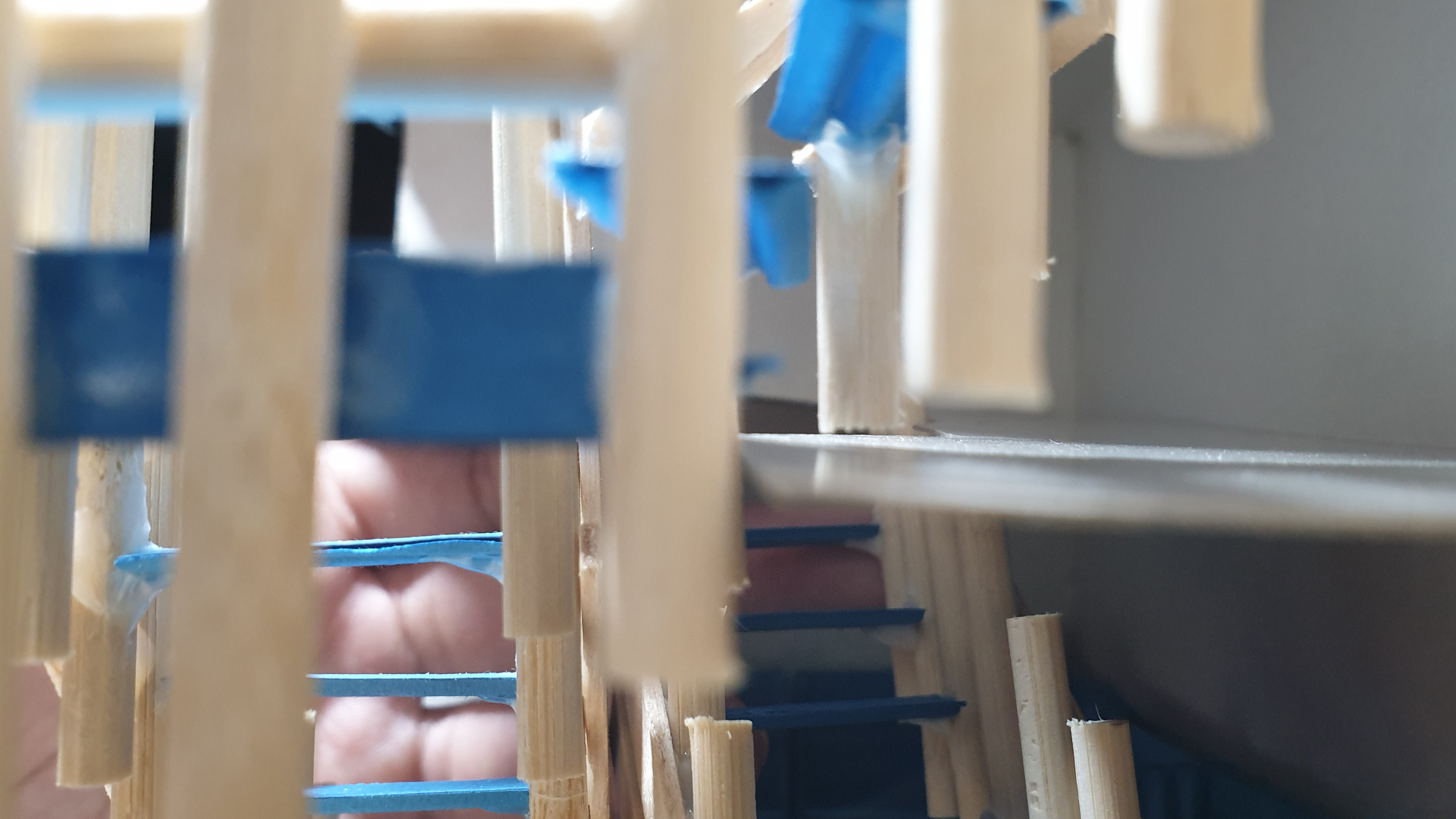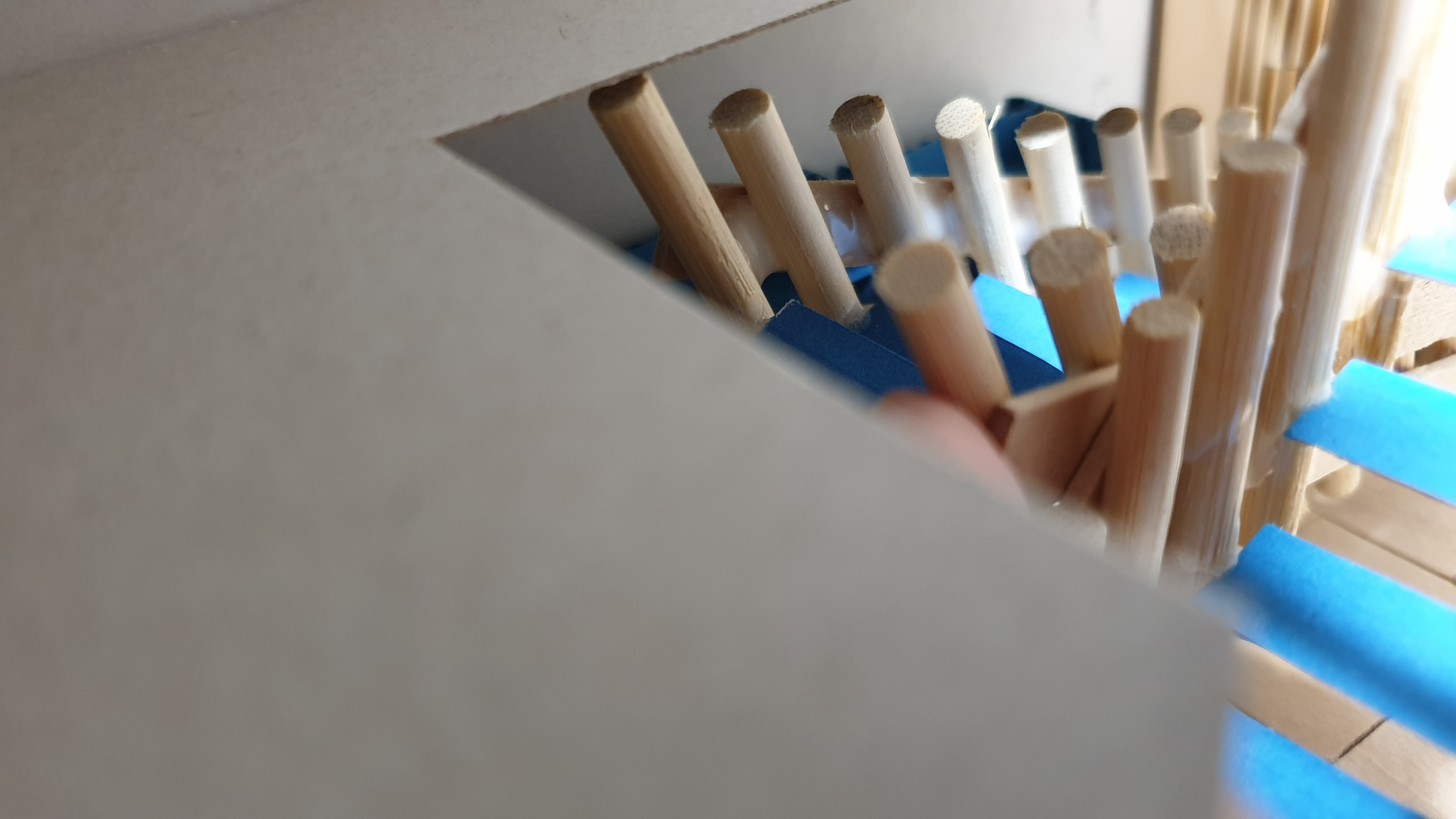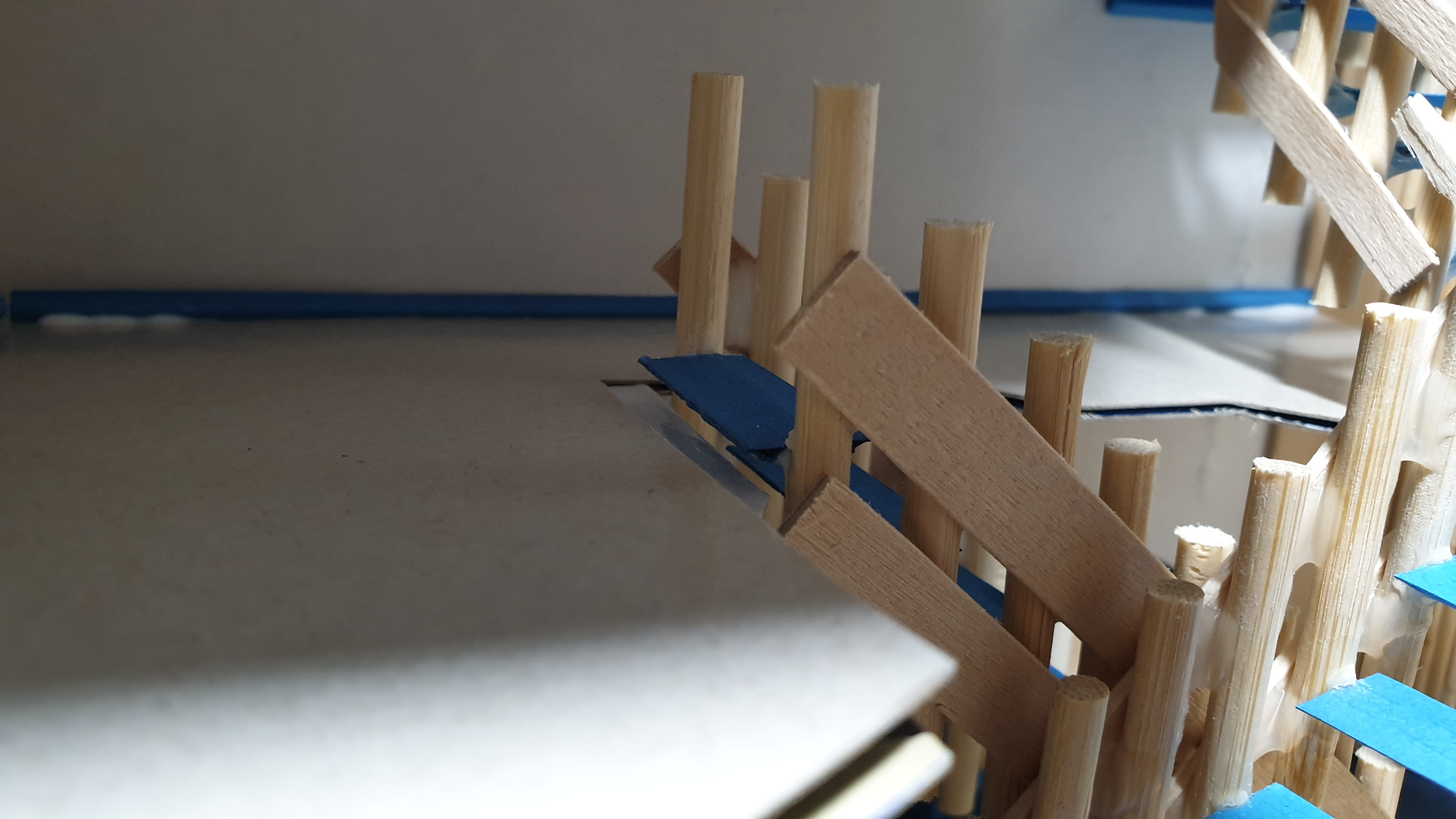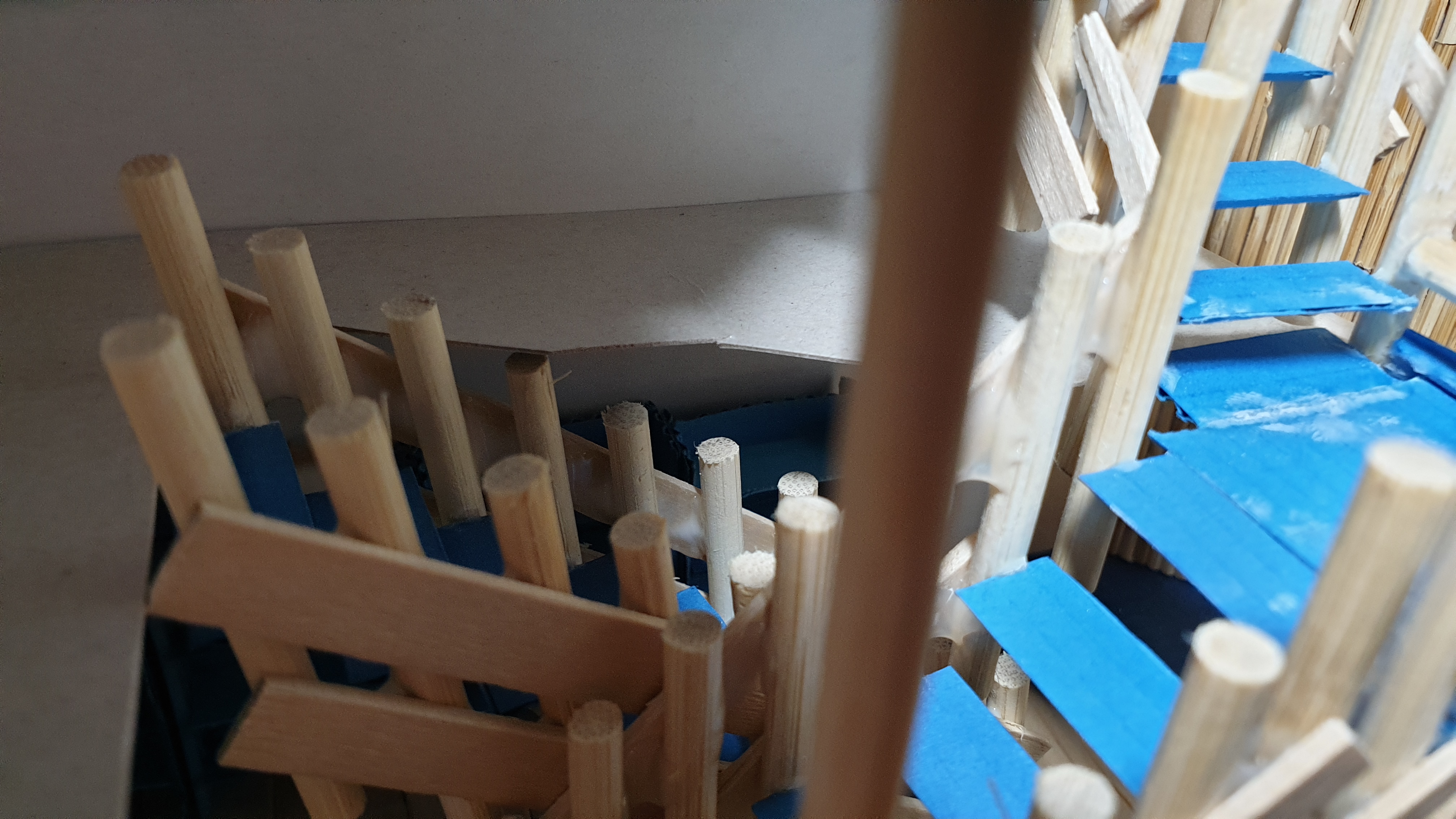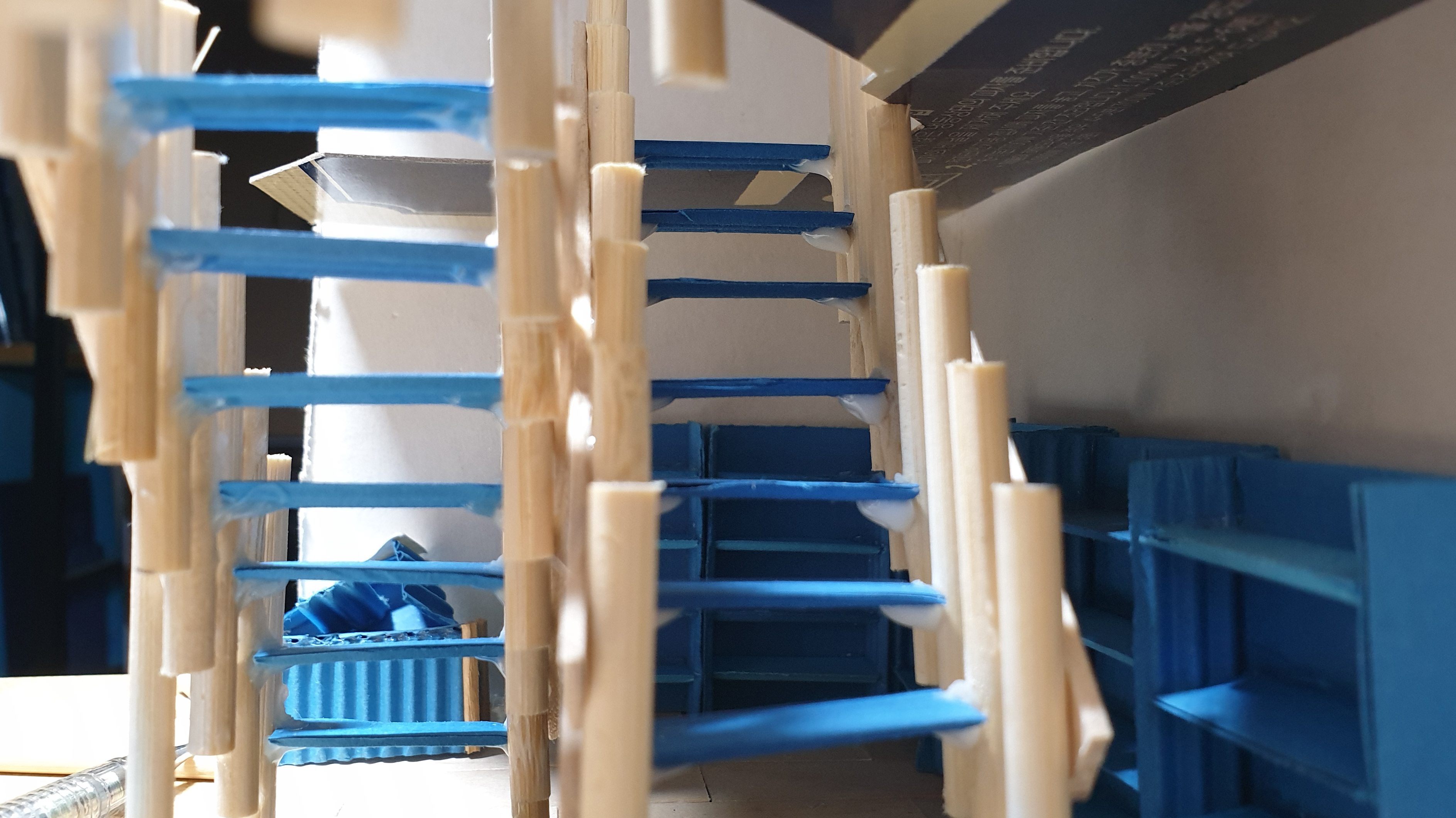 이렇듯 나무막대 난간과 집어넣은 냉동피자 상자가 닿는 방식으로 증축한 2층을 부착할 생각이다.