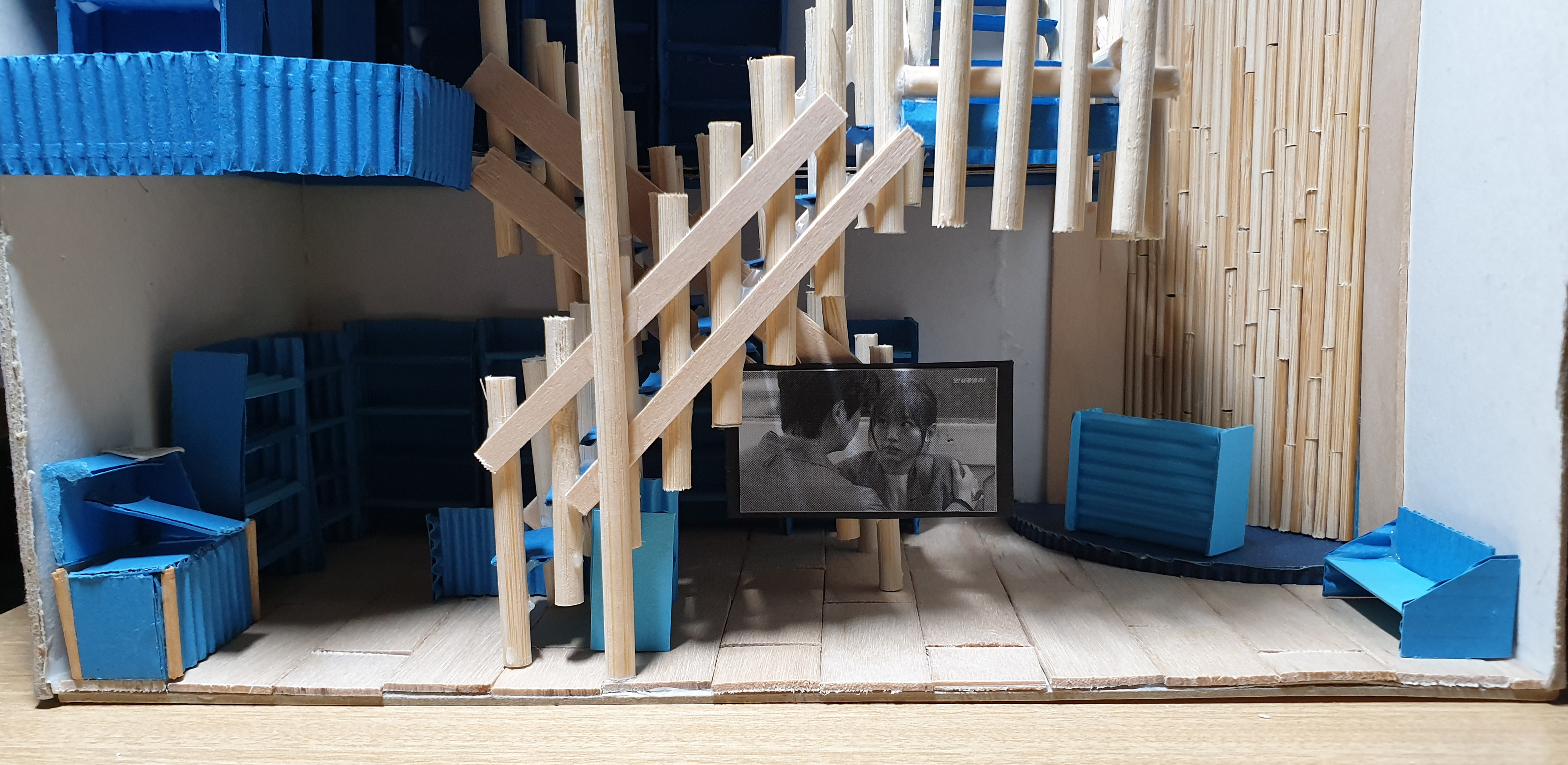 나무 막대 벽지에 텔레비전을 달아주려고 했으나, 끝내 달아주지 못했다. 1층 거실이자 로비로 사용하며 동시에 강연장으로 사용하면 좋겠다고 생각했기 때문이다.