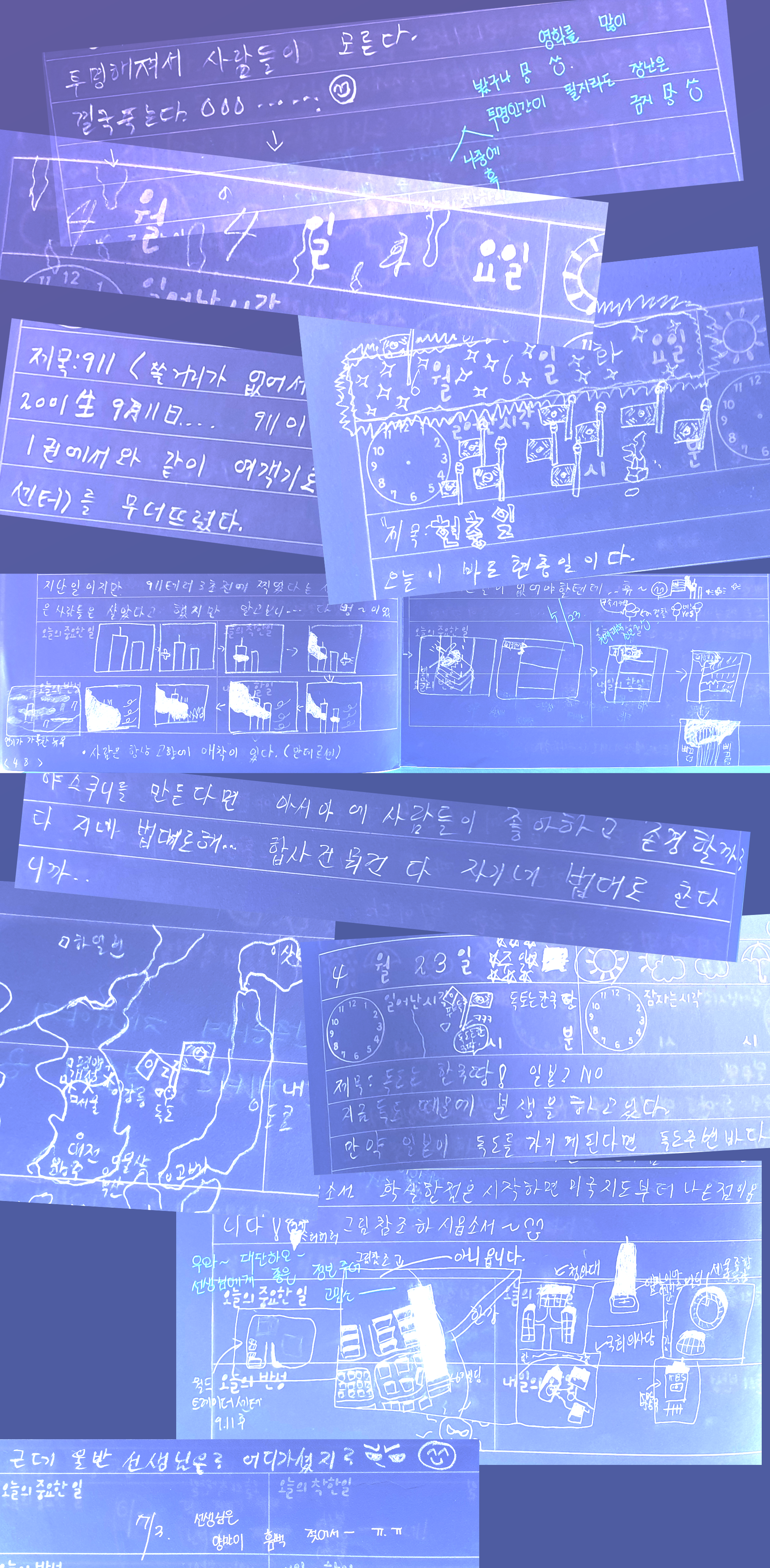 그 일기들을 모아보면 나는 정치와 사회, 재밌게 갖고 놀던 프로그램에 무한한 관심을 보인 초등학교 6학년 소년으로 보였다. 처음 발 디딘 위성사진, 콩나물과 구글어스로 바라본 화려한 세계 각국의 도시, 911테러 음모론보다 월드트레이드센터(WTC)가 무너진 기술적 이유에 주목했고, 독도가 한국 영토인 사료, 야스쿠니 신사참배를 반대했던 나라 사랑 소년은 매주 일요일 교회를 가던 신앙인이기도 했고 우리말을 사랑했다.
