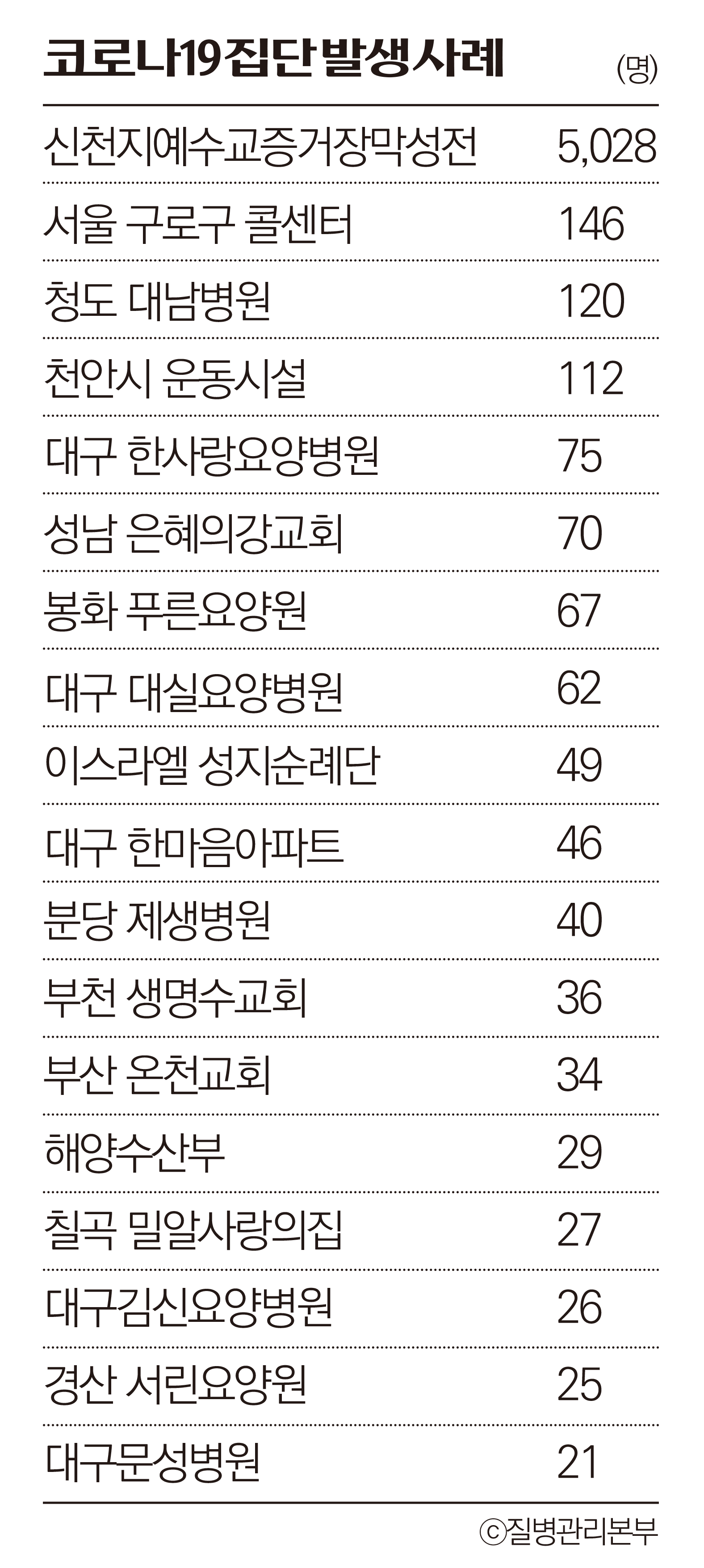 코로나 감염은 다중 시설 어디든 가리지 않고 발생했다. 요양병원의 경우 밀접 접촉이 잦고 병상이 독립되지 않아 의료진과 환자 간 감염 우려가 높다. 국내 첫 코로나 사망자가 발생한 청도 대남병원도 폐쇄병동이 붙어있는 구조여서 감염에 취약했다. 대구 한사랑요양병원과 봉화 푸른요양원, 분당 제생병원, 대구 김신요양병원, 경산 서린요양원도 20명 이상 집단 감염됐다.