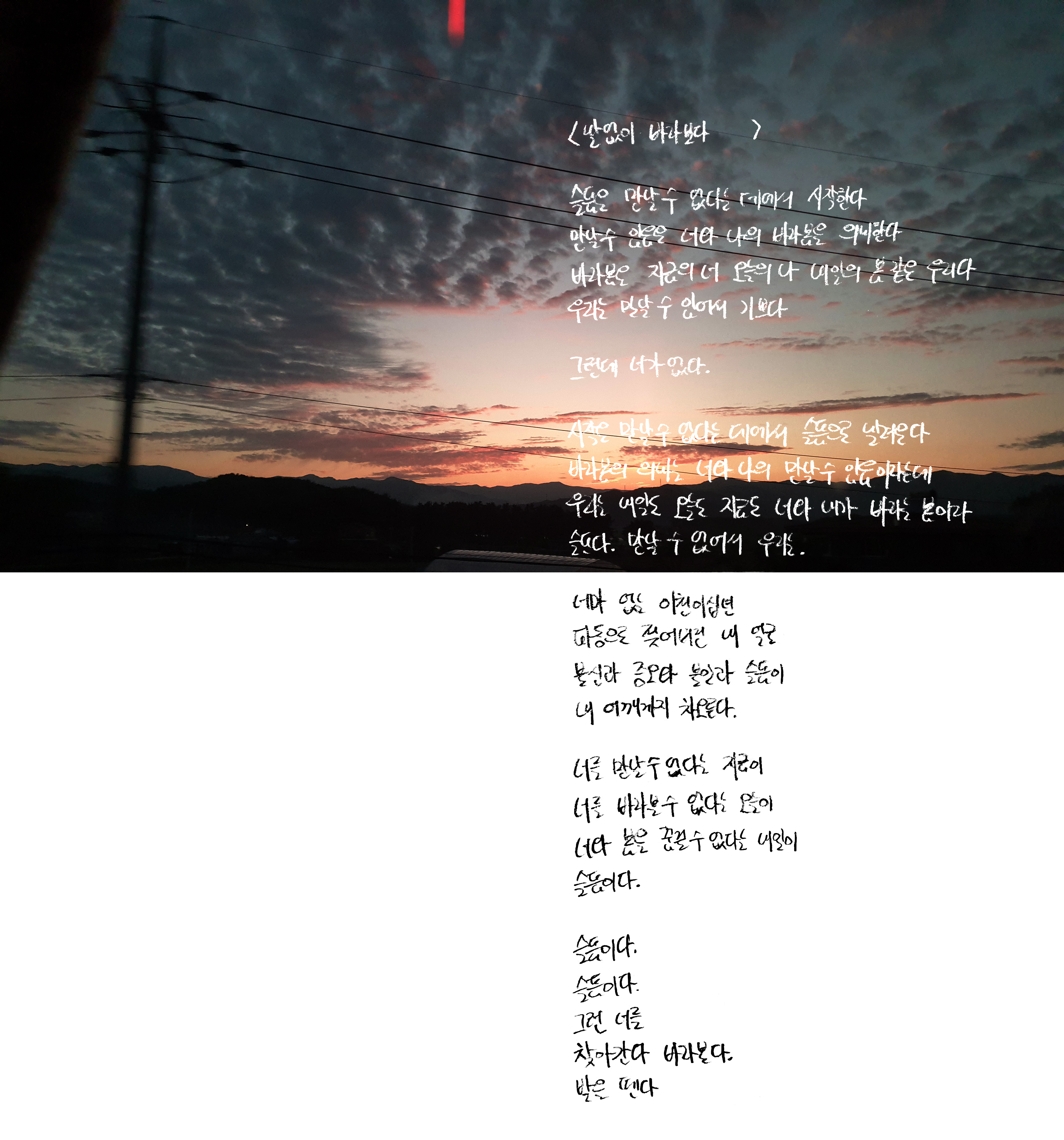 사랑으로 하나 되고 연결된 느낌 속에서 삶의 의미를 되찾습니다. 사람은, 인간은. 사랑하기 위해서 살아가는 존재인거죠. 따라서 다시금 사랑하는 무언가가 있었는지 물었습니다. 사랑이 저를 하나 되게 만드는 무언가를 두리번거렸습니다. 그리고 찾은 것 같습니다. 시간의 경과를 보아야하겠죠. 살얼음판 같은 이 사회에서 진짜와 가짜로 나뉘는 만들어진 사랑보다 이미 존재하는 사랑에 귀 기울여야 한다는 설렘을 기록하고 싶었습니다. 따라서 제가 보고 느낀 그 사랑을 기록하겠습니다. 코로나로 보지 못했던 오히려 코로나로 보았던 풍경을, 사랑을, 절망과 아쉬움을, 지키지 못한 세계에서 보았던 파수꾼의 절절함을 외면하지 않겠습니다.