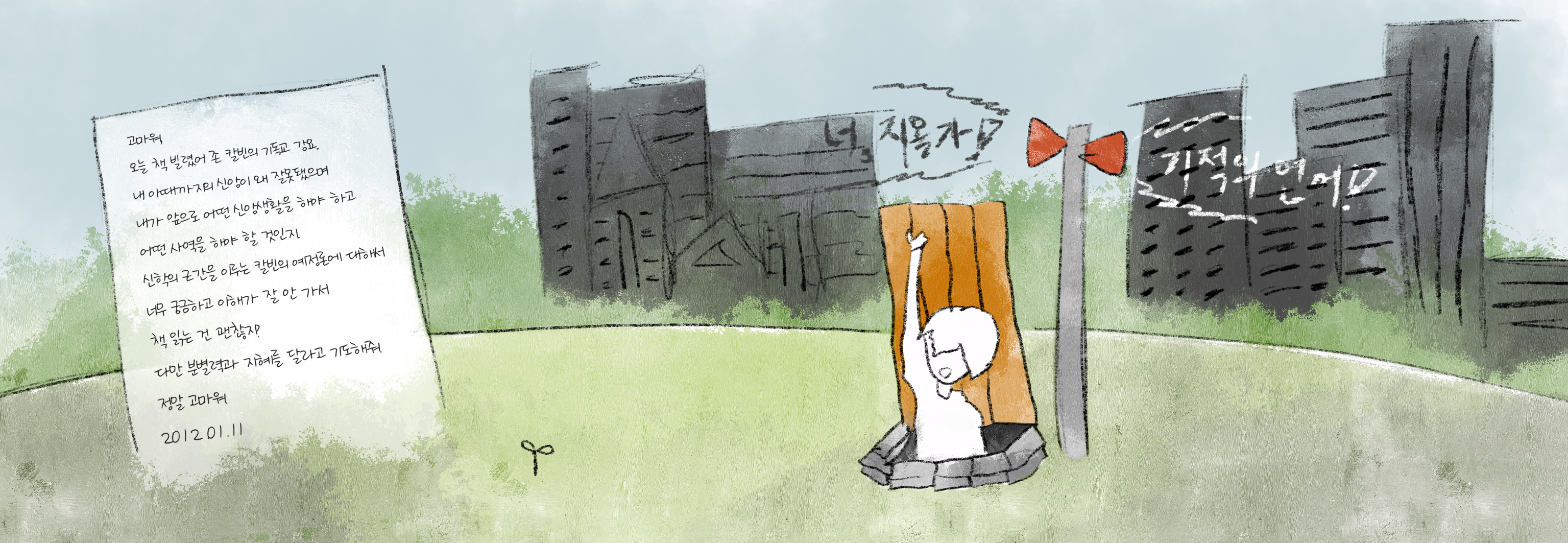 누나는 “어느 정도로 영적으로 살아야 하는지 도통 지혜가 나오지 않는다”고 고민을 털었다. 학교에서 성경을 직접 읽을 시간에 누나는 ‘기독교 강요’에 도전했다. 혹시나 교리를 집대성한 칼빈에게서 진리를 발견할 수 있지 않을까 하고. 이쯤이면 읽어도 되지 않겠냐고 내게서 허락을 구했다. 대답하지 않았다. 그 무렵, 교회를 나왔기 때문이다. 방송실 근무가 교회 분열에 불 질렀다. 전도사와 갈등을 빚고 인생 처음, 오랜 시간 교회를 나가지 않았다. 신학교로 향하려던 발걸음도 주춤했다. 서운함도 서운함이겠지만, 신앙을 유지하지 못한다는 죄책감이 영혼을 잠식했다. 침묵은 오랜 시간 이어졌다.