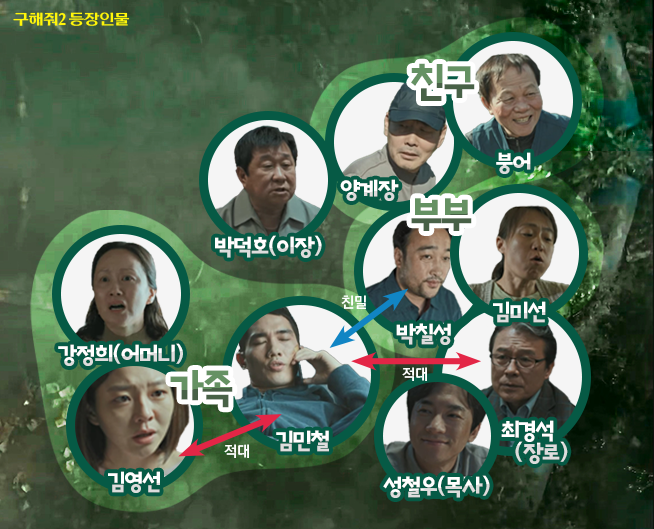 스포일러 주의 구해줘2는 사기꾼 전과자 최경석이 교회 장로로 변장해 댐 공사로 수몰할 예정인 마을 주민들의 이주정착지원금을 가로채는 내용이다. 구해줘1과 다른 방식으로 종교사기를 구사하고 좀 더 다채로운 한국만의 사회 문제를 배치해 흥미를 더한다. 배우들의 섬세한 연기는 트라우마를 불러일으킬 수준이고 차라리 연애로 희석시켰으면 좋았을 만큼 작중 현실의 벽이 자리했다.