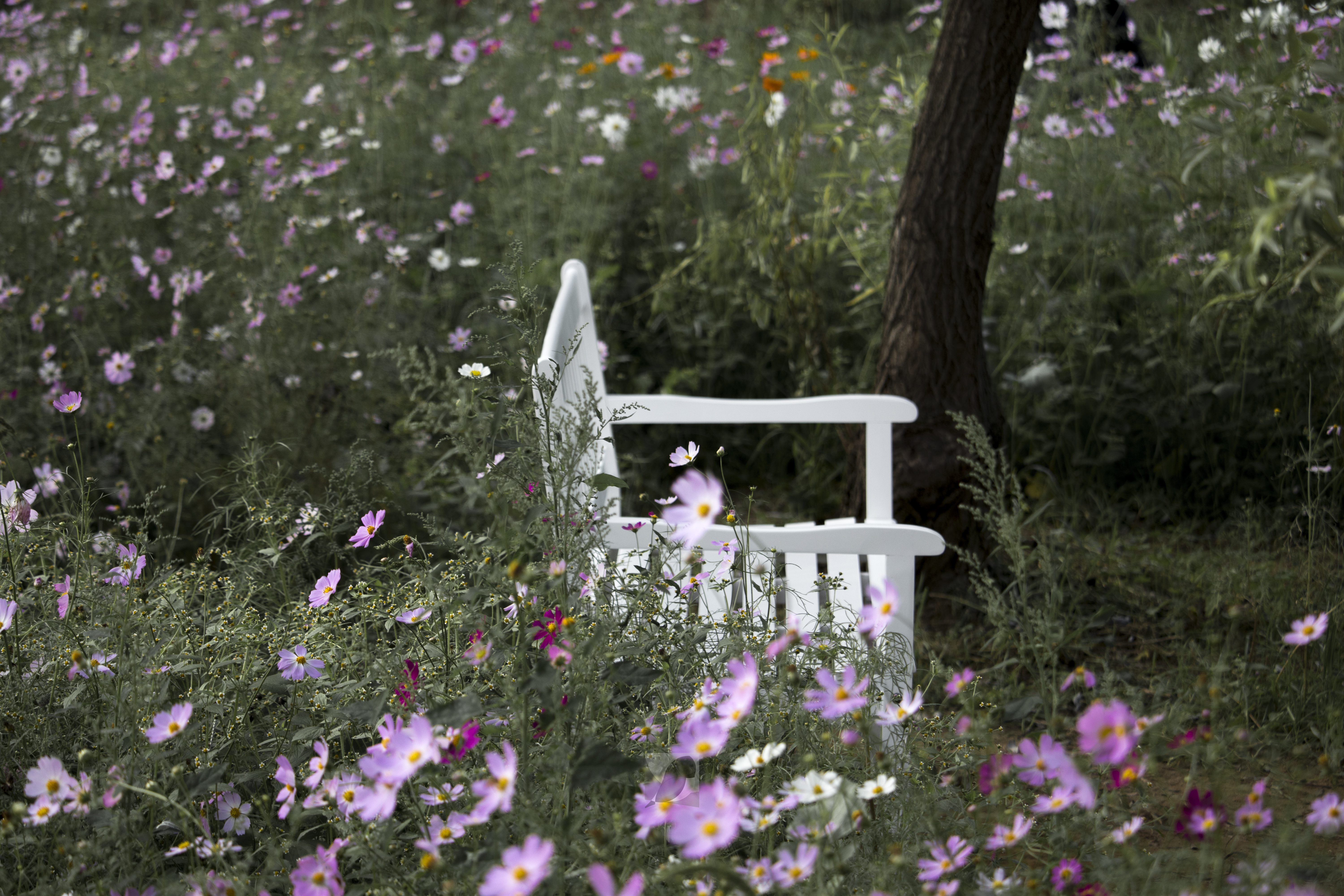 흰 나무 의자 사이에서 코스모스가 피어 있다. 코스모스 사이에서 인상적인 황색 코스모스.