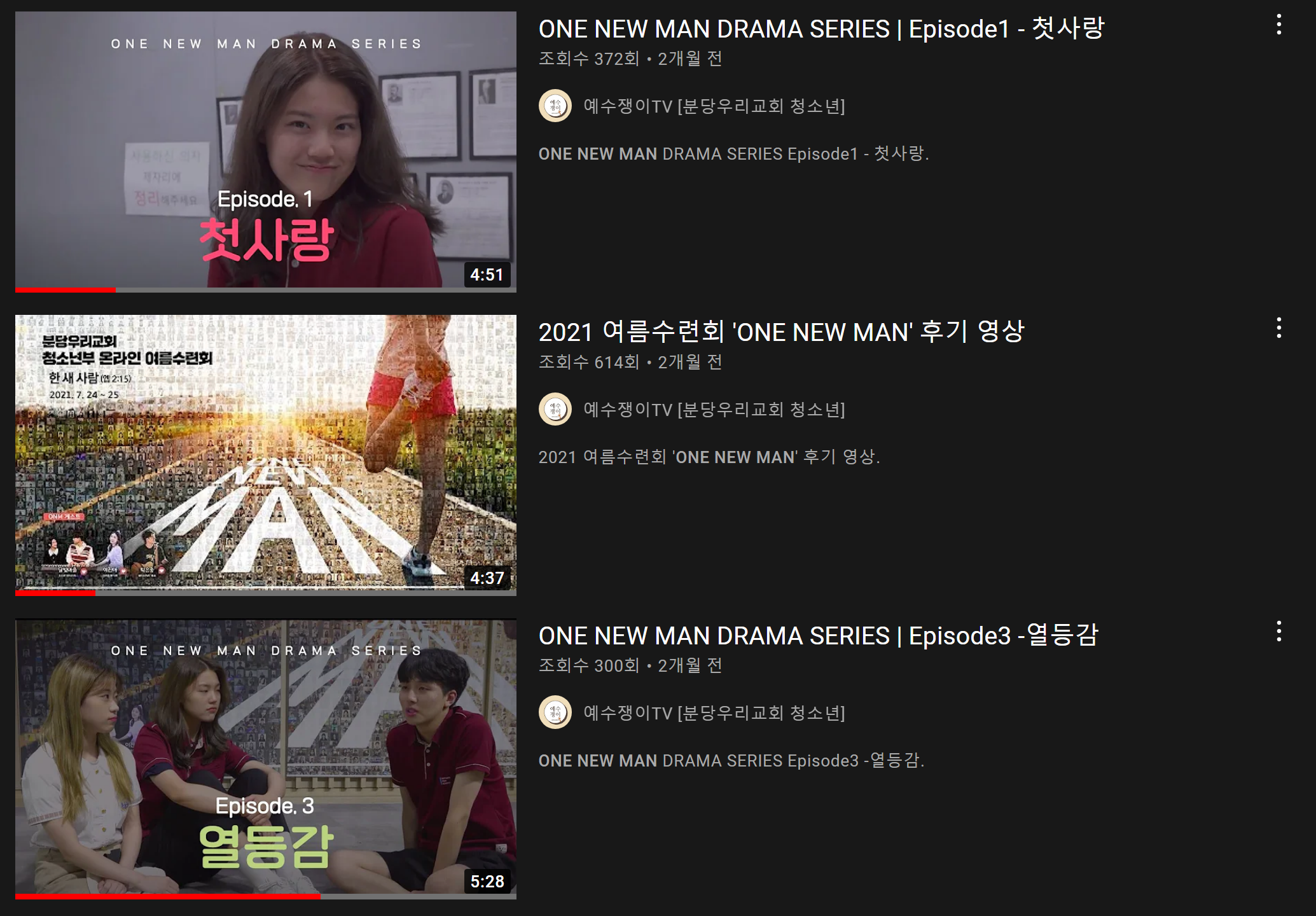 분당우리교회(합동) 청소년부는 여름수련회 한정 에베소서 2장 15절을 근거로 ‘one new man’ 드라마를 런칭했다. 청소년의 연애와 감정 문제를 다룬 웹드라마다. 실제 학생들이 배우로 참여했다.