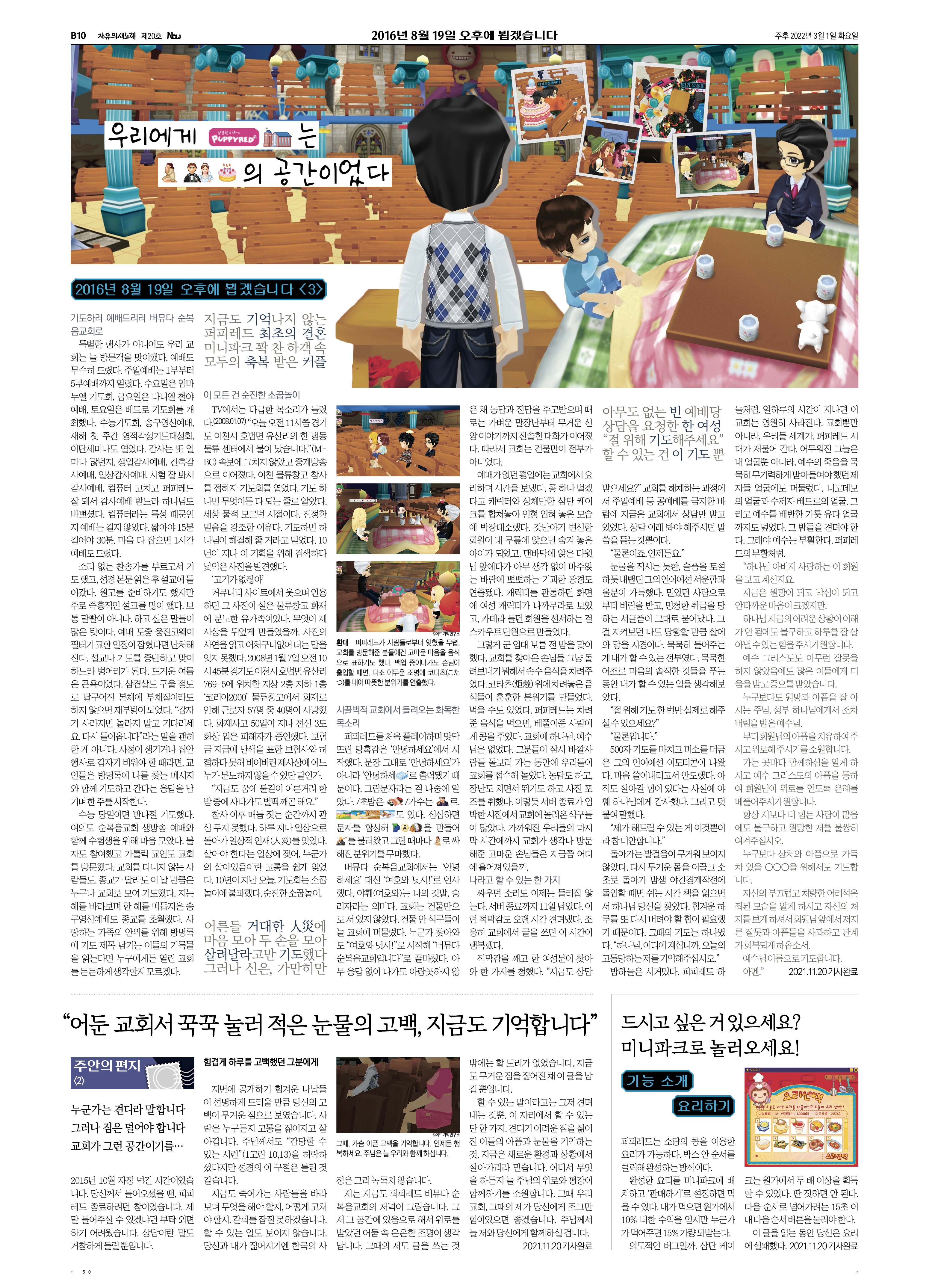 [2016년 8월 19일 오후에 뵙겠습니다] 우리에게 퍼피레드 교회는 기도와 결혼과 생일 축하 공간이었다 [2016년 8월 19일 오후에 뵙겠습니다] “어둔 교회서 꾹꾹 눌러 적은 눈물의 고백, 지금도 기억합니다” [2016년 8월 19일 오후에 뵙겠습니다] 드시고 싶은 거 있으세요? 미니파크로 놀러오세요! |