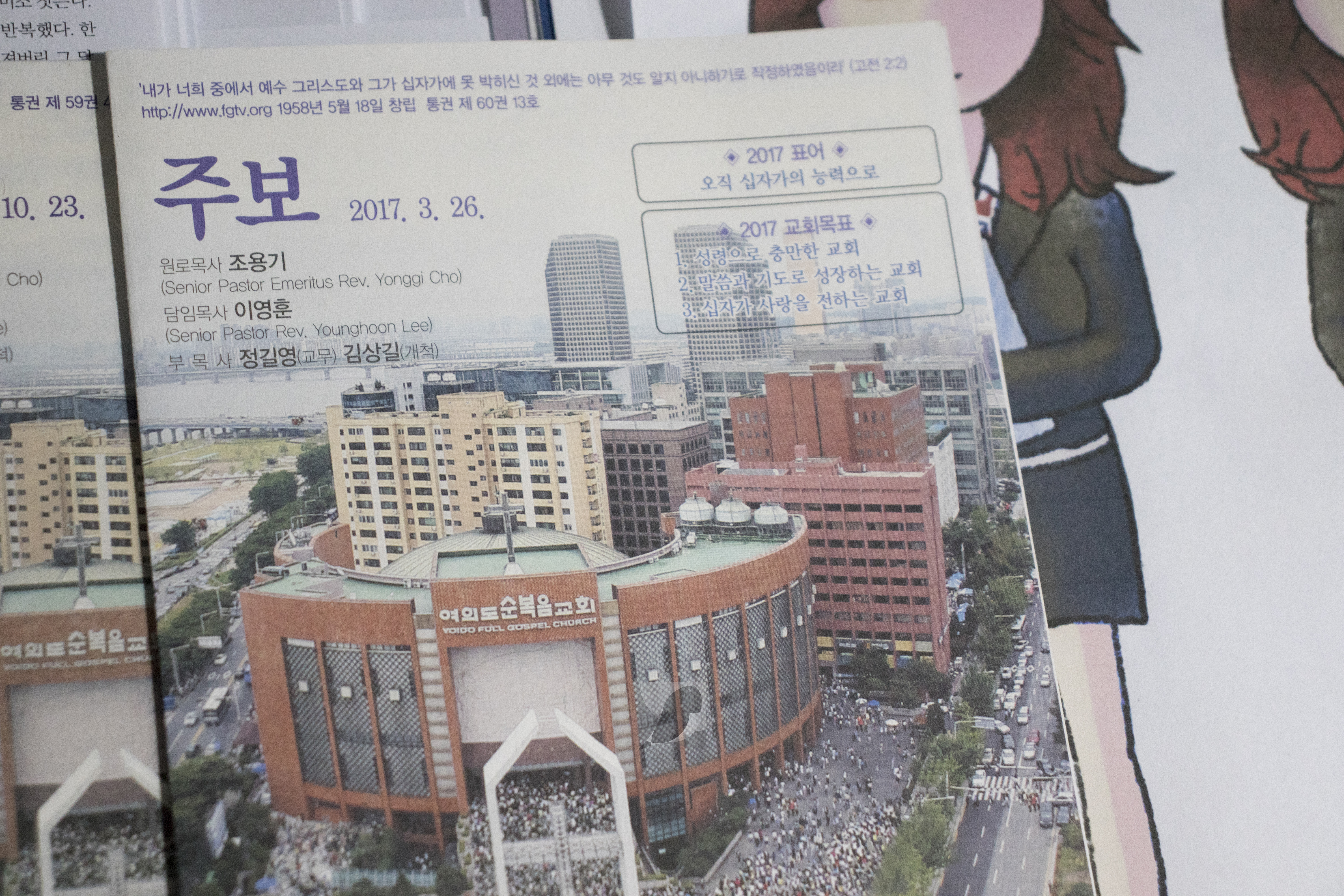 주보 1면은 거대한 빨간 벽돌이 돋보인다. 간단히 ‘주보’라 쓰인 용지 상단에는 ‘원로목사 조용기’ ‘담임목사 이영훈’ ‘부목사 이장균’이 있으나 조 목사 사후에는 위임목사 이영훈, 부목사 순으로 바뀌었다. 제일 위에 ‘설립자 조용기 목사’ 문구가 들어간다.