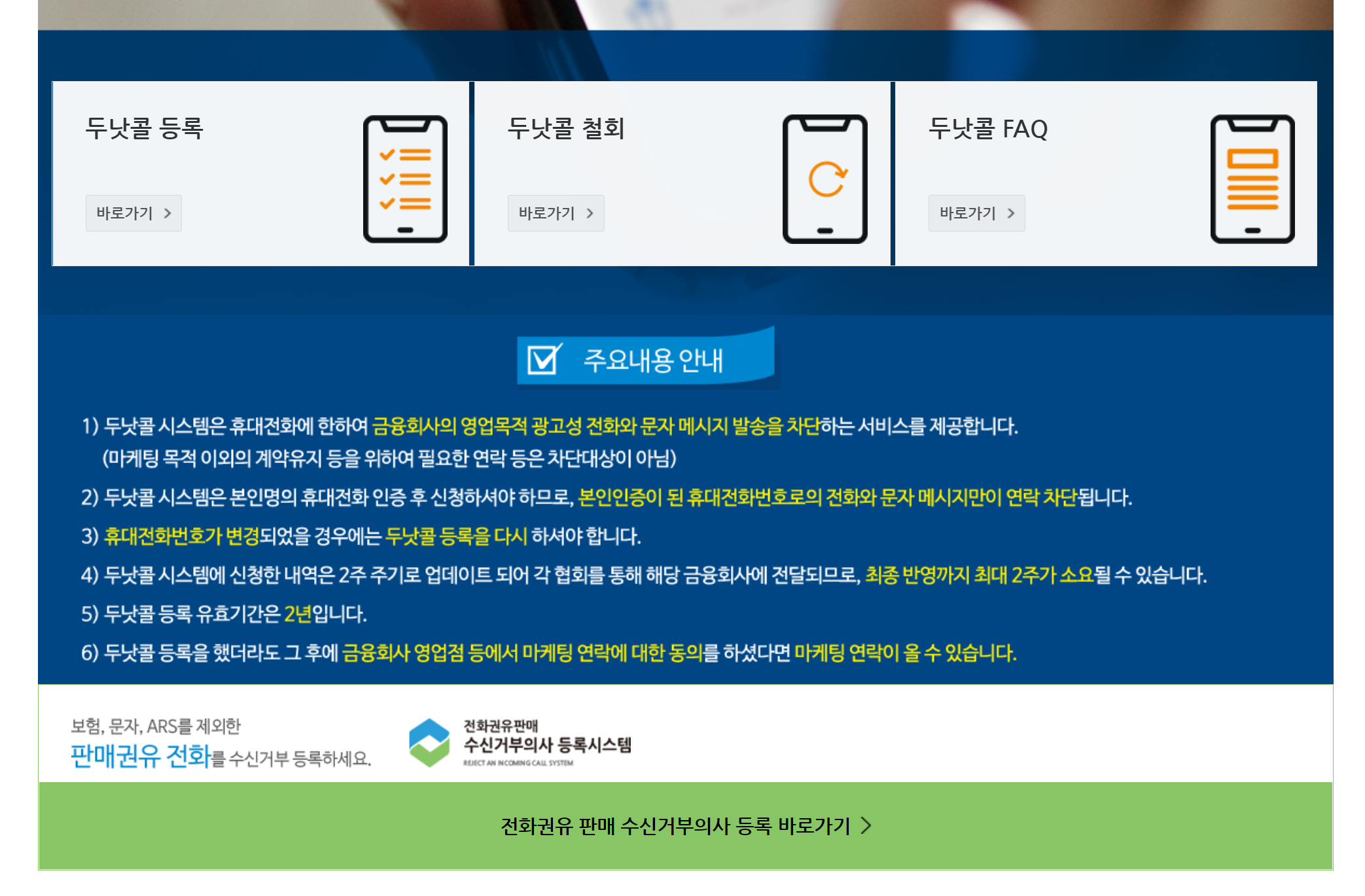 금융감독원과 공정거래위원회는 각각 두낫콜(Do Not Call)을 운영한다. 서비스 등록 시 전화권유판매 사업자가 제공 받은 수신거부 등록자 목록을 토대로 전화 권유 판매 행위를 하지 않는다. 금융감독원은 ‘연락중지청구시스템 Do Not Call’(링크)을 공정관리위원회는 ‘전화권유판매 수신거부의사 등록시스템’을 운영한다.