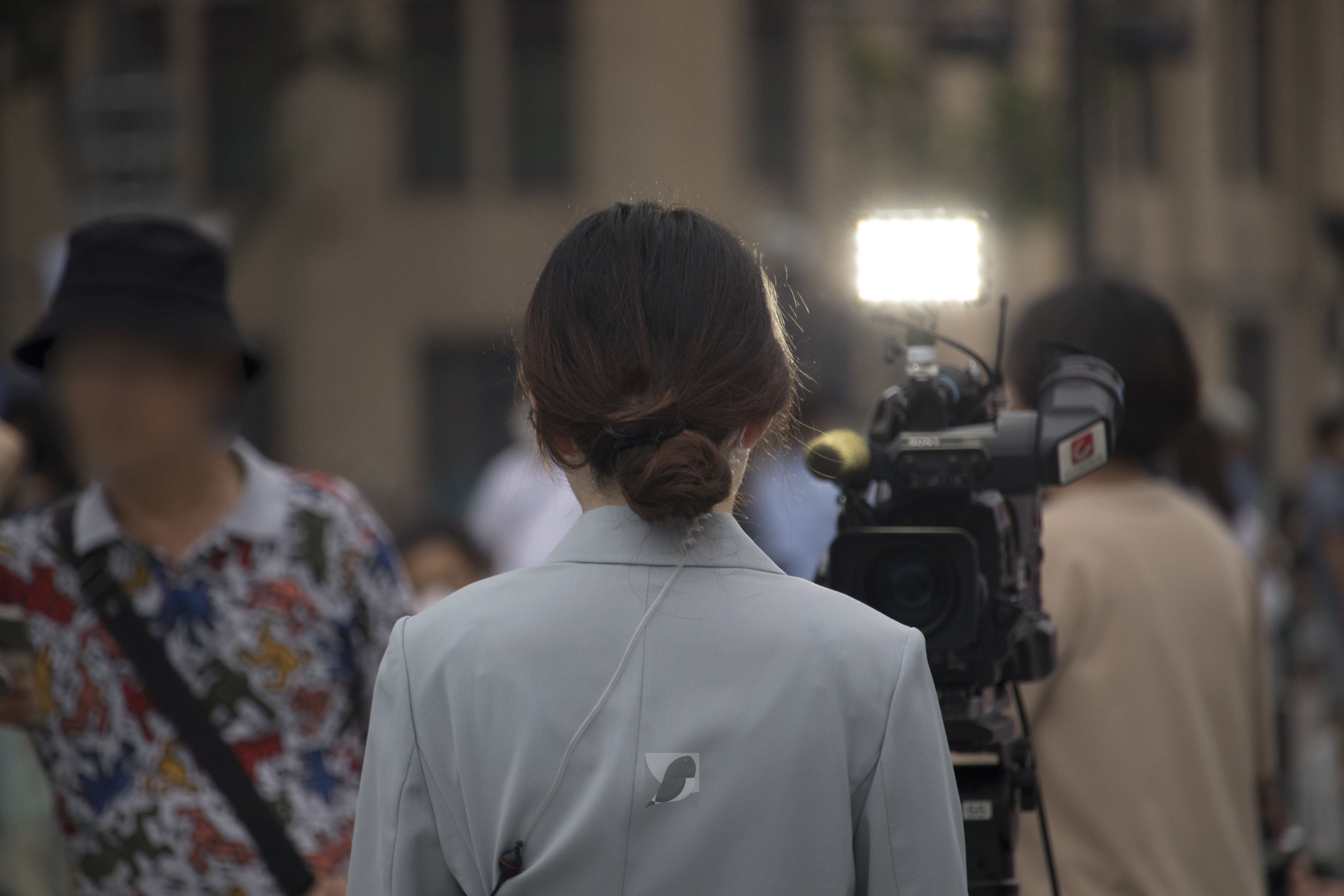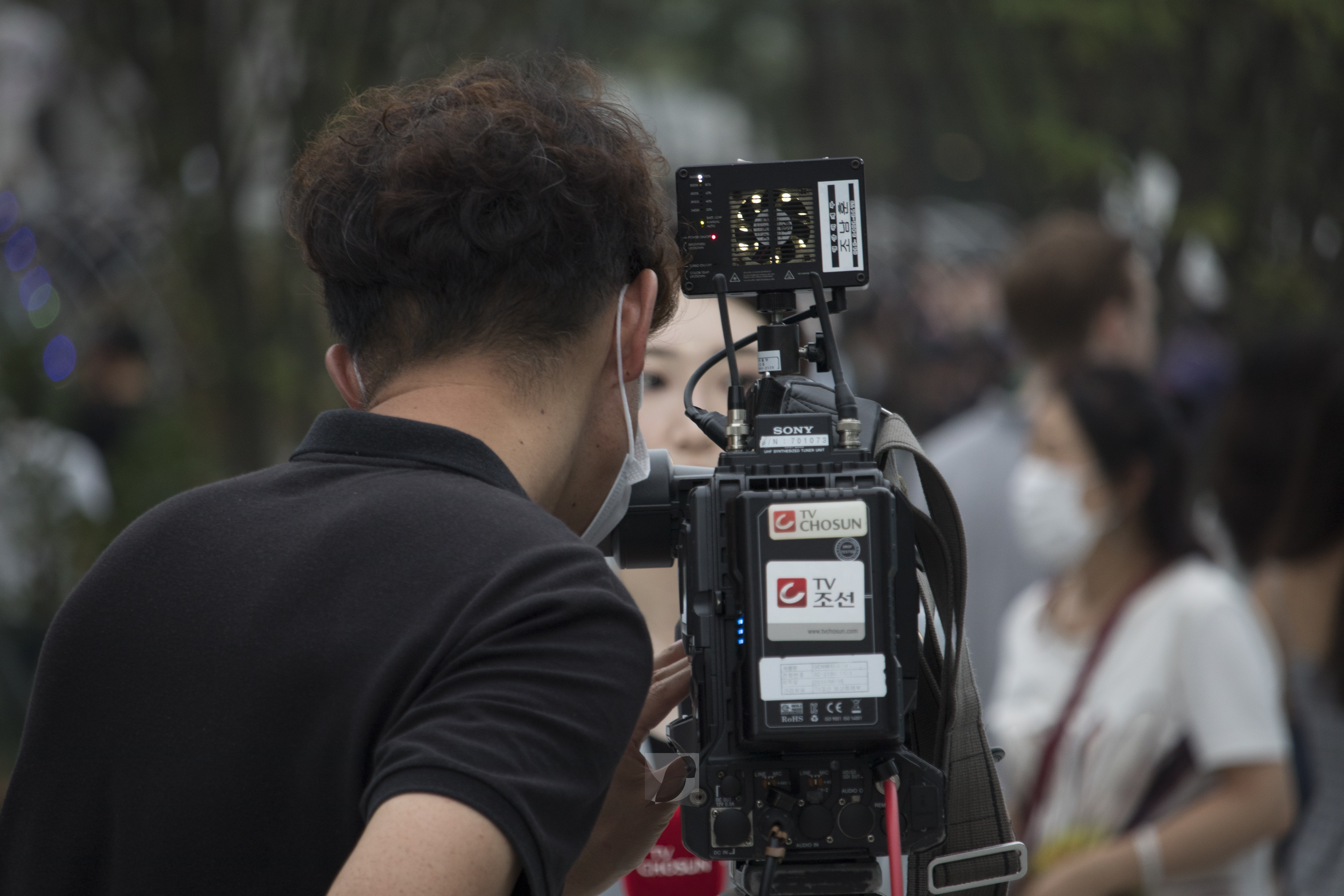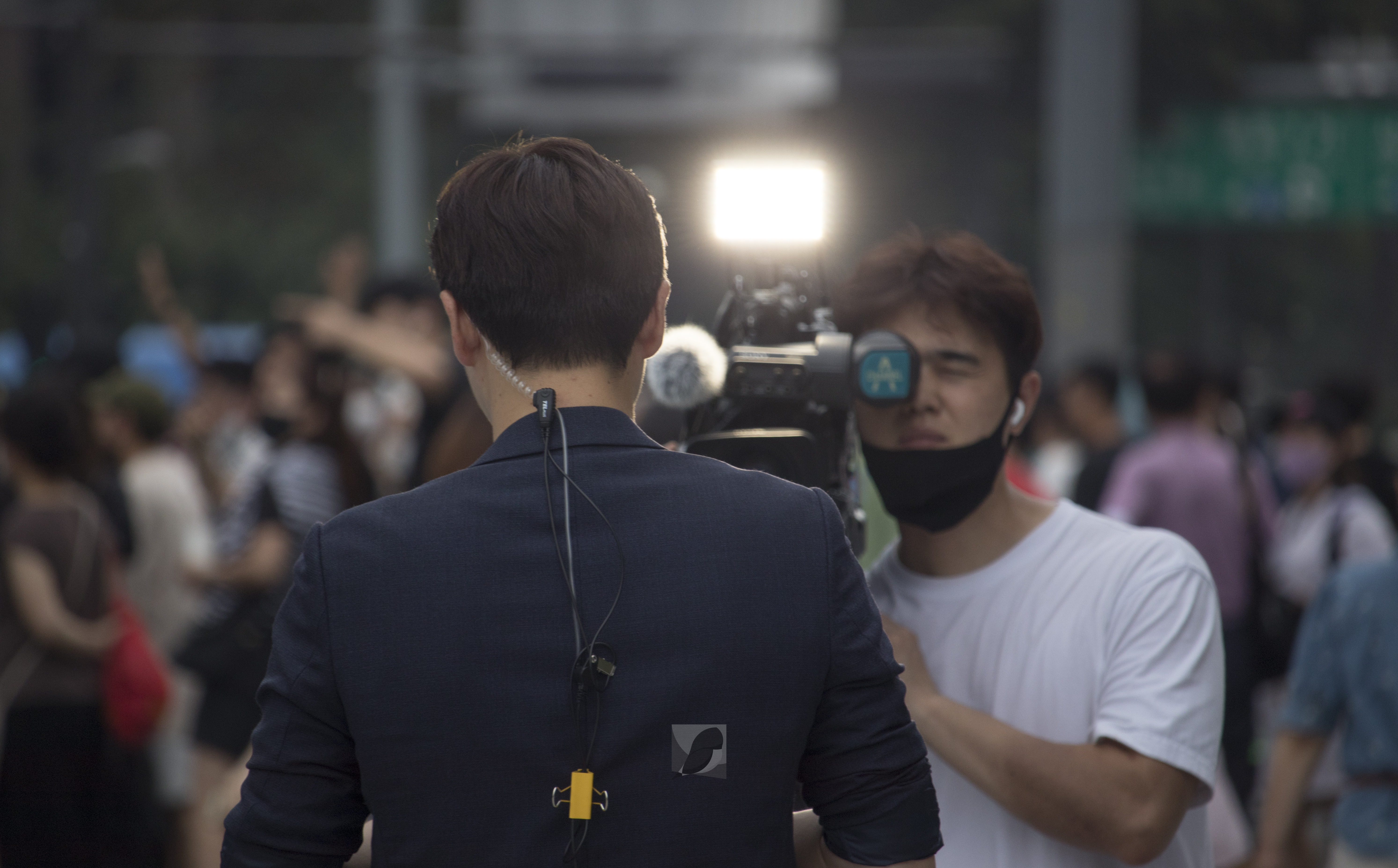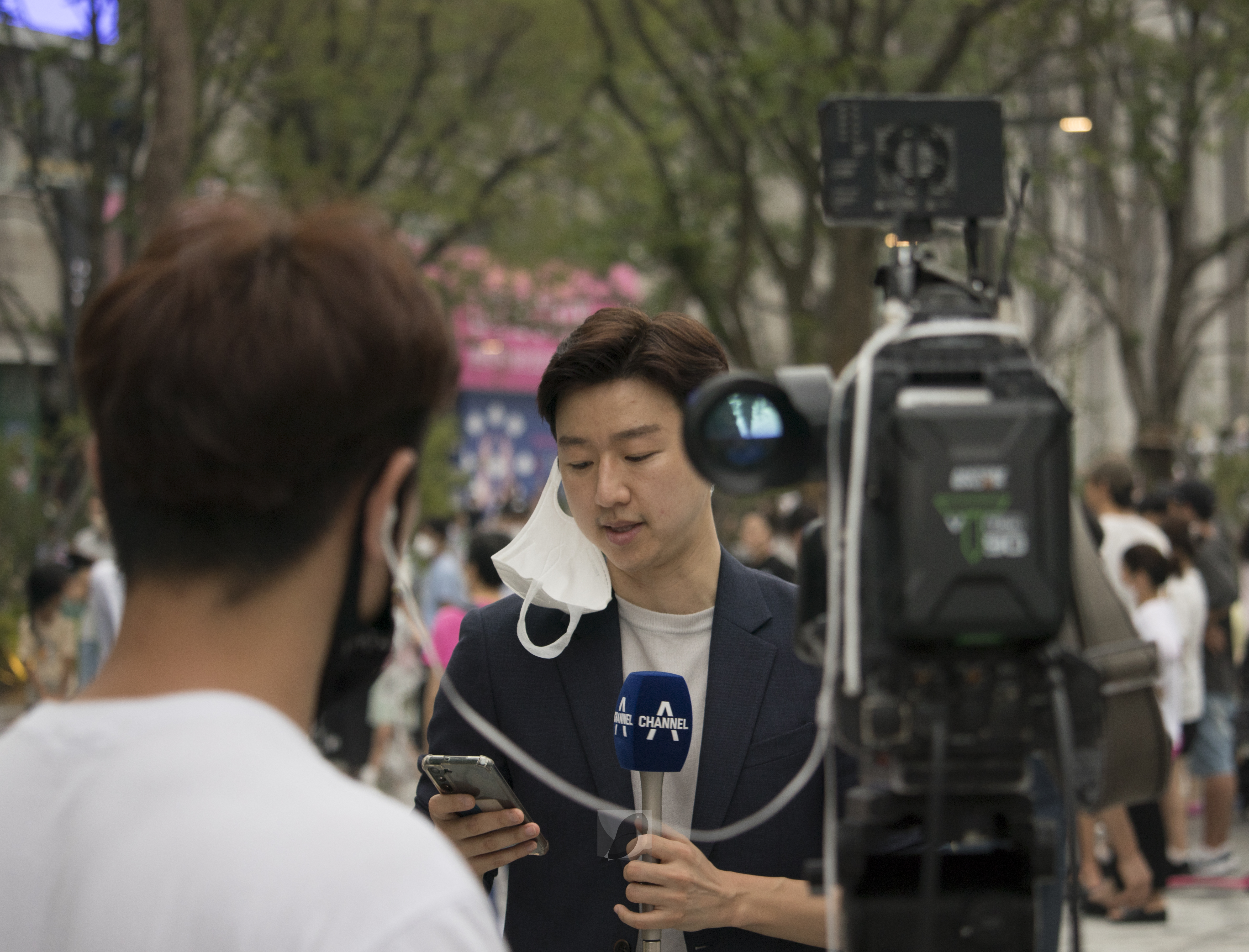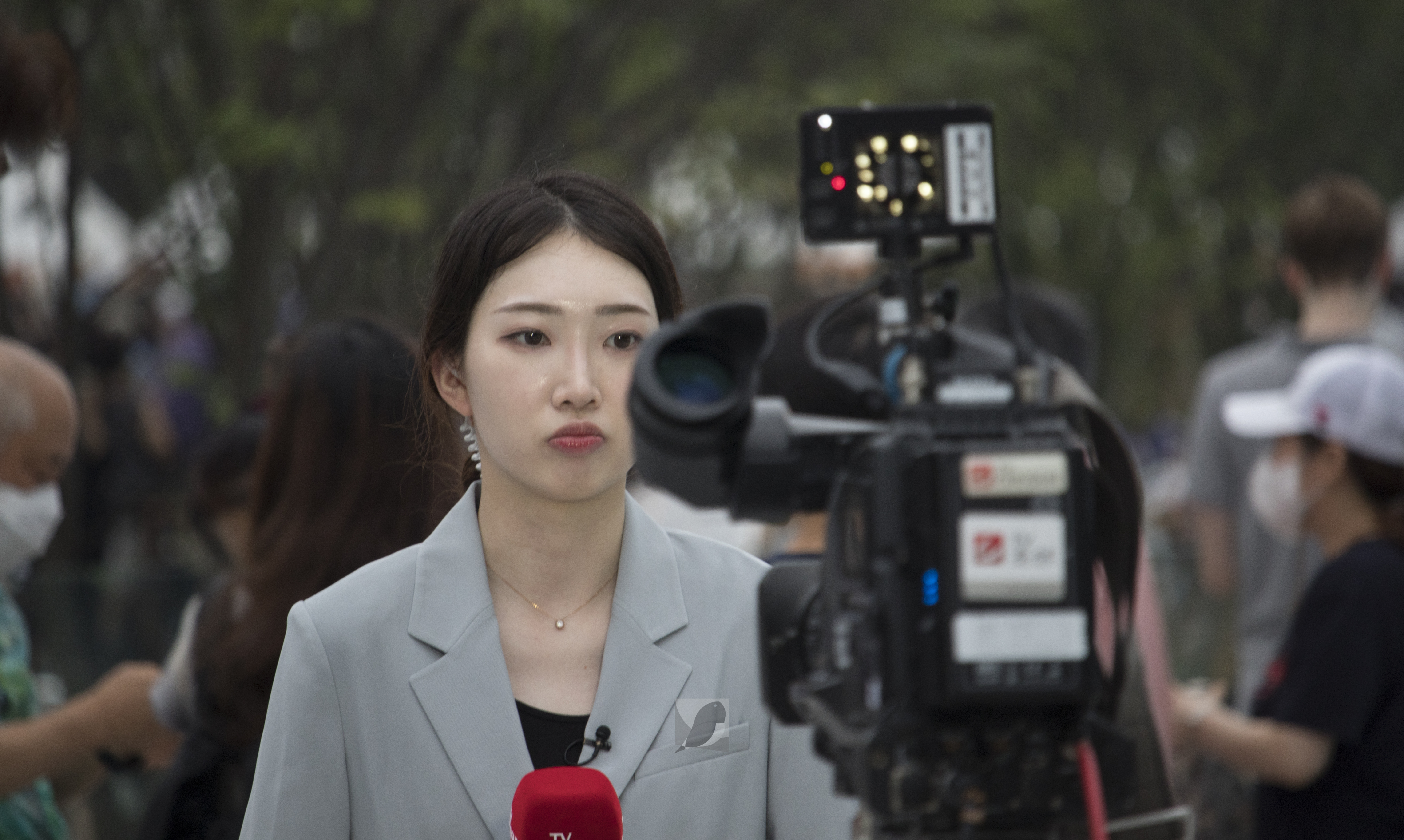 1년 9개월 만에 다시 개장한 광화문 광장에 방송국 기자들이 취재 중이다.(2022.08.06)