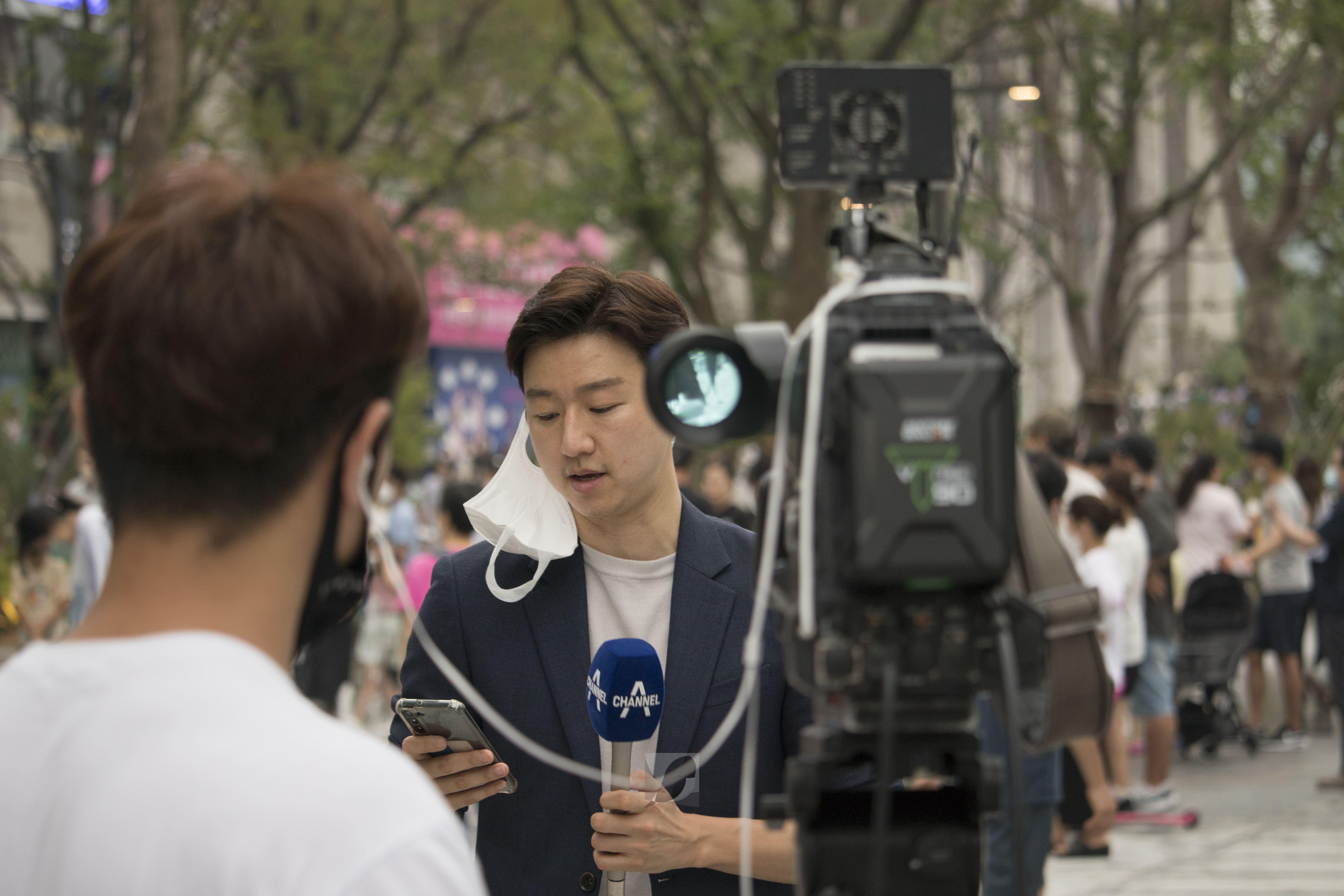 1년 9개월 만에 다시 개장한 광화문 광장에 방송국 기자들이 취재 중이다.(2022.08.06)